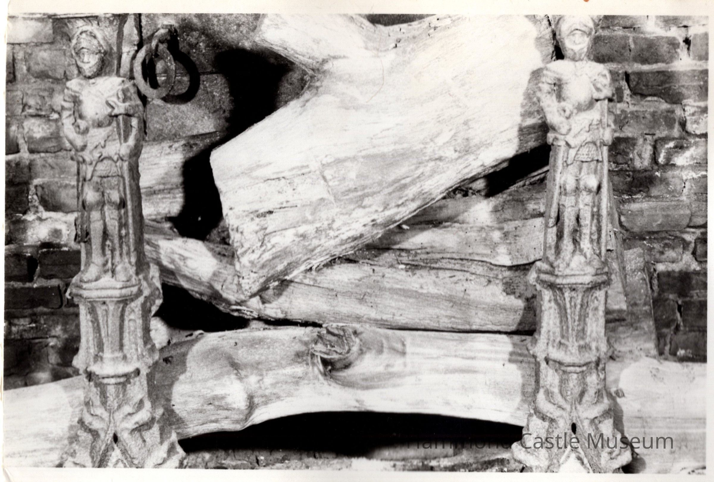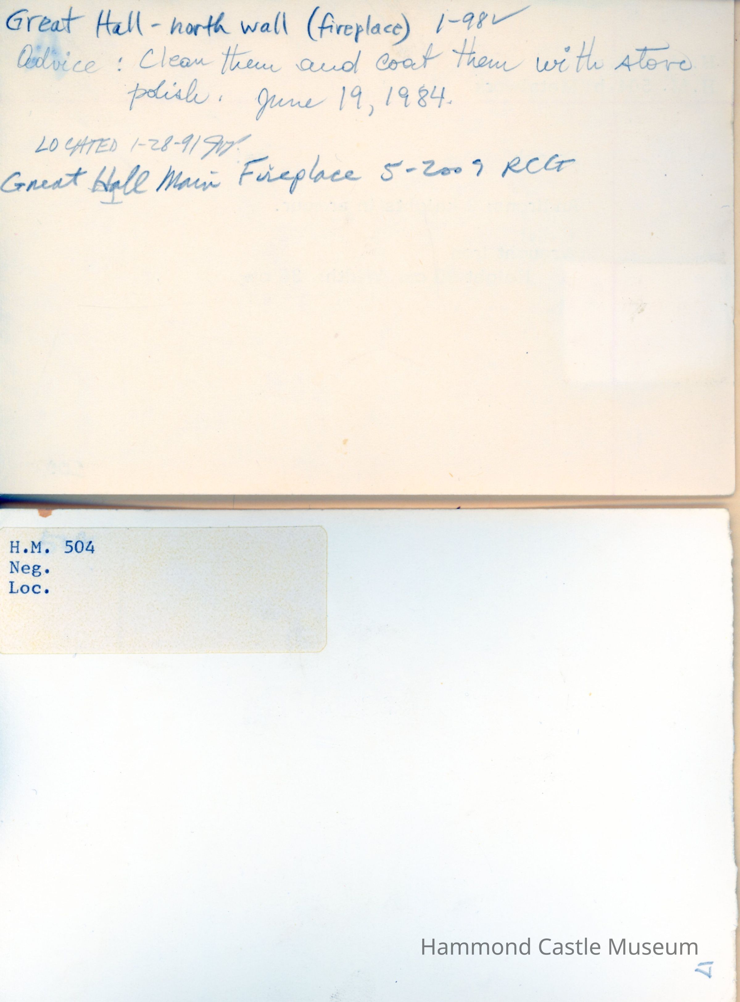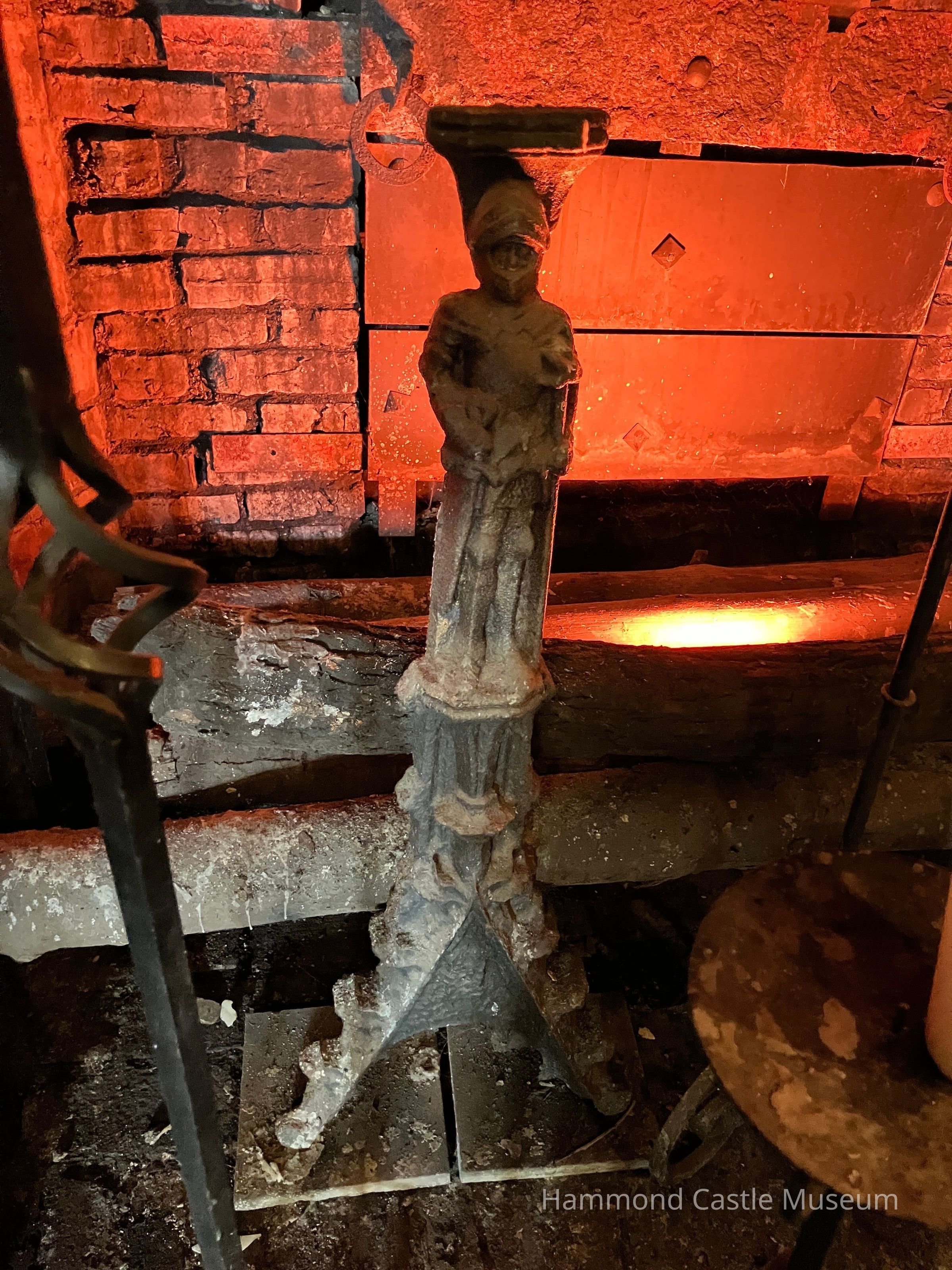 15th c. French Andirons of Knights in Great Hall fireplace Set of 2. Shaped like 2 knights in armor.