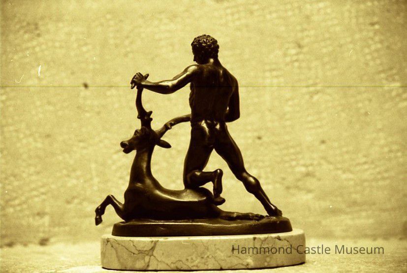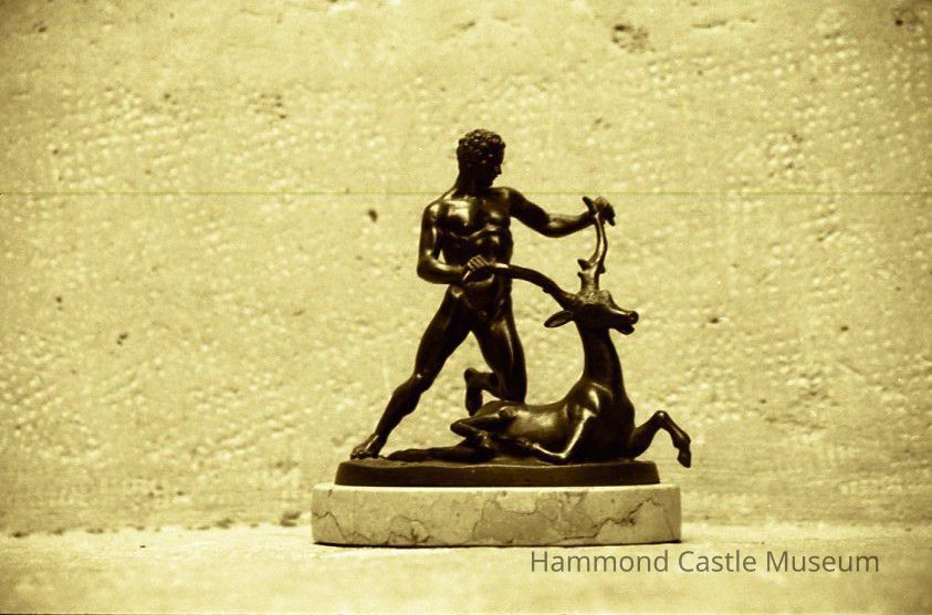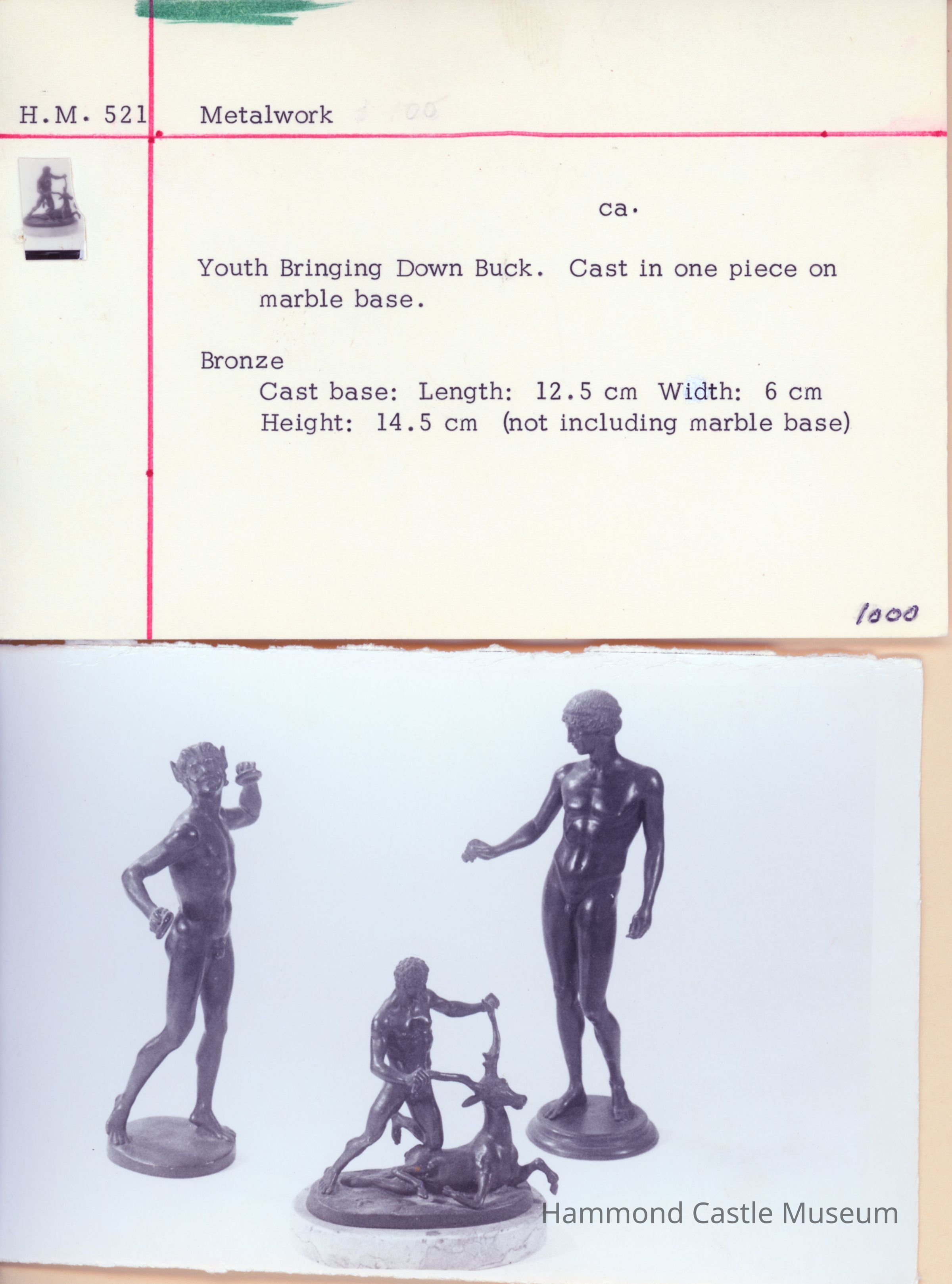 Bronze statuette of a "Youth Bringing Down a Buck." Cast in one piece on marble base.