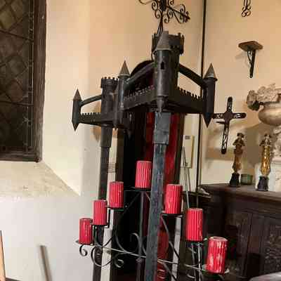 Set of 3 torchières floor candle holders; miniature castle and moat design around top, Maltese cross as base.