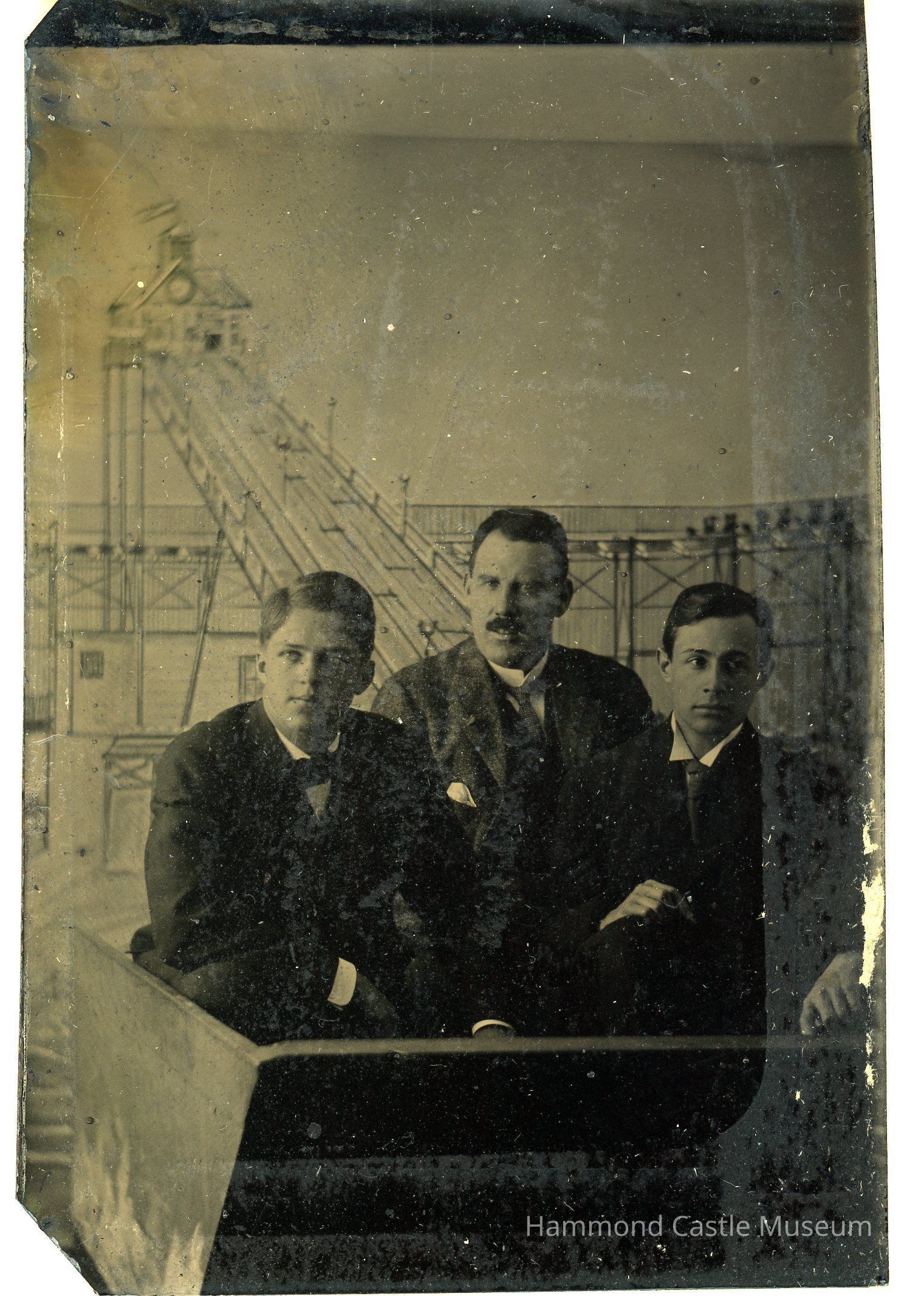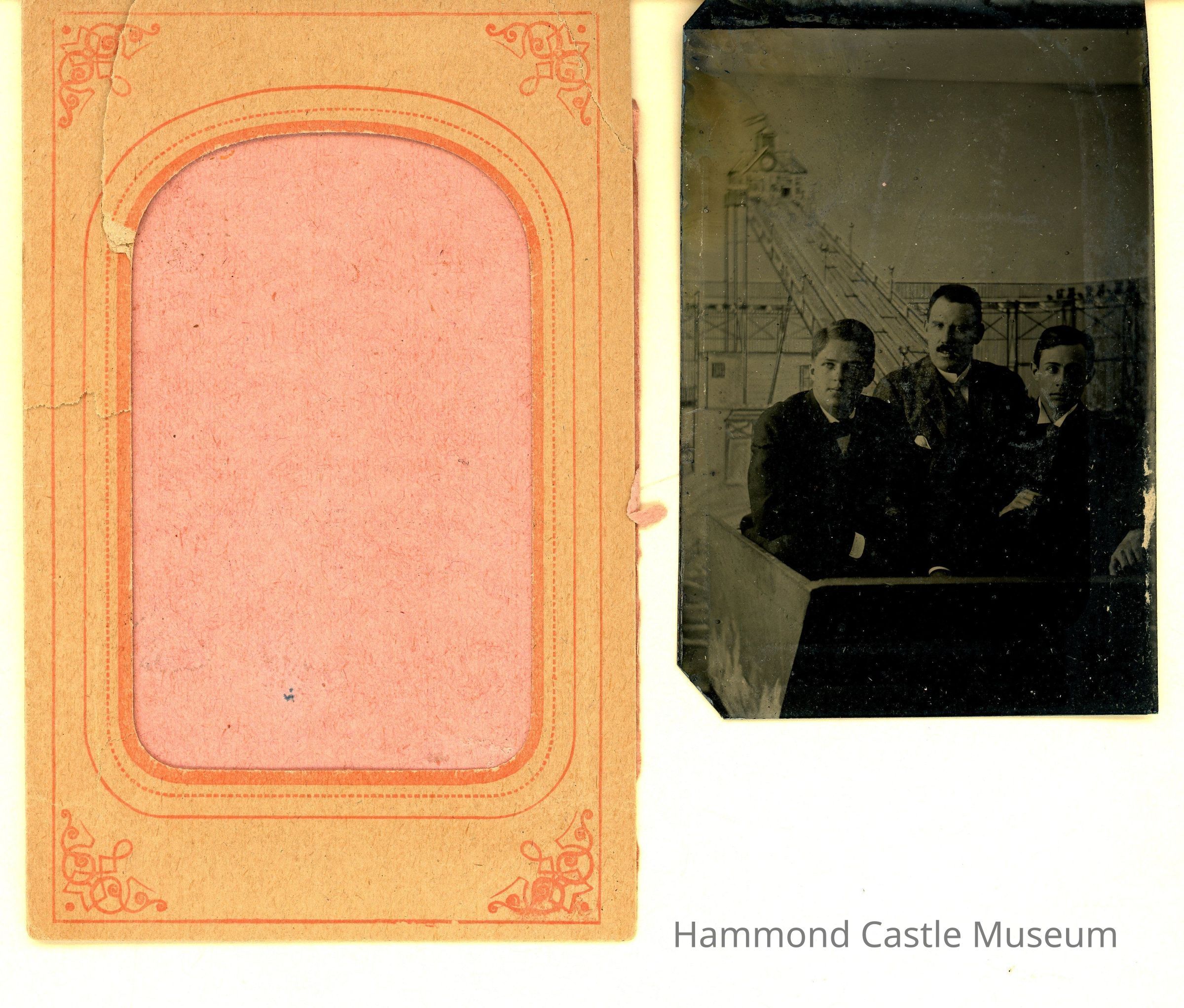Photo with sleeve of John Hays Hammond (Sr) on the right in mining cart with Sorio and unknown man