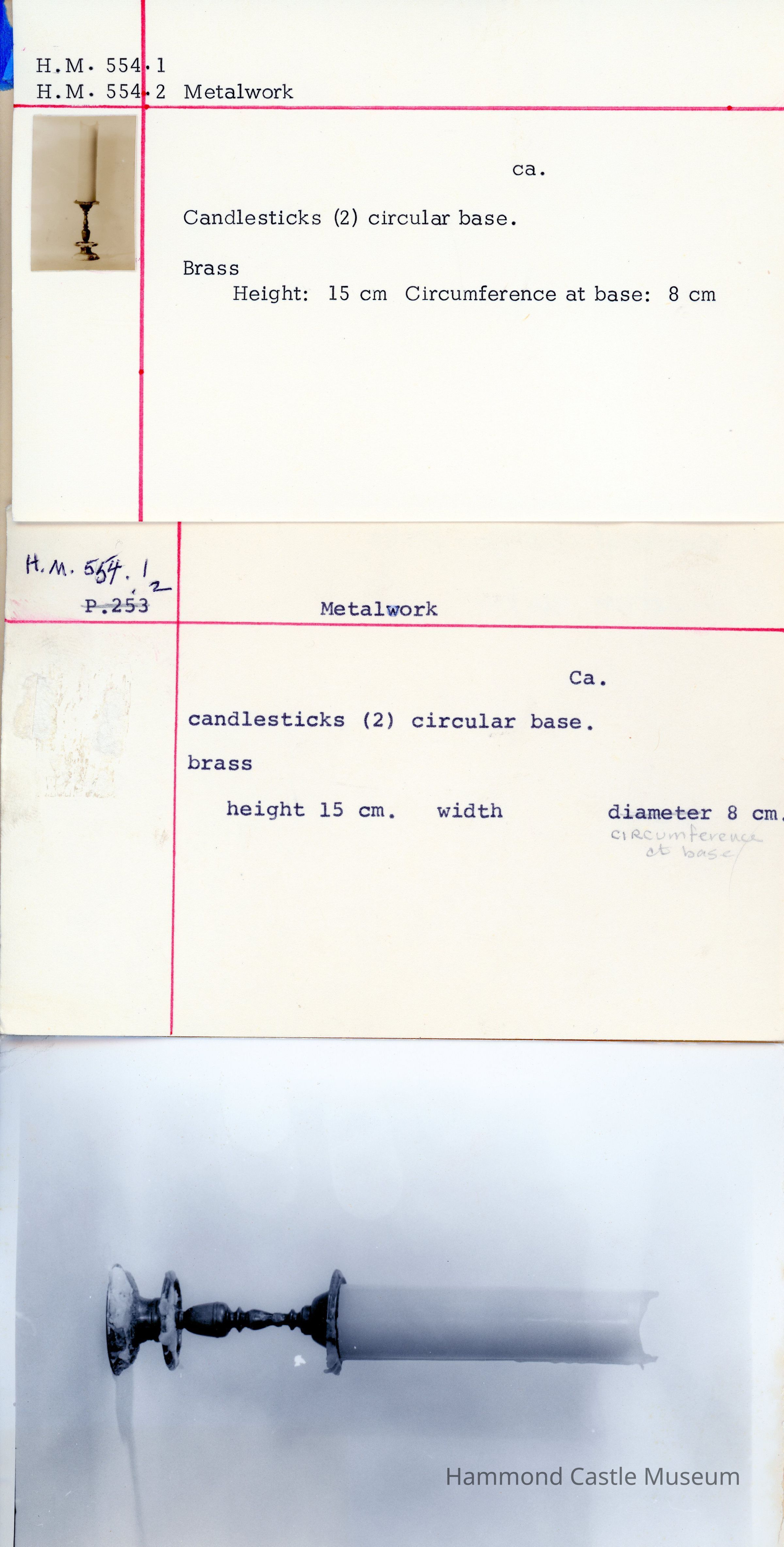 First of a set of 2 candlesticks; circular base, brass. Appears to have been repaired around stem of candlestick with another type of metal. Cup of candlestick is off center, unsure if this is due to repairs or original.