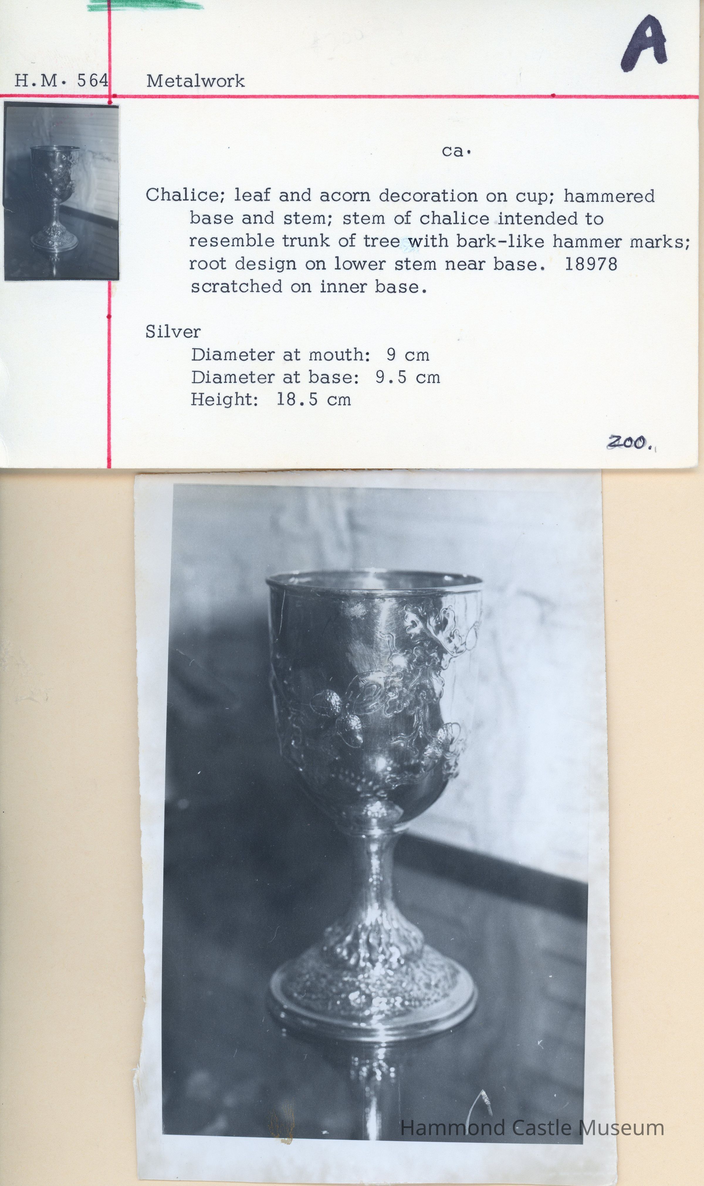 Chalice; leaf and acorn decoration on cup; hammered base and stem; stem of chalice intended to resemble trunk of tree with bark-like hammer marks; root design on lower stem near base. "18978" scratched on inner base.