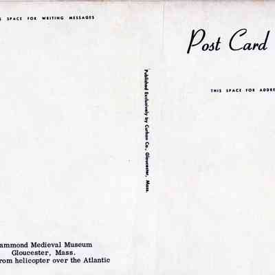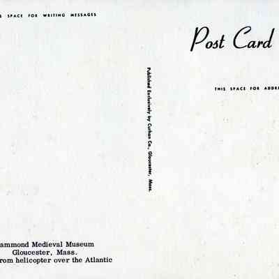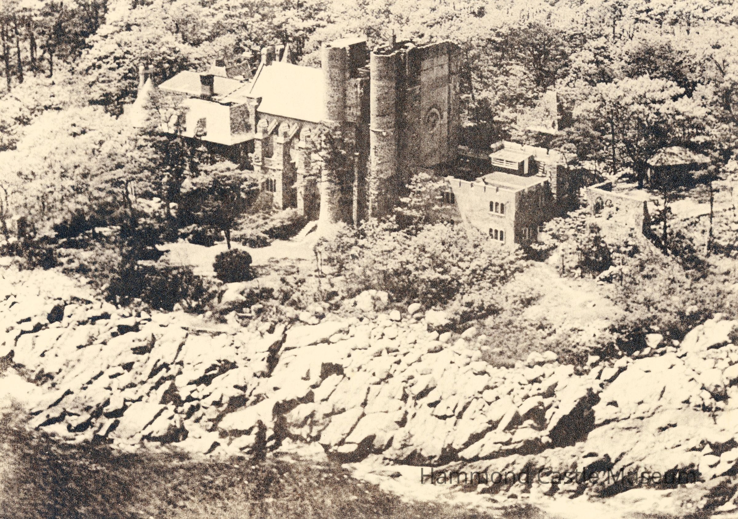 Sepia postcard of early aerial view of castle showing garage and pre-formal garden 2 copies: PCB-005, 006