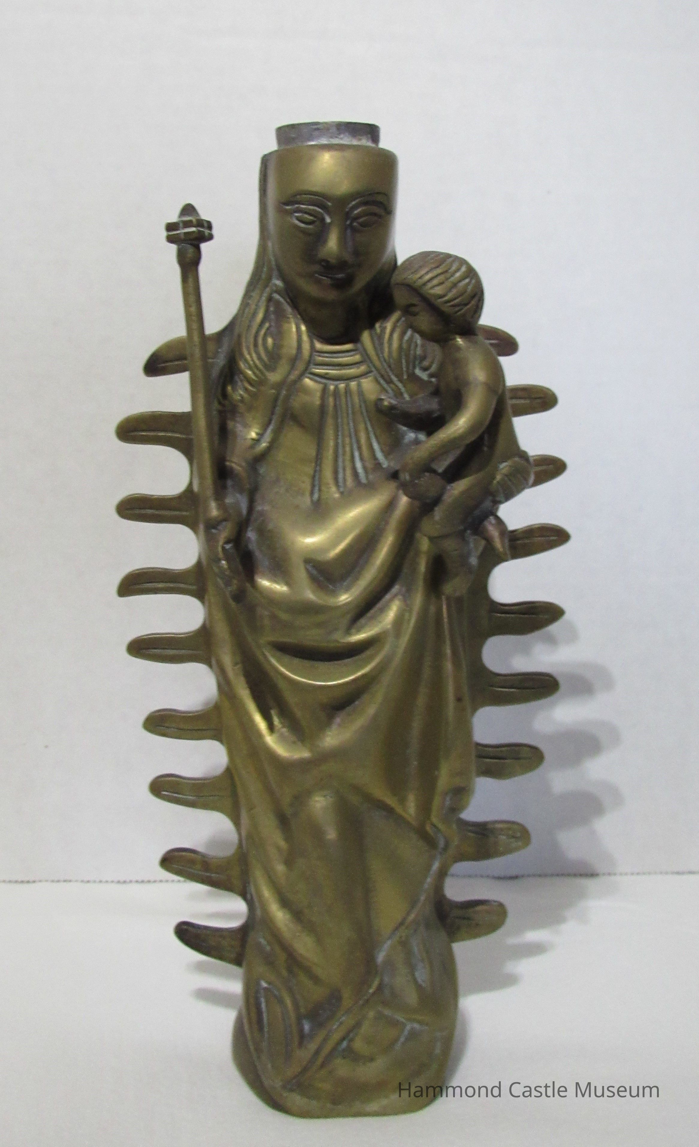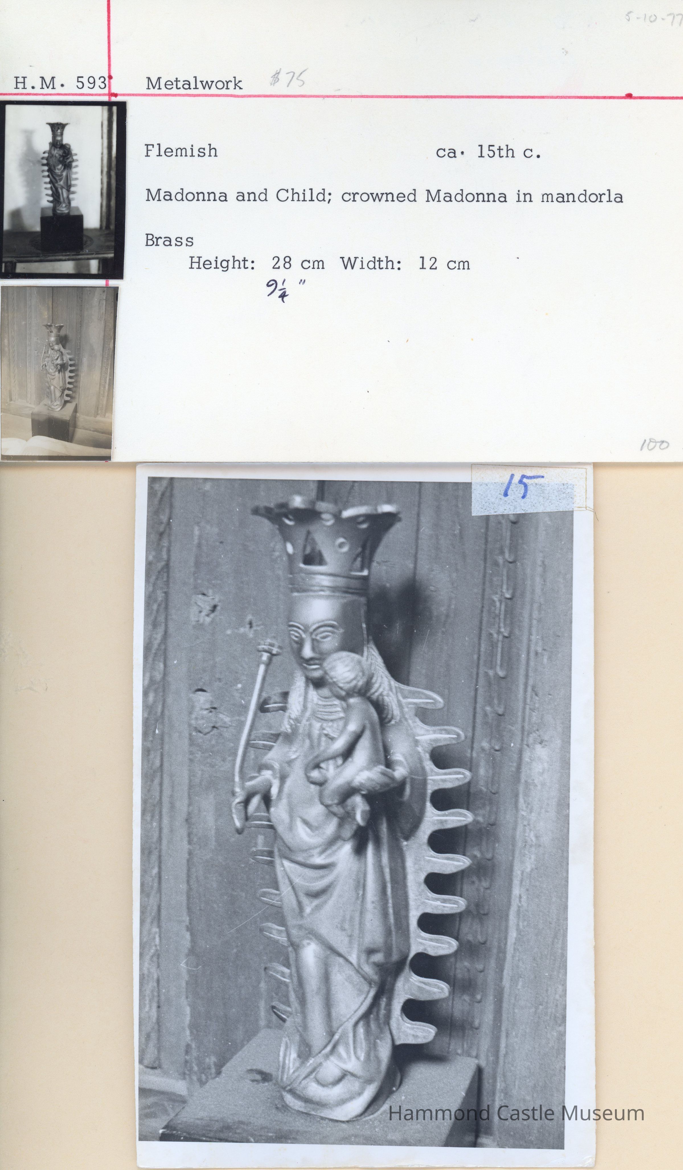 brass Flemish Madonna and Child; crowned Madonna in mandorla.