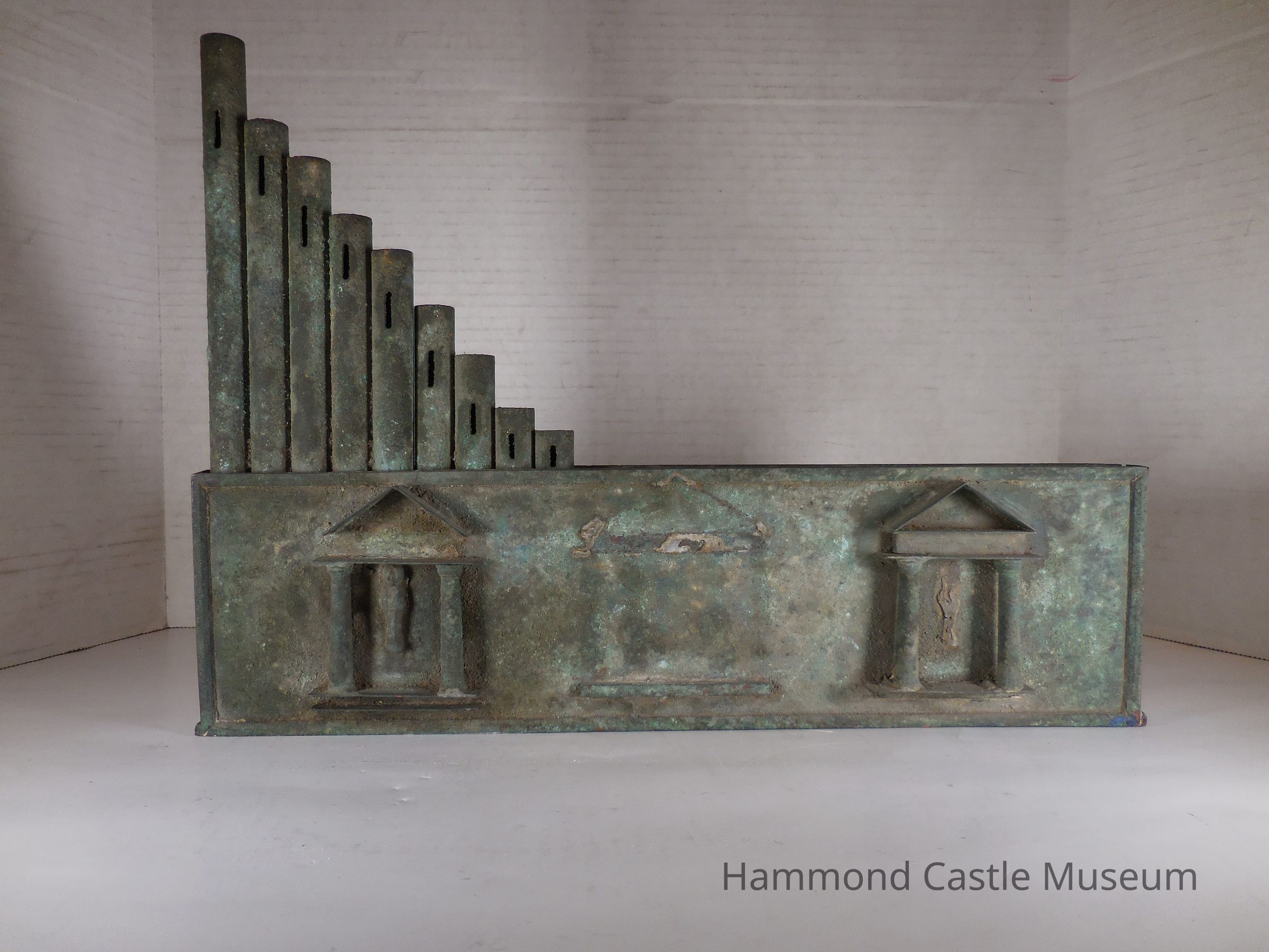Decorative ornament: rectangular box with raised edges. On the front are three soldered sheet-bronze classical facades: on each side a pediment is supported by two Doric columns. Between the columns is a mummy-like human figure (one is missing). Center facade has a pediment supported by four Doric columns, figure is missing. On left side, two sets (of four each) of graduated "pipes" fit into the box--each "pipe" has a short slit near the top, but does not produce a sound. Solder joining "pipes" to box has been broken.