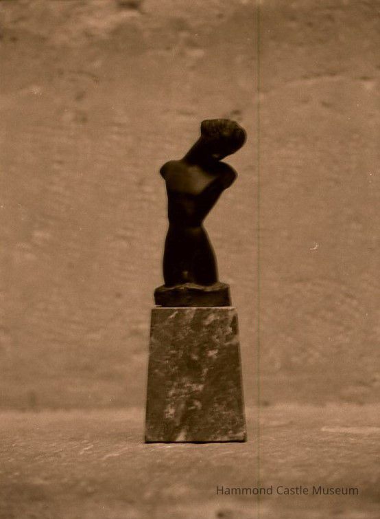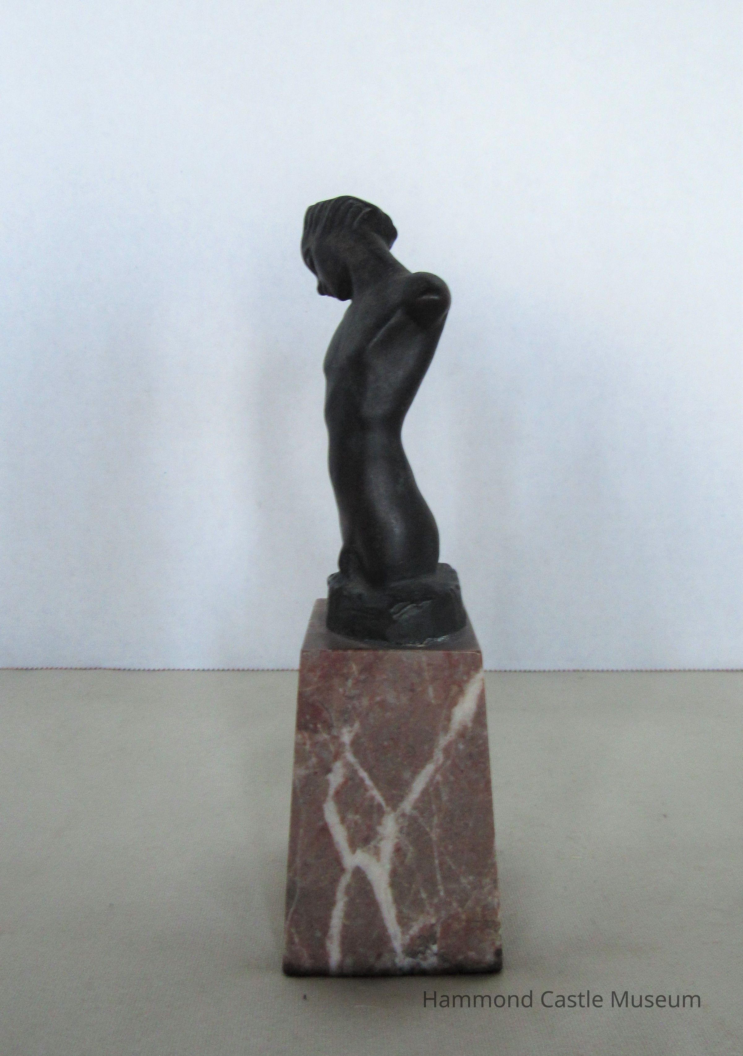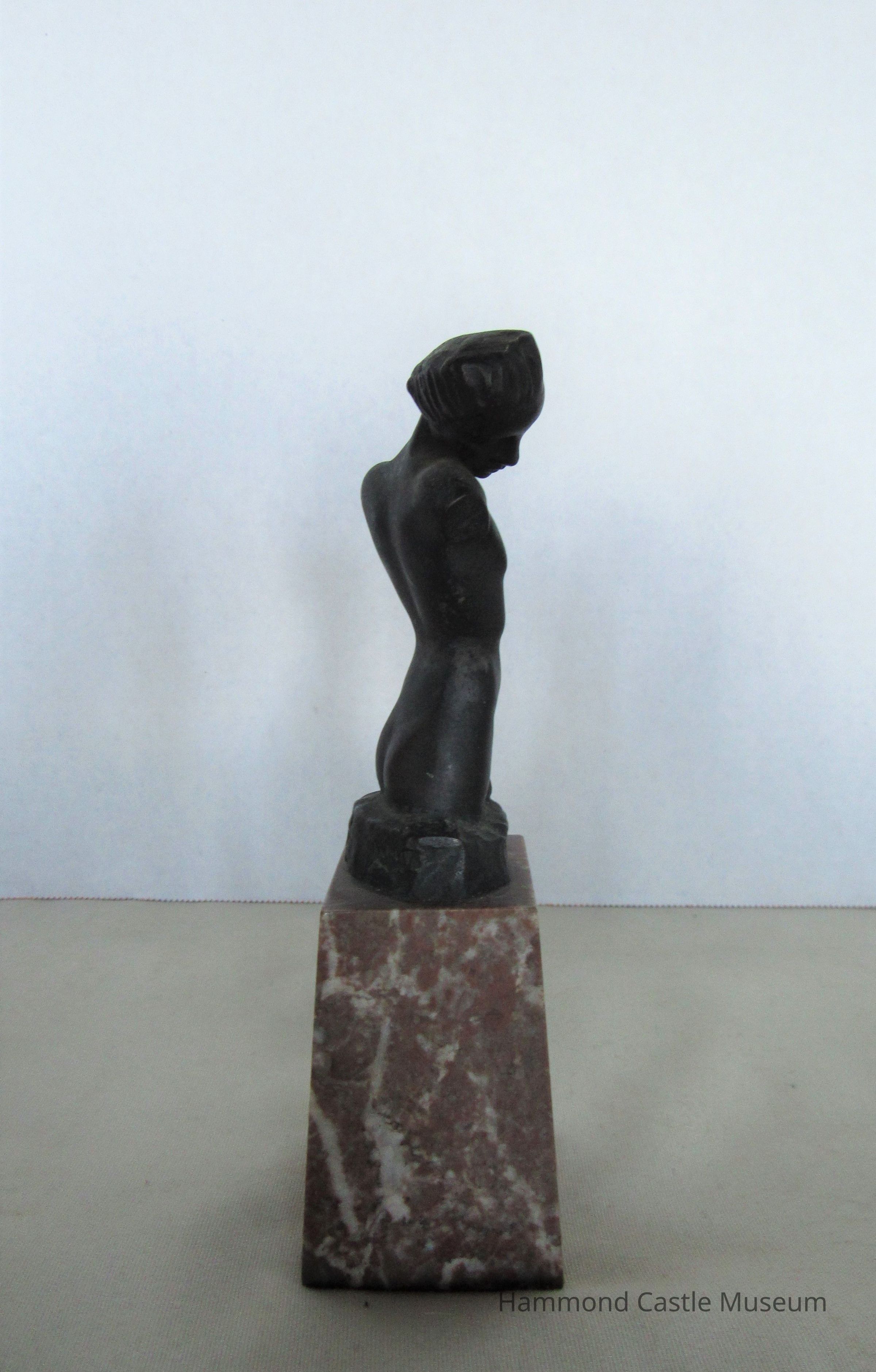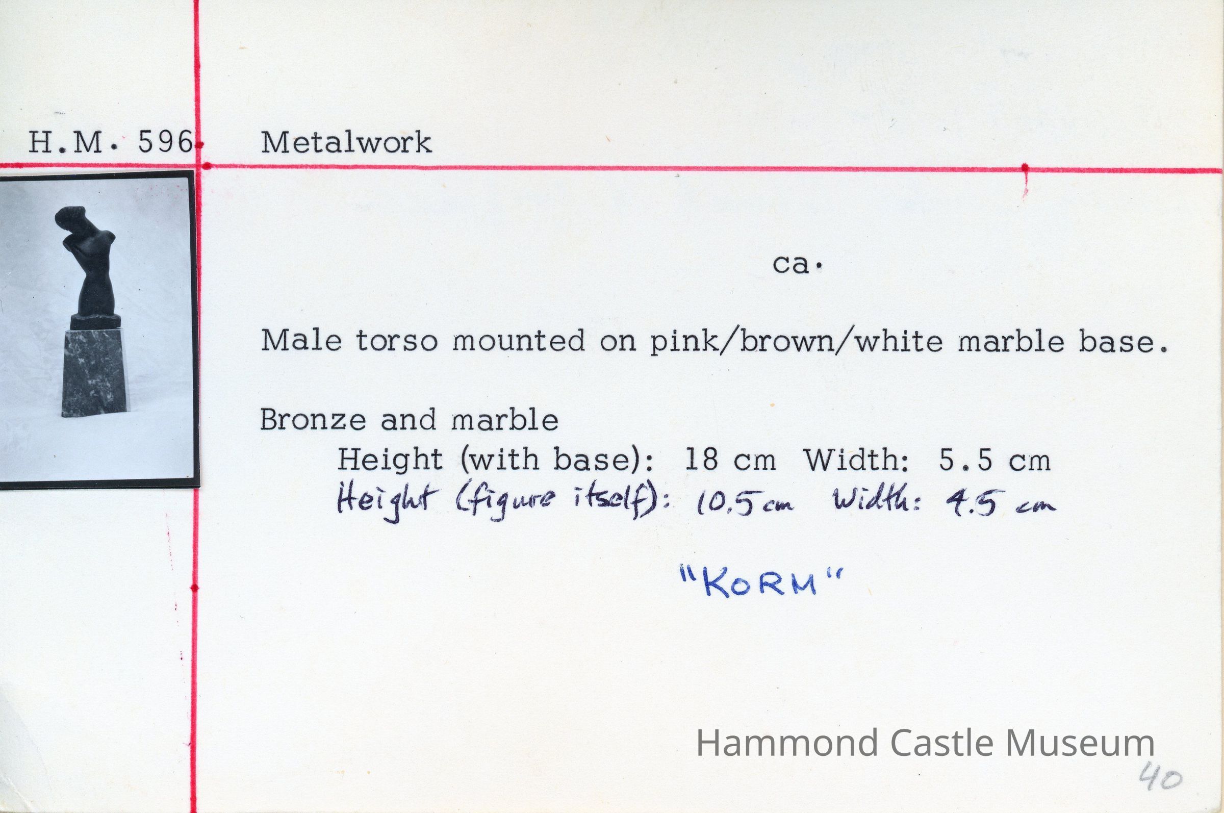 Male torso mounted on pink/brown/white marble base. Titled "Korm".Collection