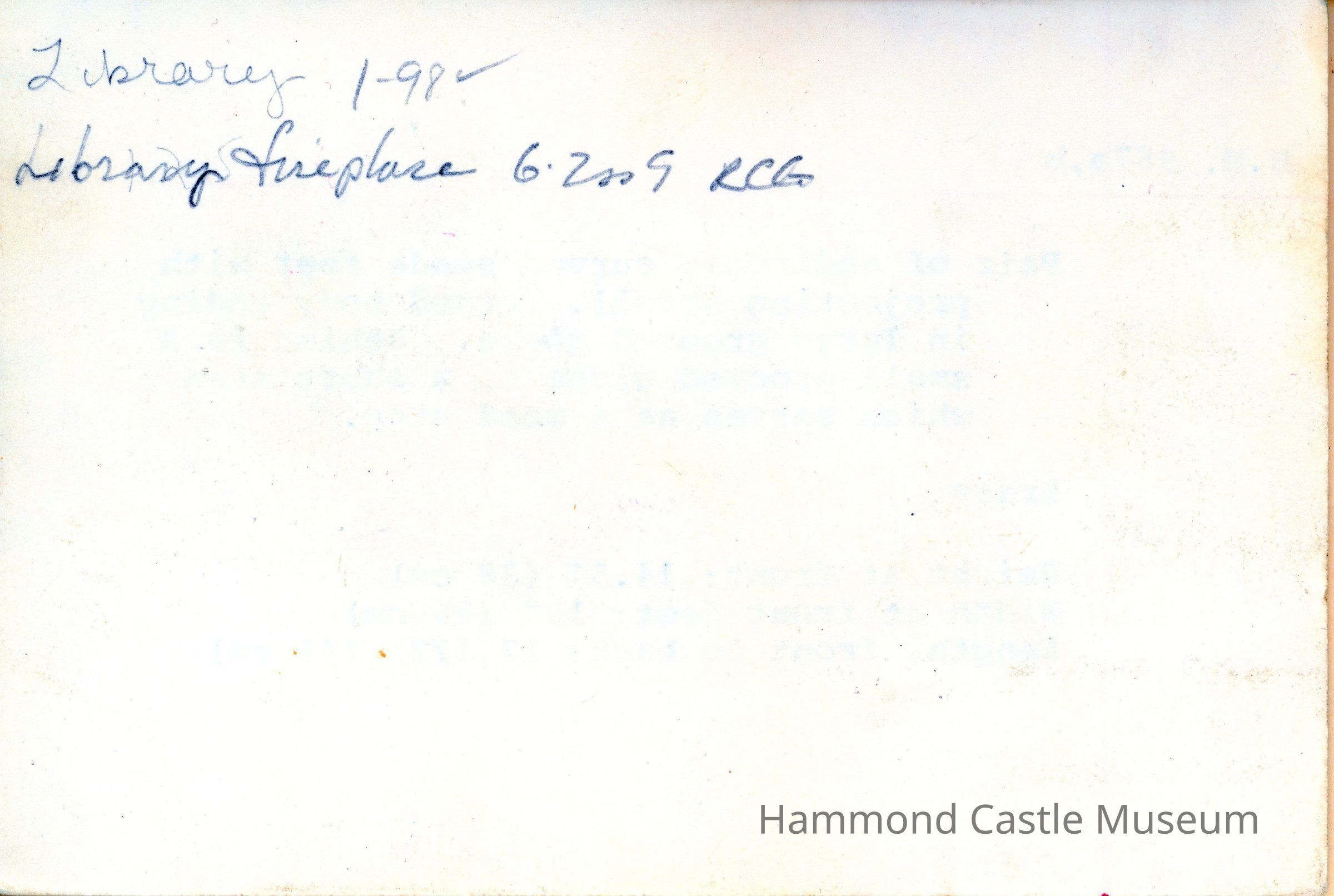 Pair of andirons: curved "hoof" feet with projecting scroll. Turned body ending in large grooved globe. Behind is a small grooved globe on a short stem which serves as a wood stop.