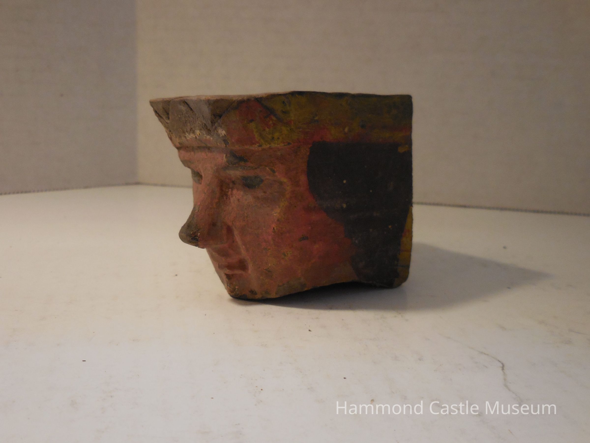 Carved small wooden head painted a red color with black accents and open eyes. Large mounting hole drilled from top to bottom, has a completely flat top and back.