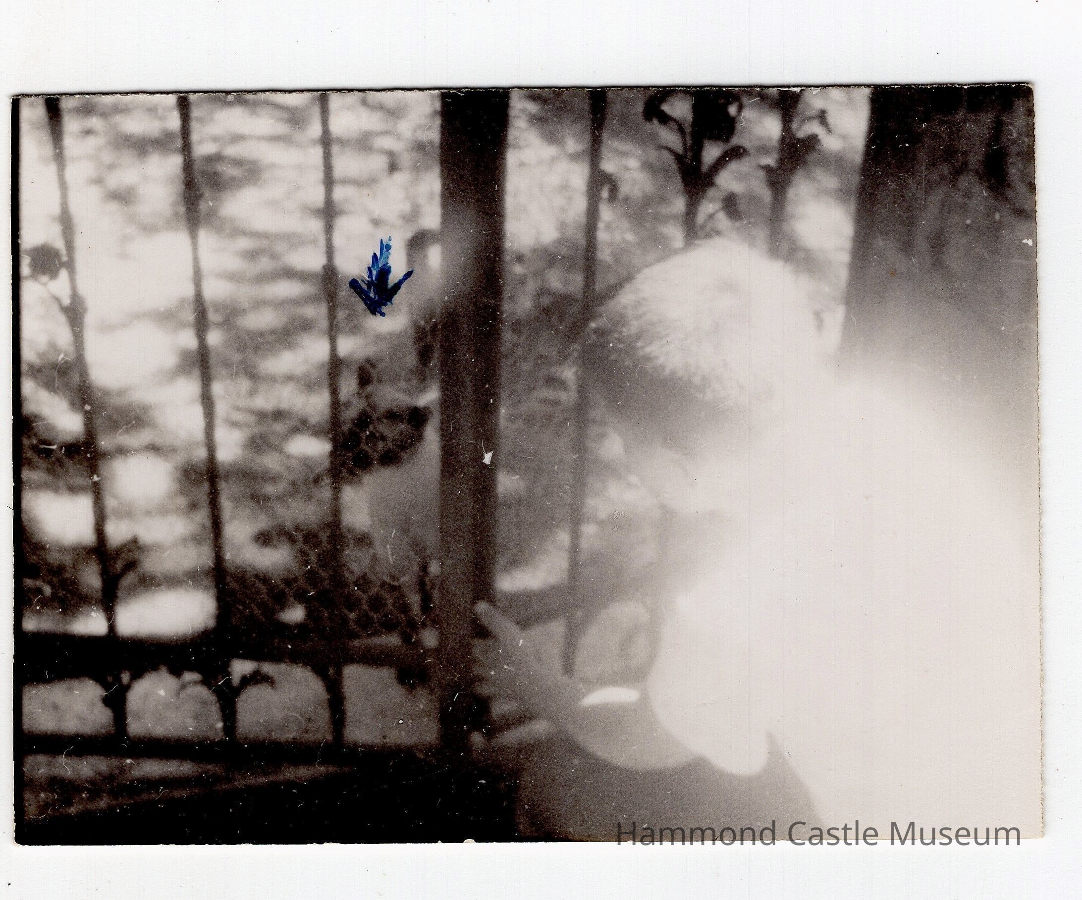 Photo taken 1954-07-16 of Siamese cat & child at cat garden gate