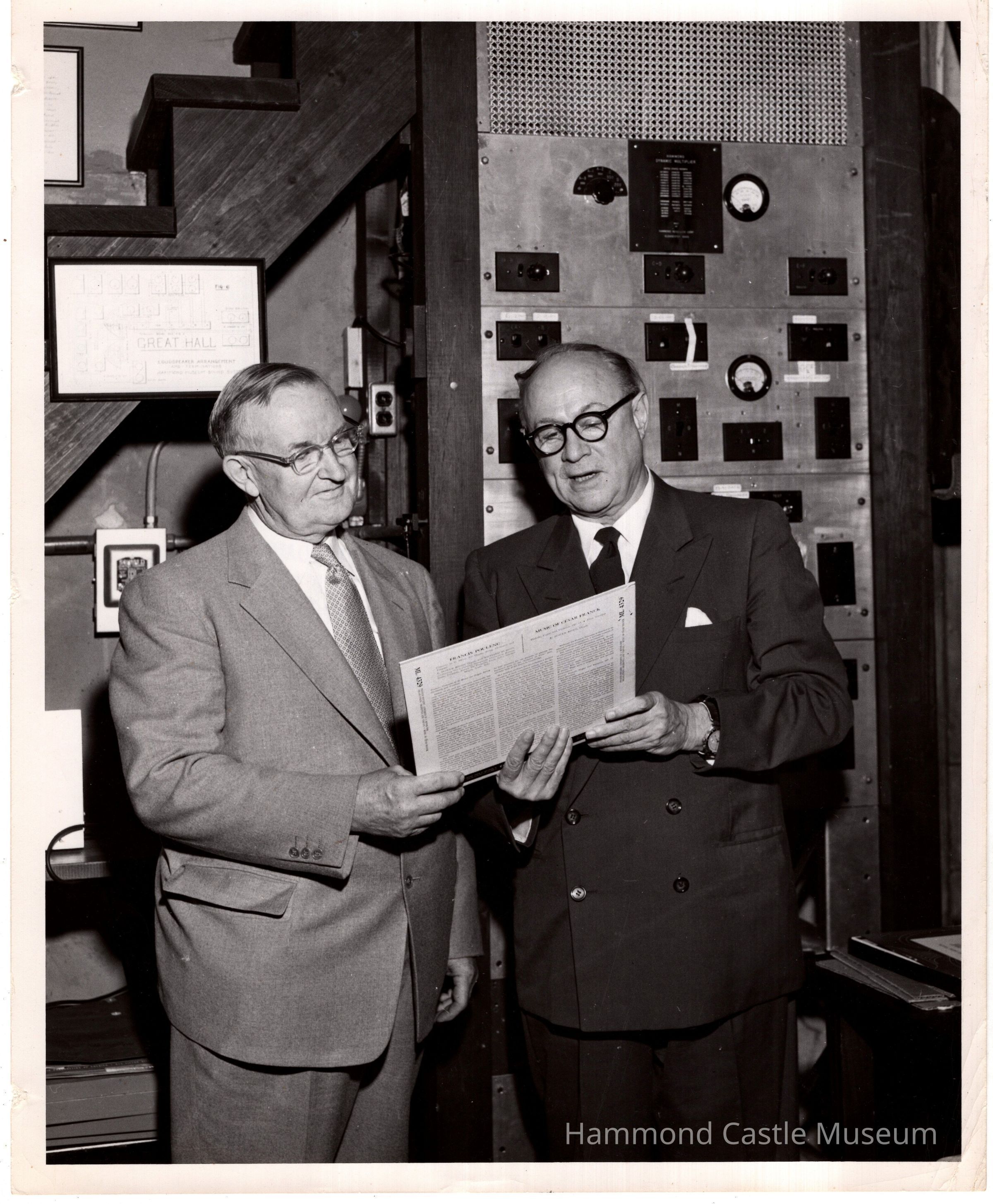 2 copies of photo of Ellison Purington & Hammond with Dynamic Amplifier in organ loft stairway Christian Science Publishing Society image