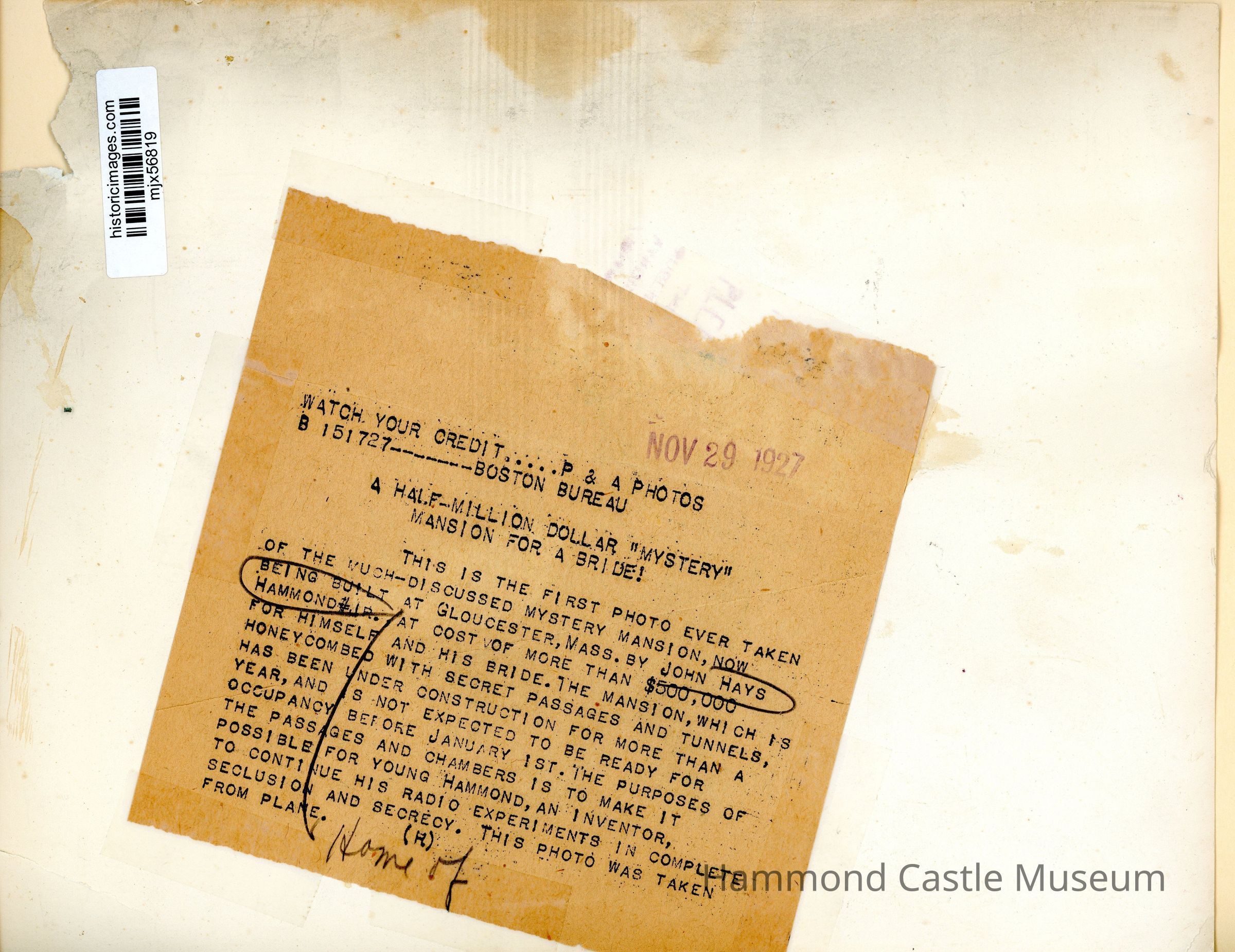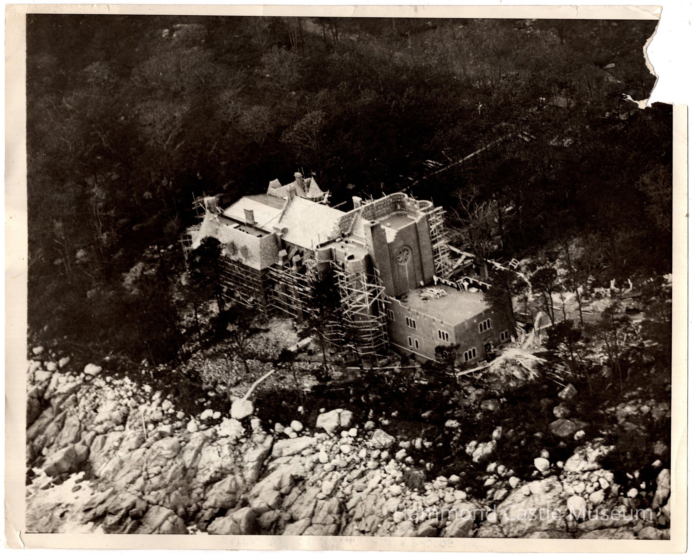 This is the first photo ever taken of the much-discussed mystery mansion, now being built at Gloucester, Mass. by John Hays Hammond Jr. at cost of more than $500,000 for himself and his bride. The mansion, which is honeycombed with secret passages and tunnels, has been under construction for more than a year, and is not expected to be ready for occupancy before January 1st. The purposes of the passages and chambers is to make it possible for young Hammond, an inventor, to continue his radio experiments in complete seclusion and secrecy. This photo was taken from plane."