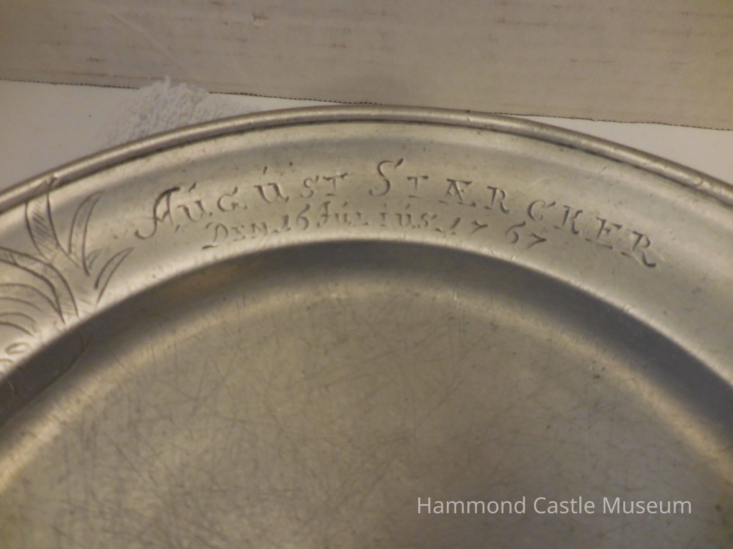 18th c. Pewter F. C. Weimer Charger - Plate Incised on rim: "Friedrich Carl Weimar", with primitive device, two lions with a sword. On border: "August Starcker Den 16 Julis 1767". Markings: see catalogue card. German, circa 18th century