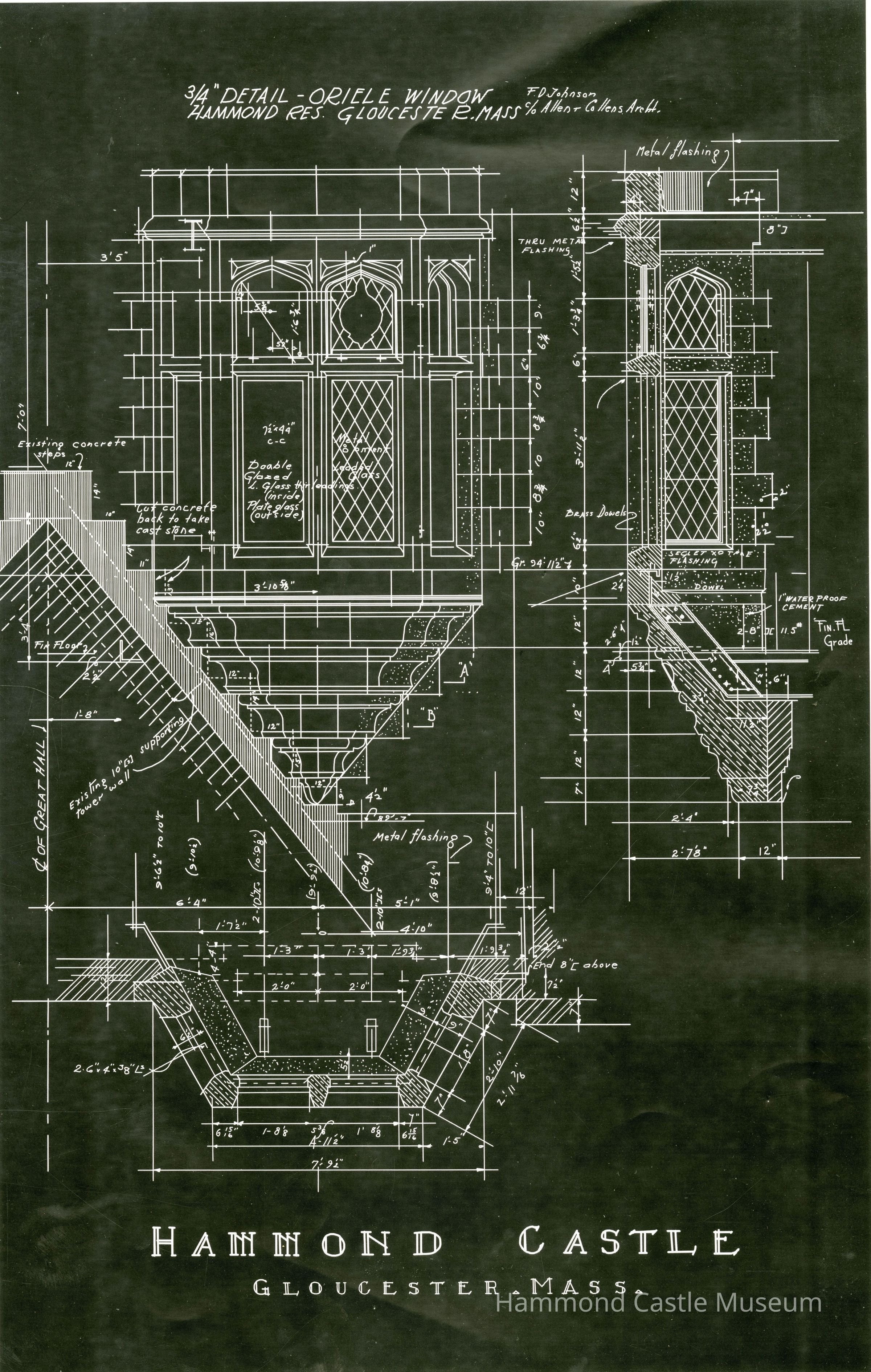 Poster with Allen & Collens plans for oriel window exterior elevation