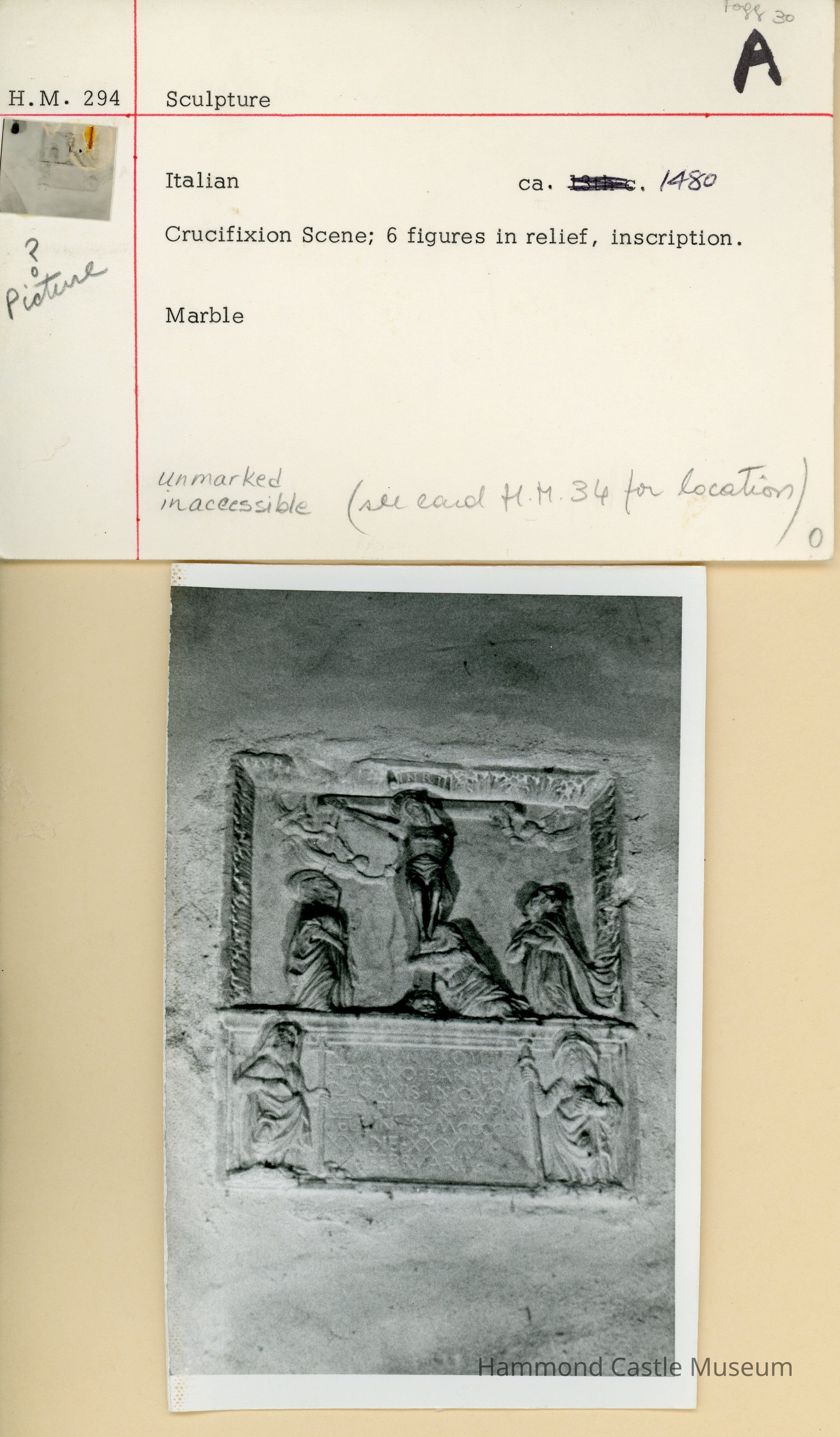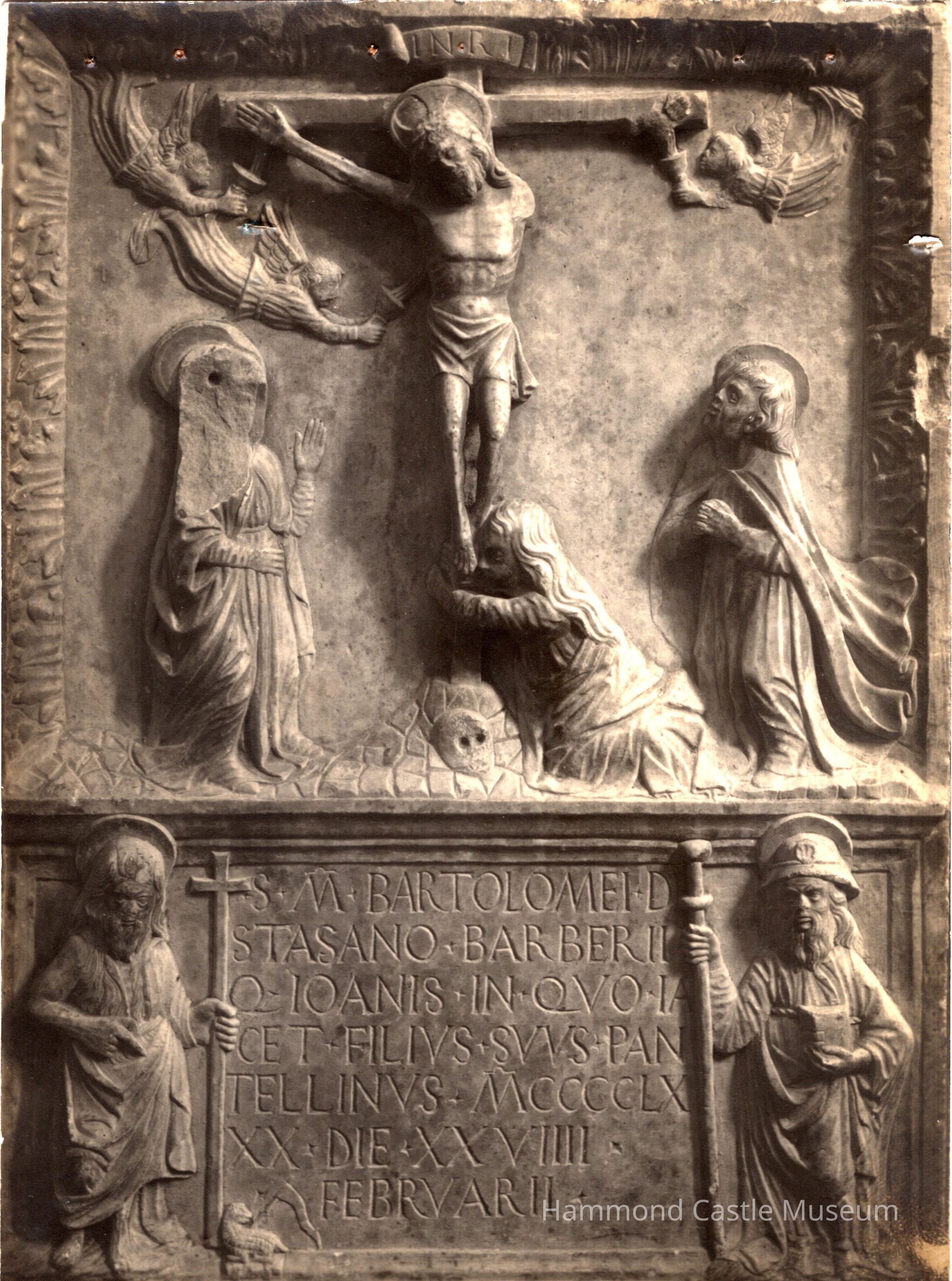 Italian carved marble relief of Crucifixion Scene of Jesus Christ and 3 figures at foot of cross in upper section. Angels are depicted catching the blood of Christ in goblets (Eucharistic symbolism).