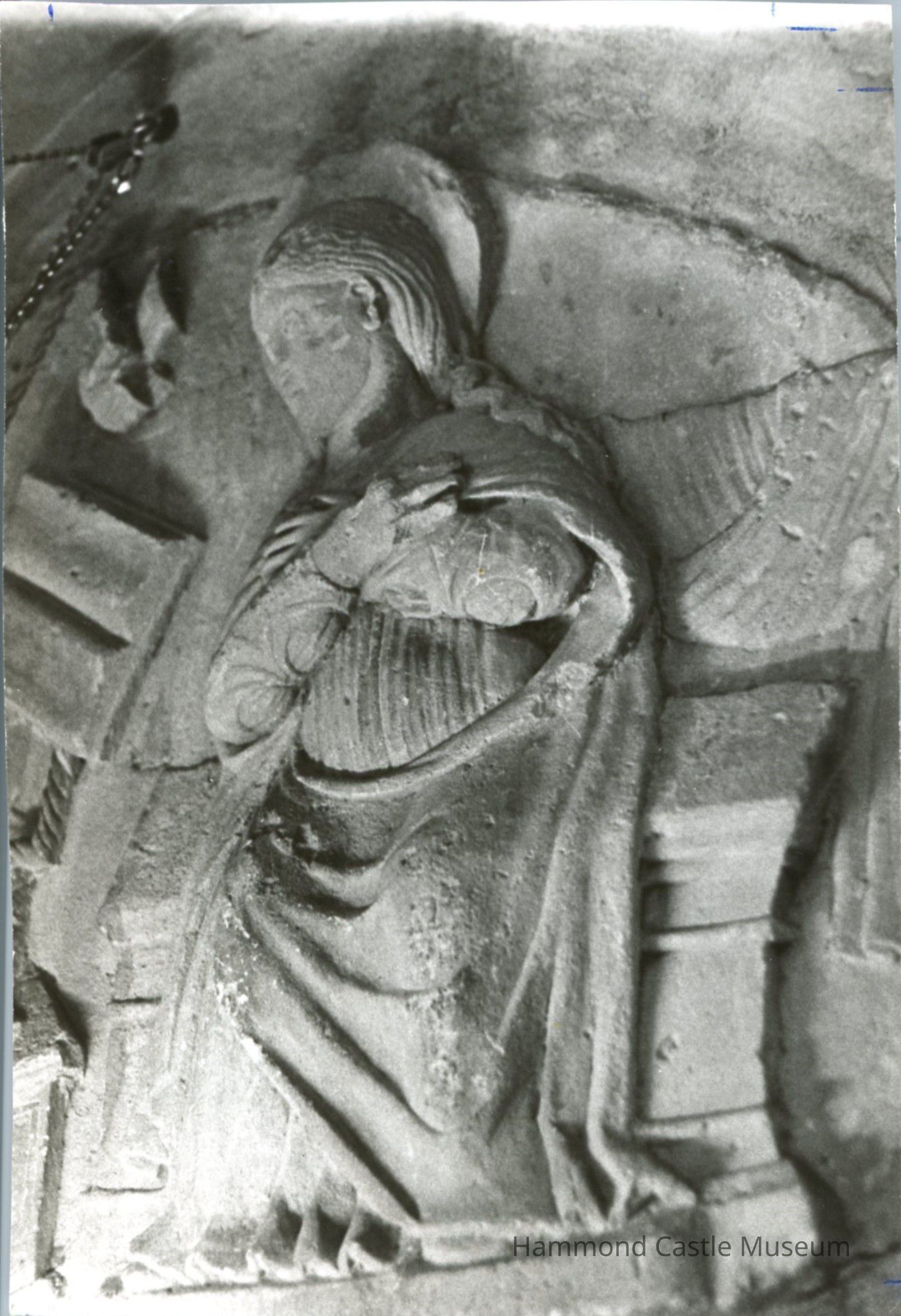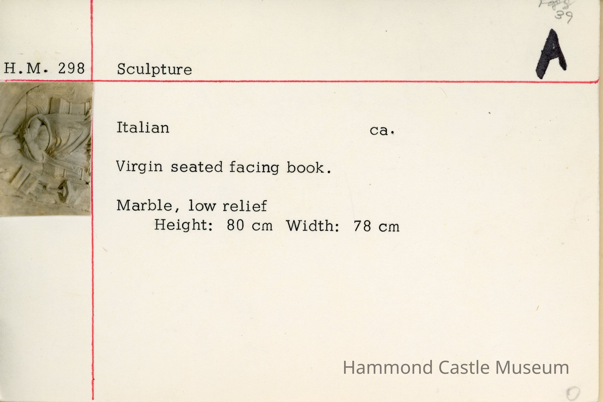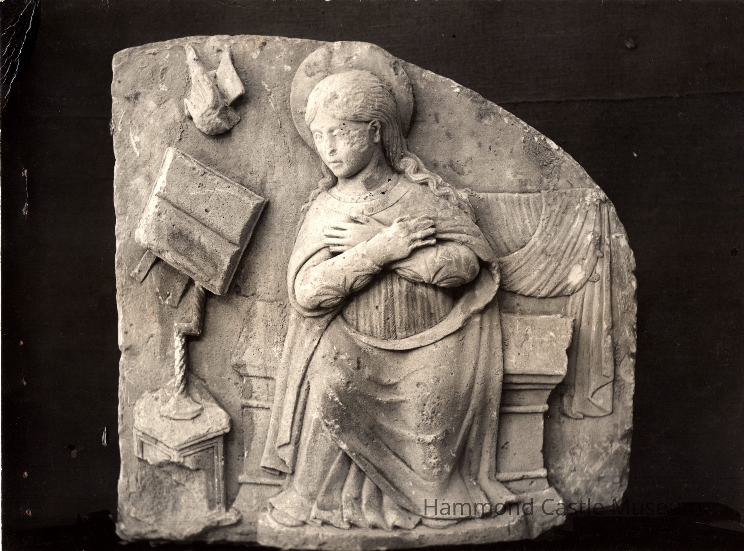 13th c. Italian marble low relief depicting the Holy Virgin seated facing a book, possibly the Bible with dove descending.