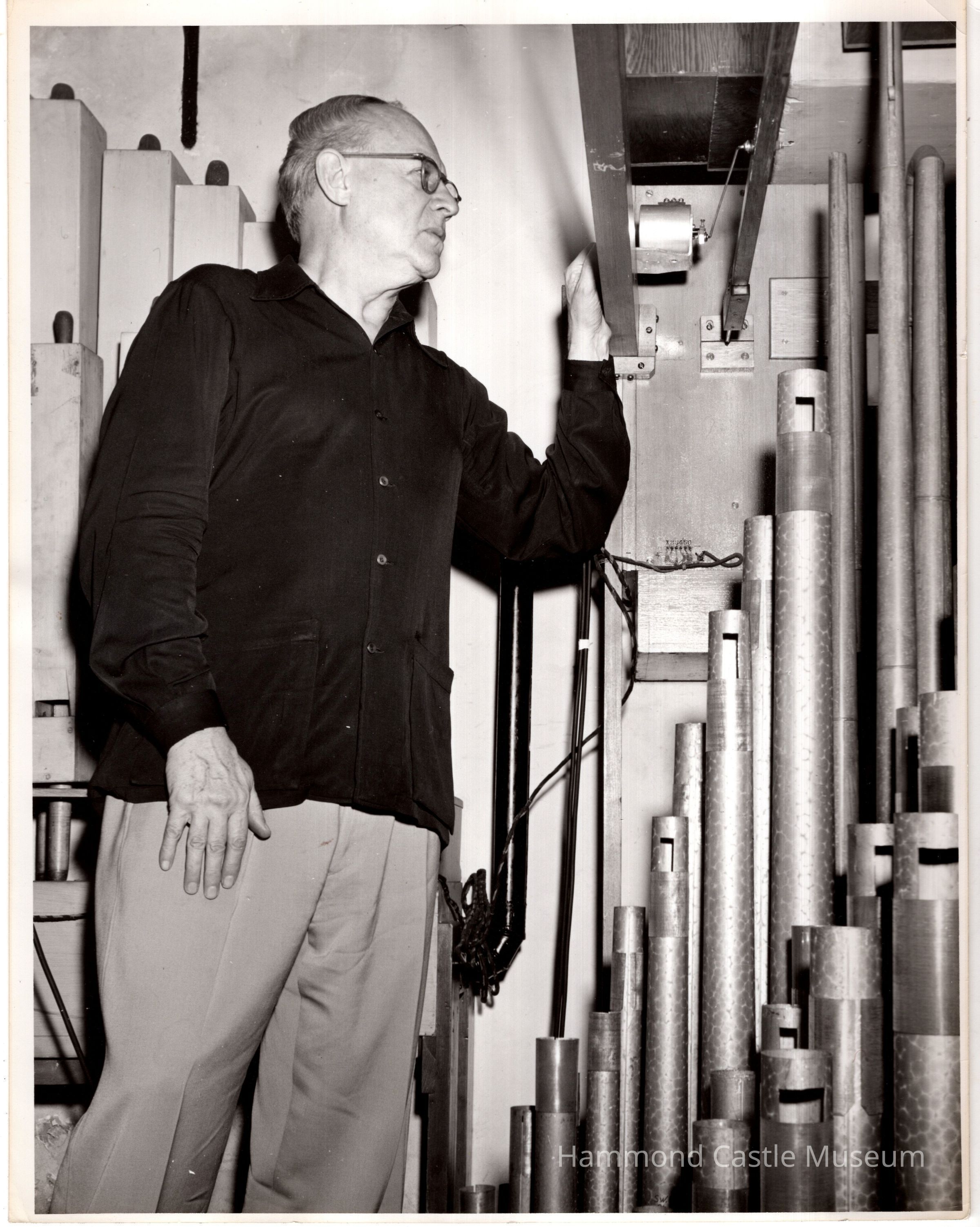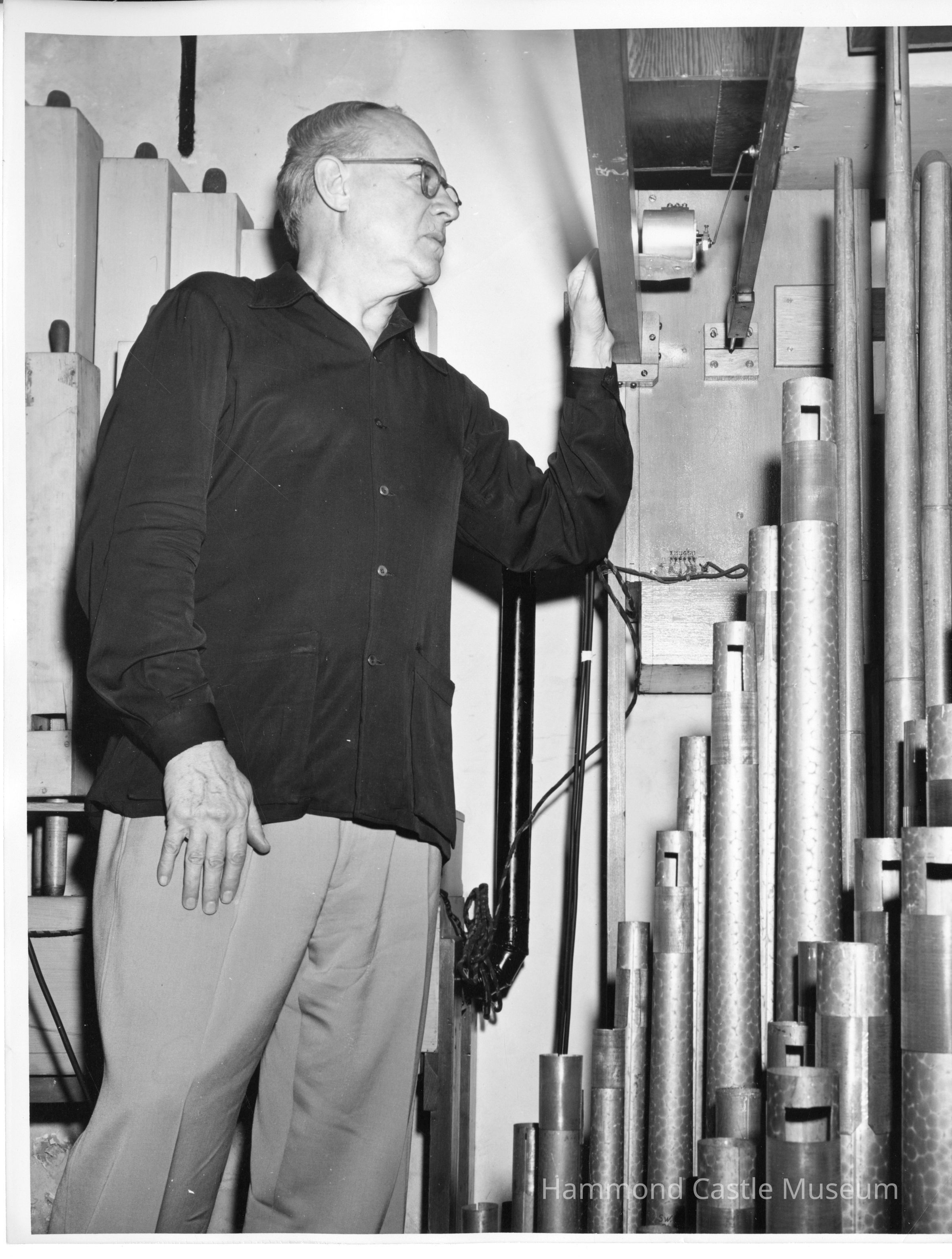 2 copies of photo taken 1950 ca of Hammond working on organ pipes Possible Bob Rapp image