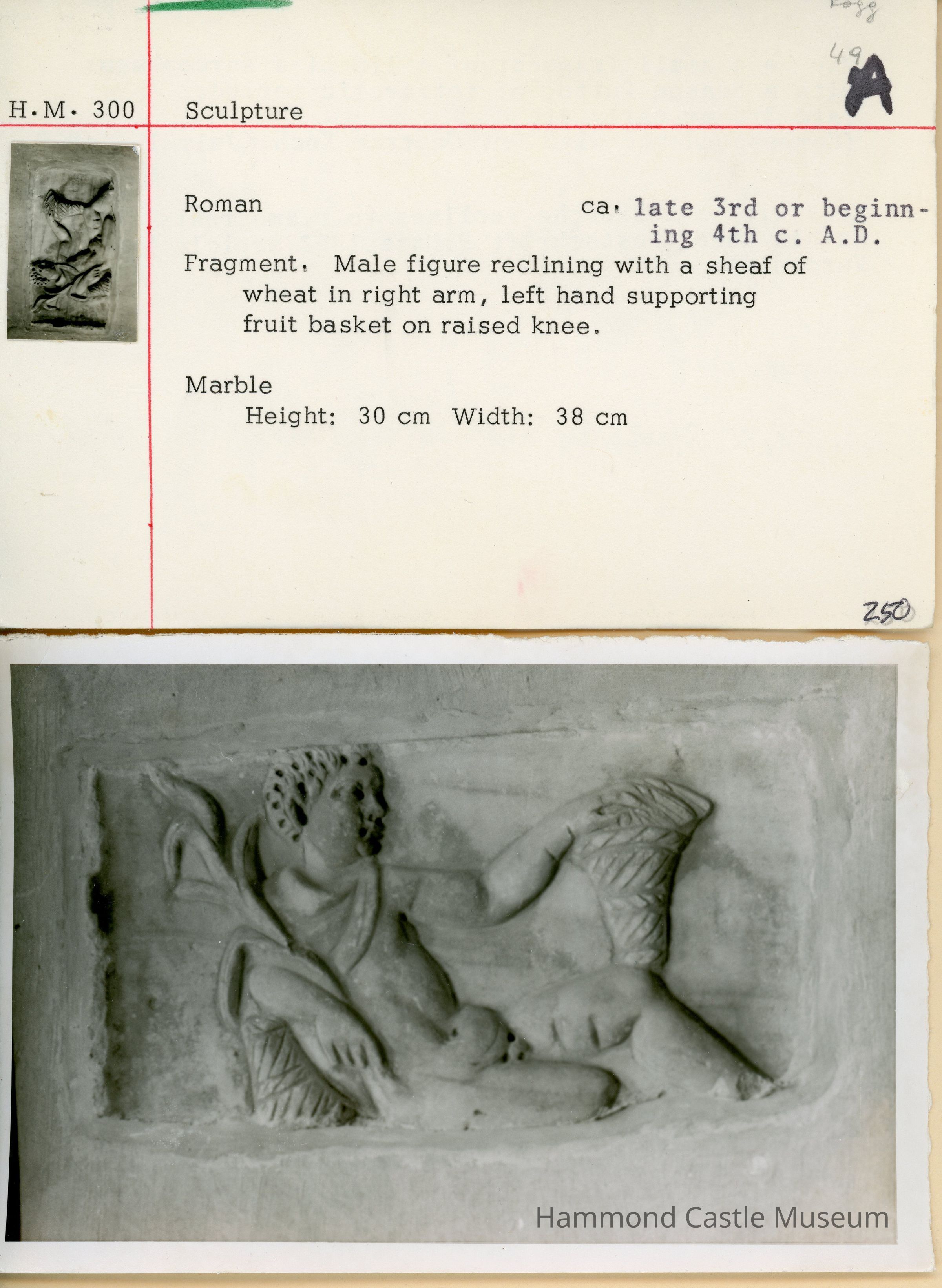 Marble fragment with male figure (Eros) reclining with a sheaf of wheat in right arm, left hand supporting fruit basket on raised knee.