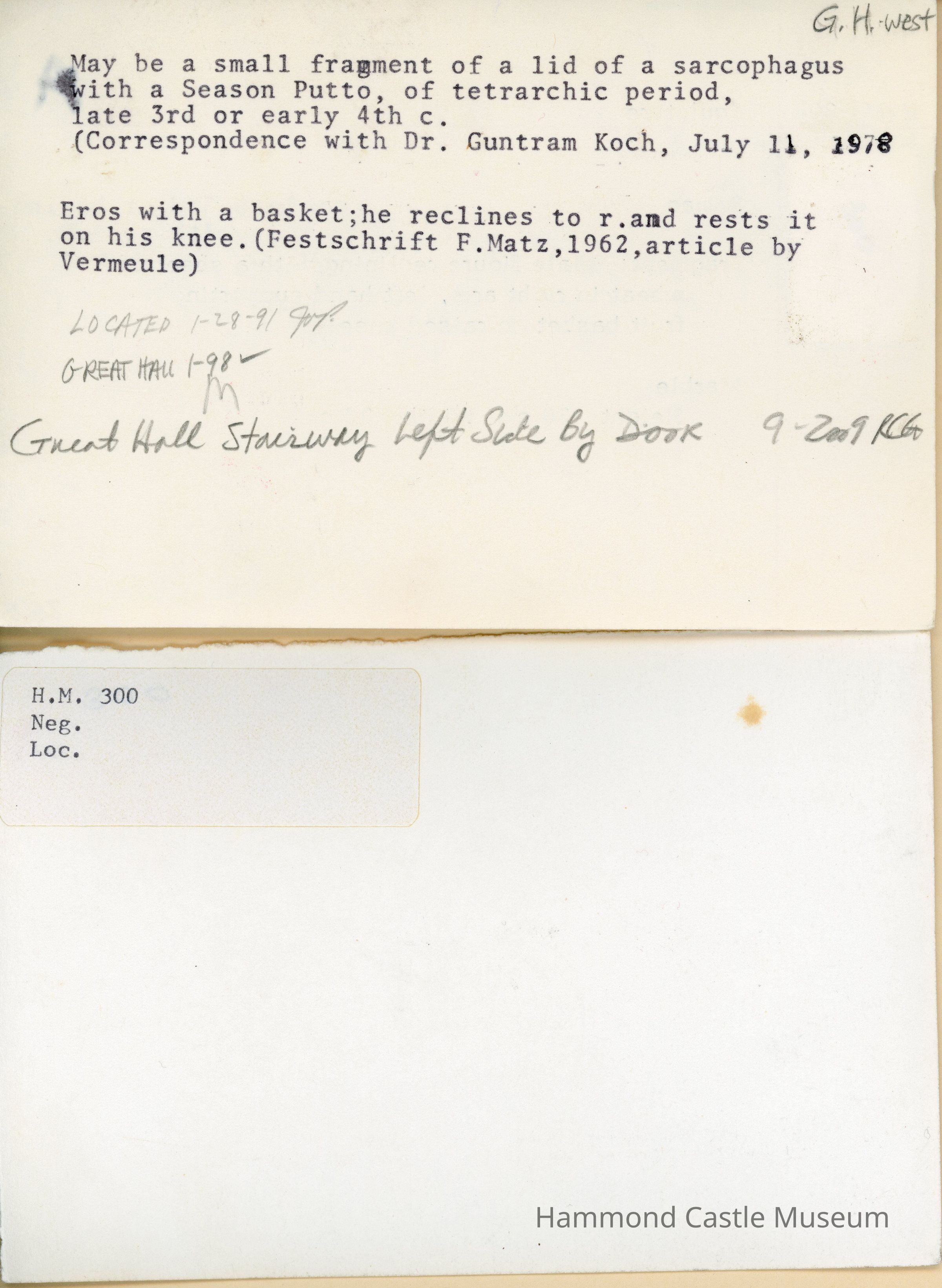 May be a small fragment of a sarcophagus with a Season Putto, of the Tetrarchic period, late 3rd or early 4th c. (from correspondence with Dr. Guntram Koch, July 11, 1978)