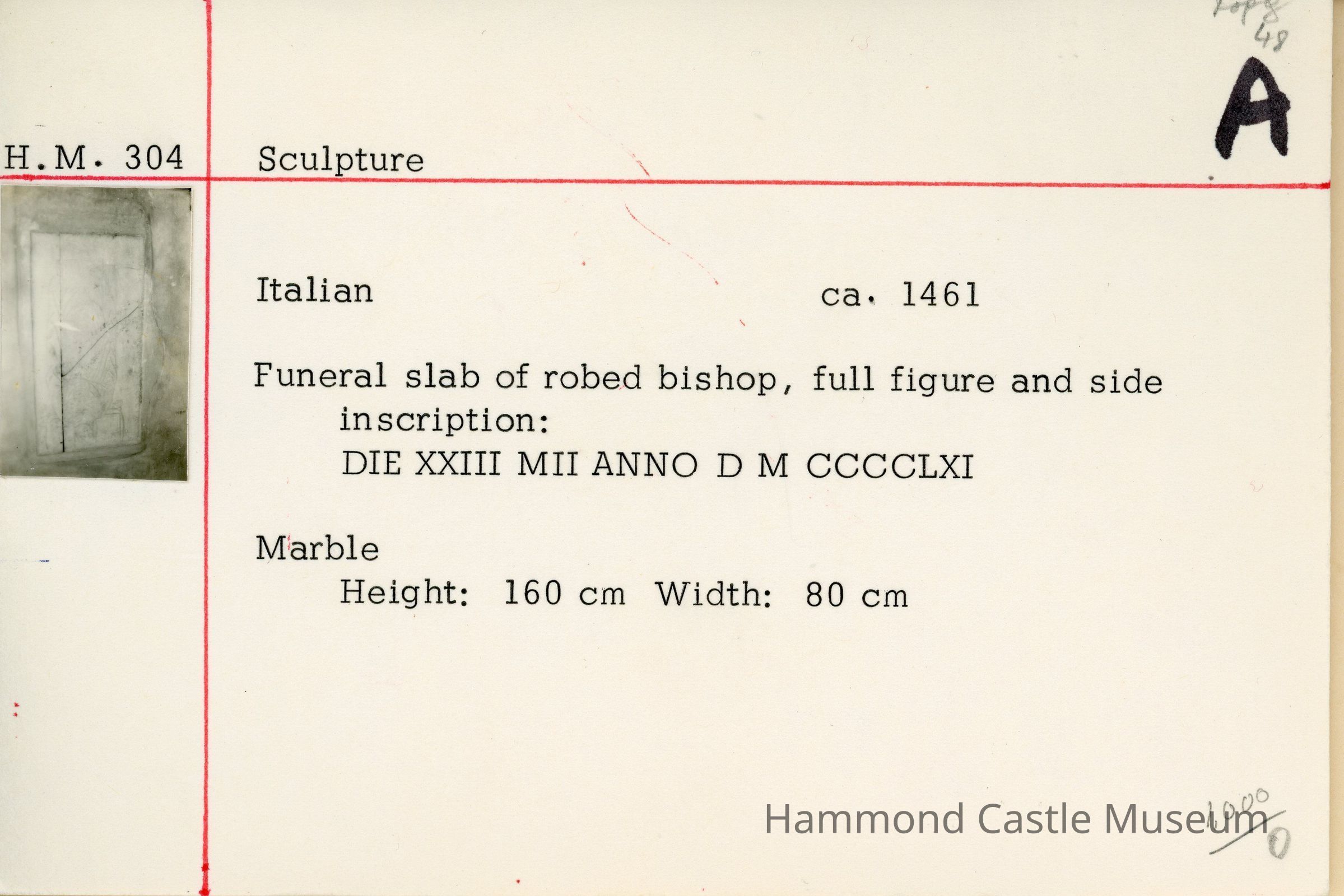 Funeral slab of robed bishop, full figure Reportedly found in church near the Forum during Tiber River excavations. side inscription: DIE XXIII MII ANNO D M CCCCLXI (day 23 1000 in the year 1461) (2023 scholarship - likely a re-carved piece)