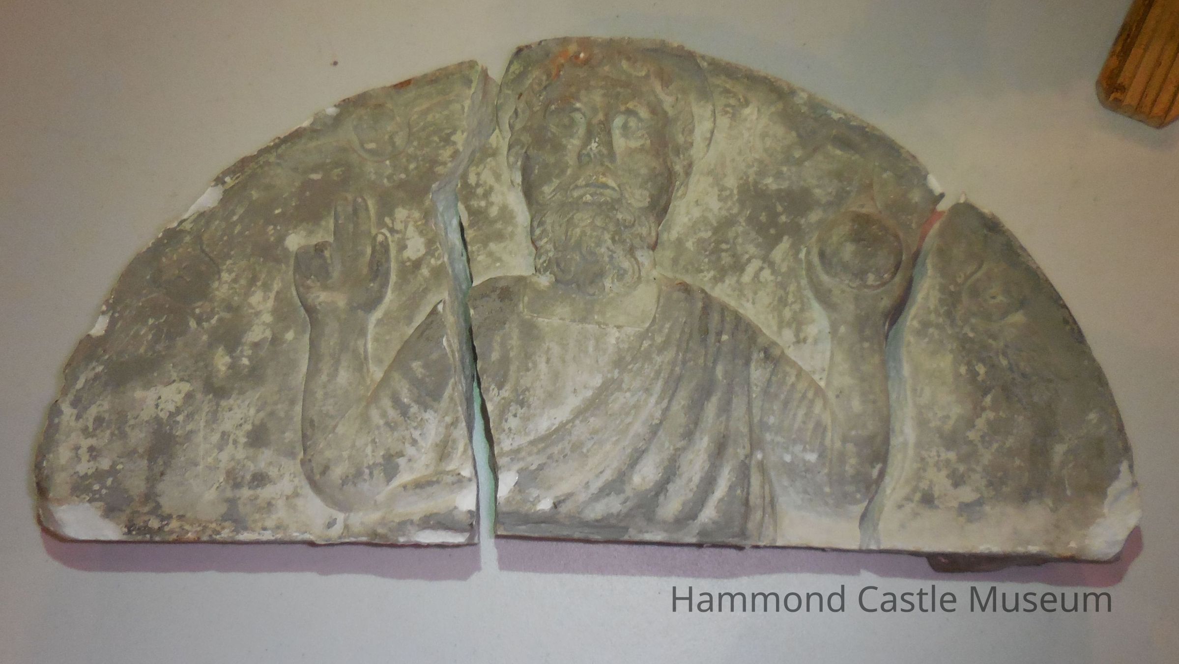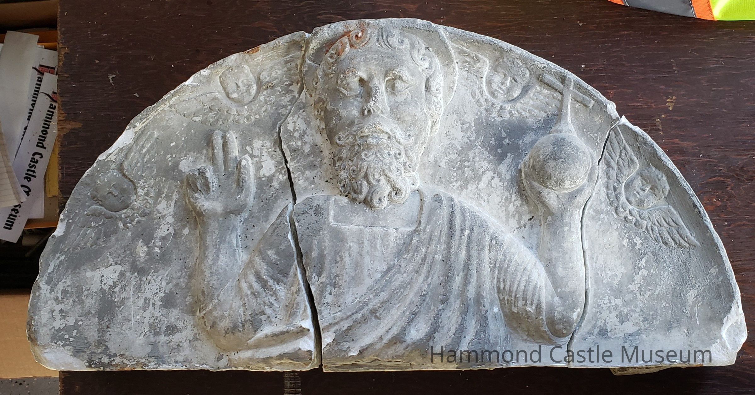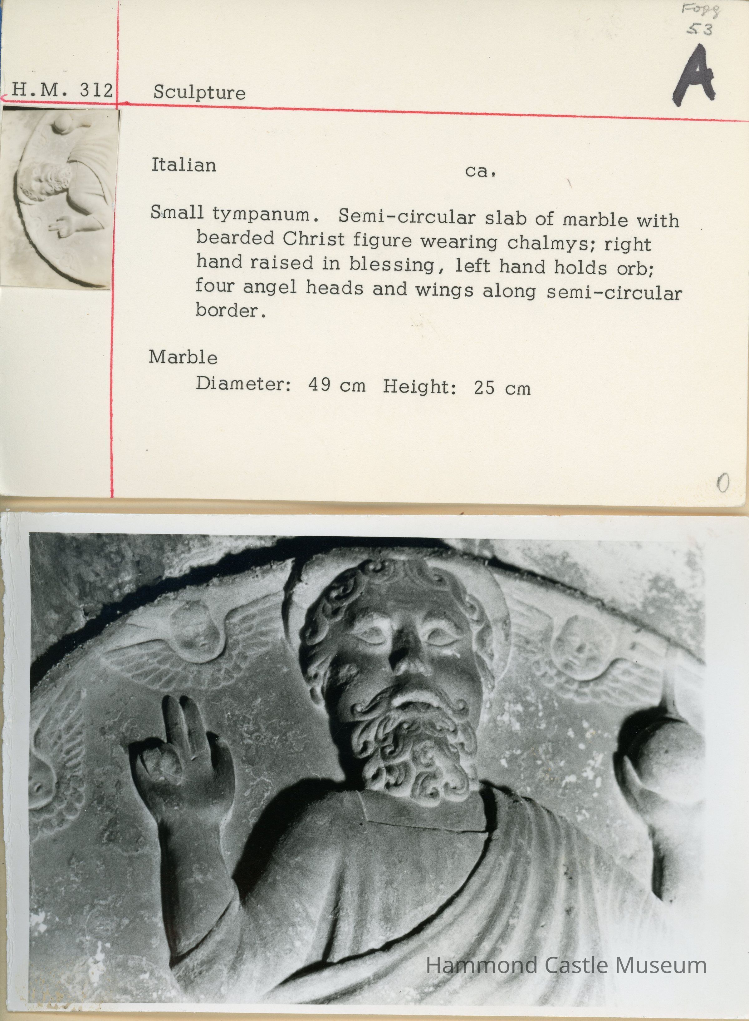 Small tympanum/lunette. Semi-circular slab of marble with bearded Christ figure wearing chlamys; right hand raised in blessing, left hand holds orb-globus cruciger, a cross-topped orb. This was a popular symbol of Christian authority since the Medieval era. With Christ holding the globe, he represents a Salvator Mundi (“Savior of the World’); four angel heads and wings along semi-circular border.