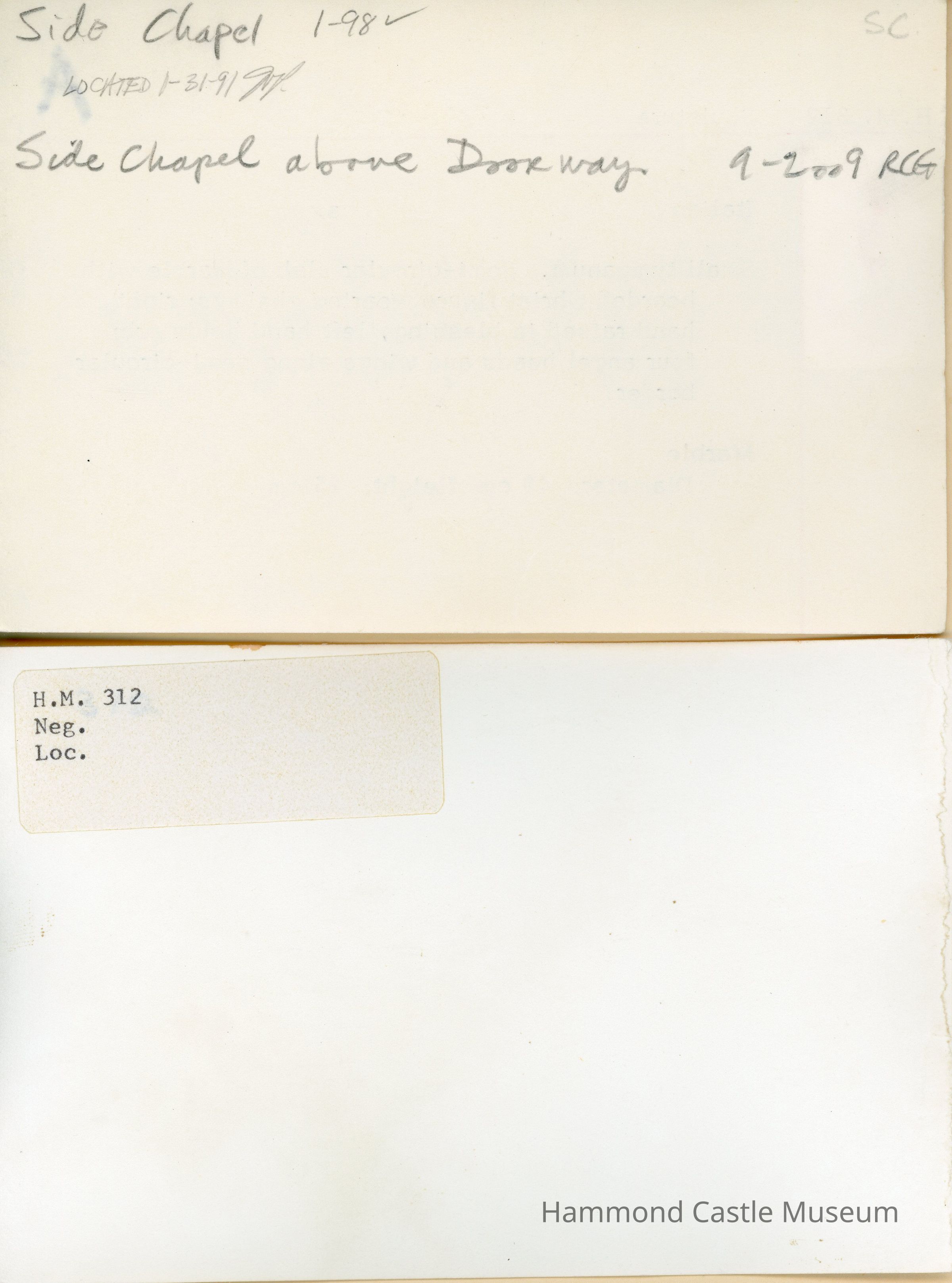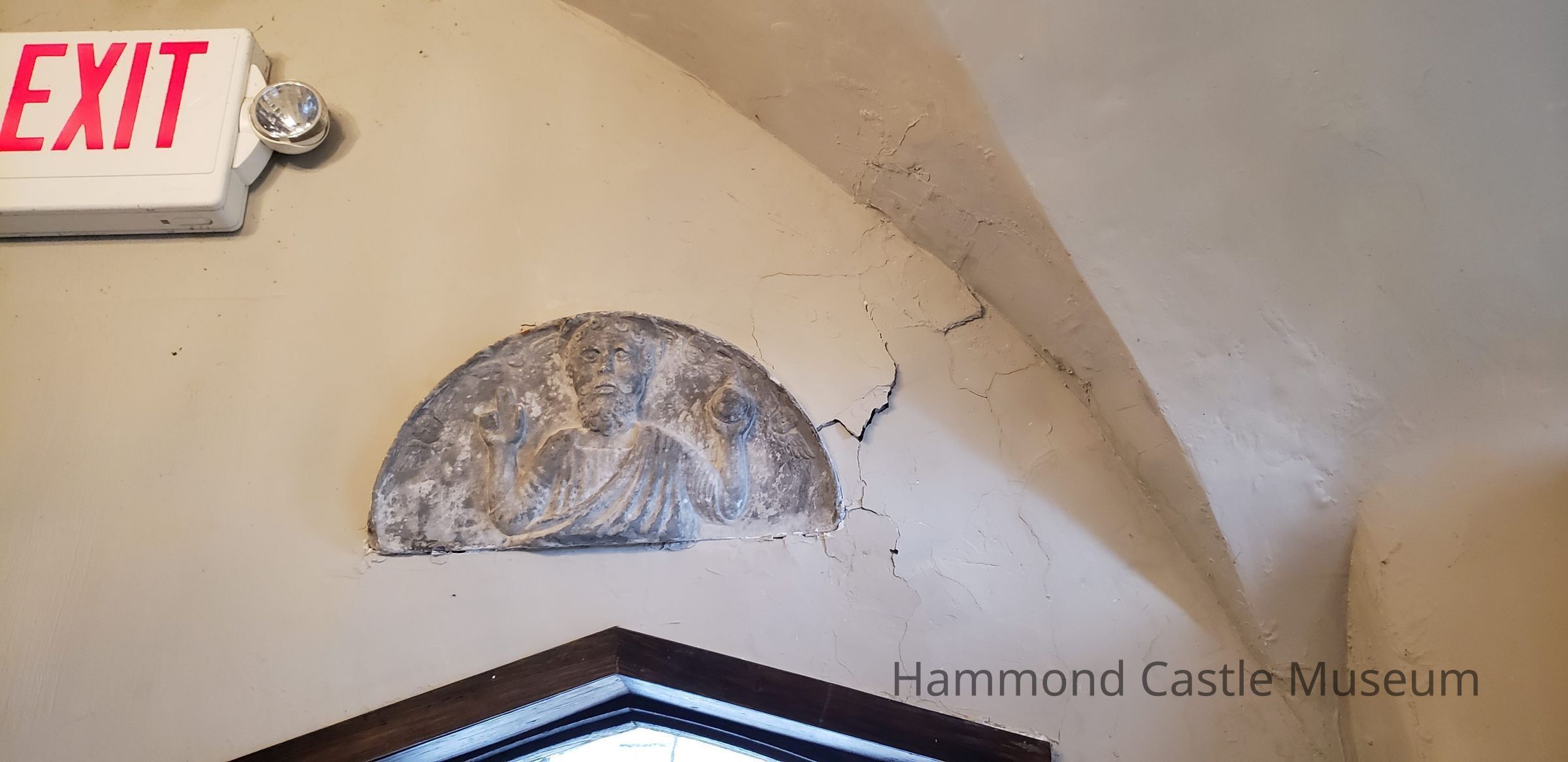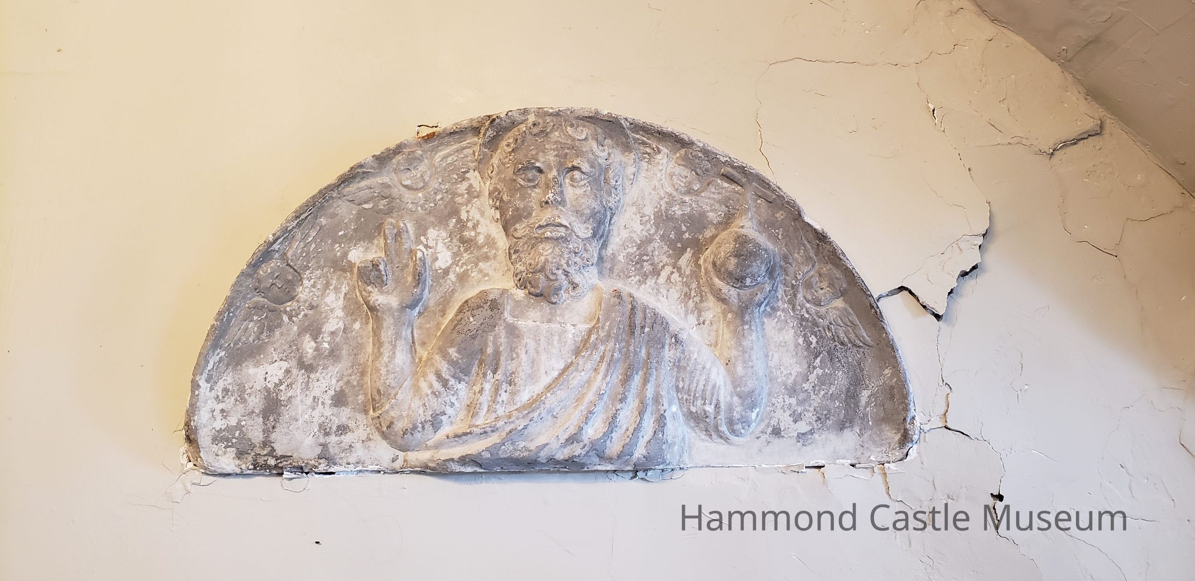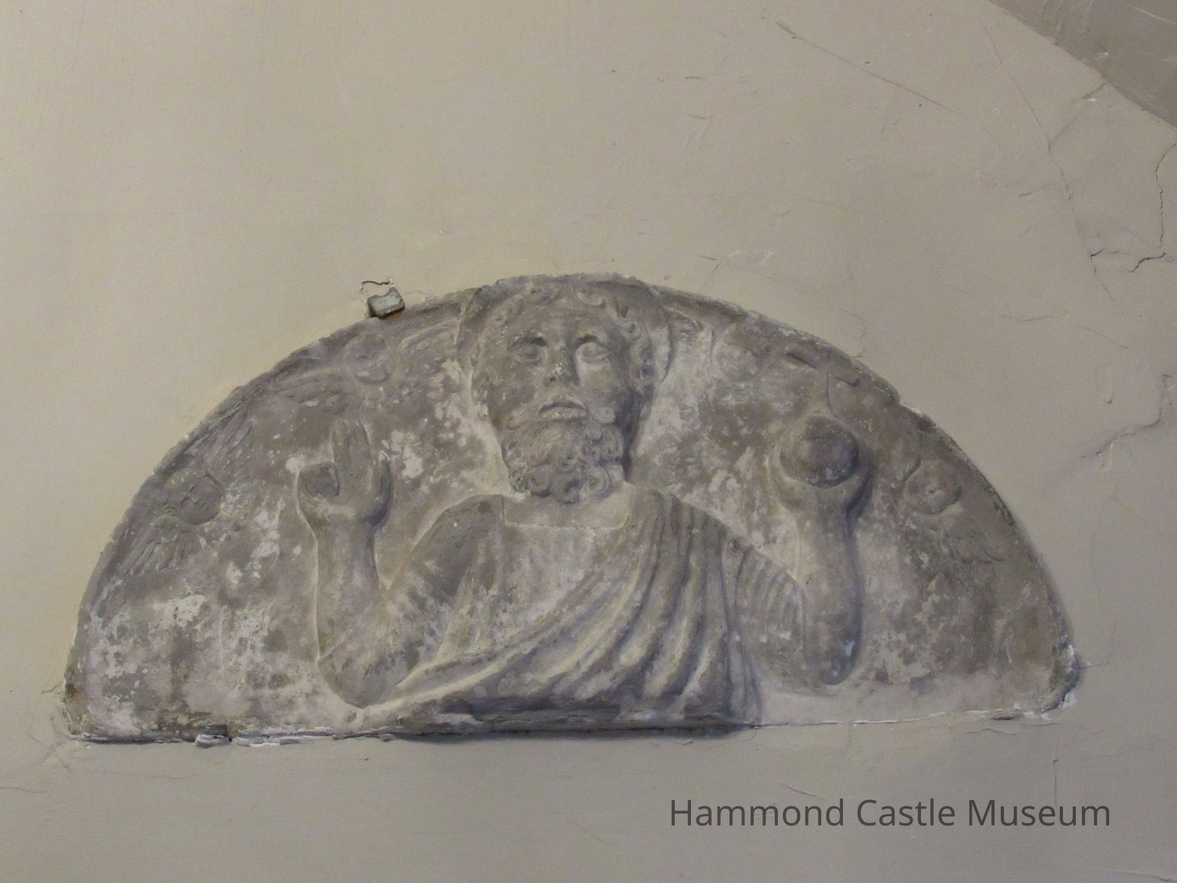 Small tympanum/lunette. Semi-circular slab of marble with bearded Christ figure wearing chlamys; right hand raised in blessing, left hand holds orb-globus cruciger, a cross-topped orb. This was a popular symbol of Christian authority since the Medieval era. With Christ holding the globe, he represents a Salvator Mundi (“Savior of the World’); four angel heads and wings along semi-circular border.
