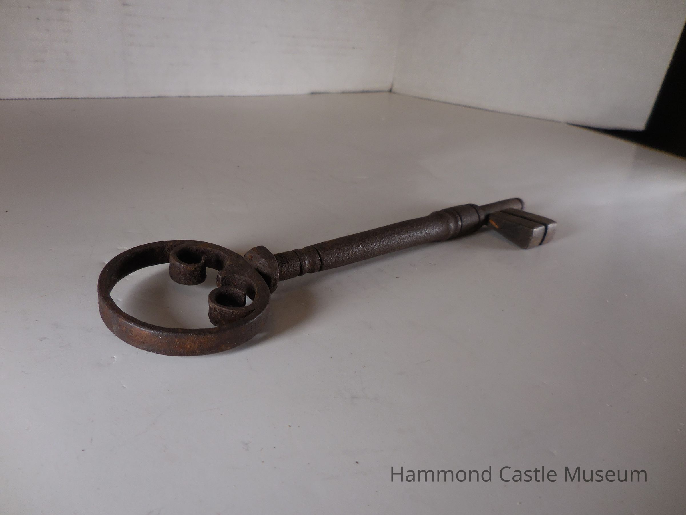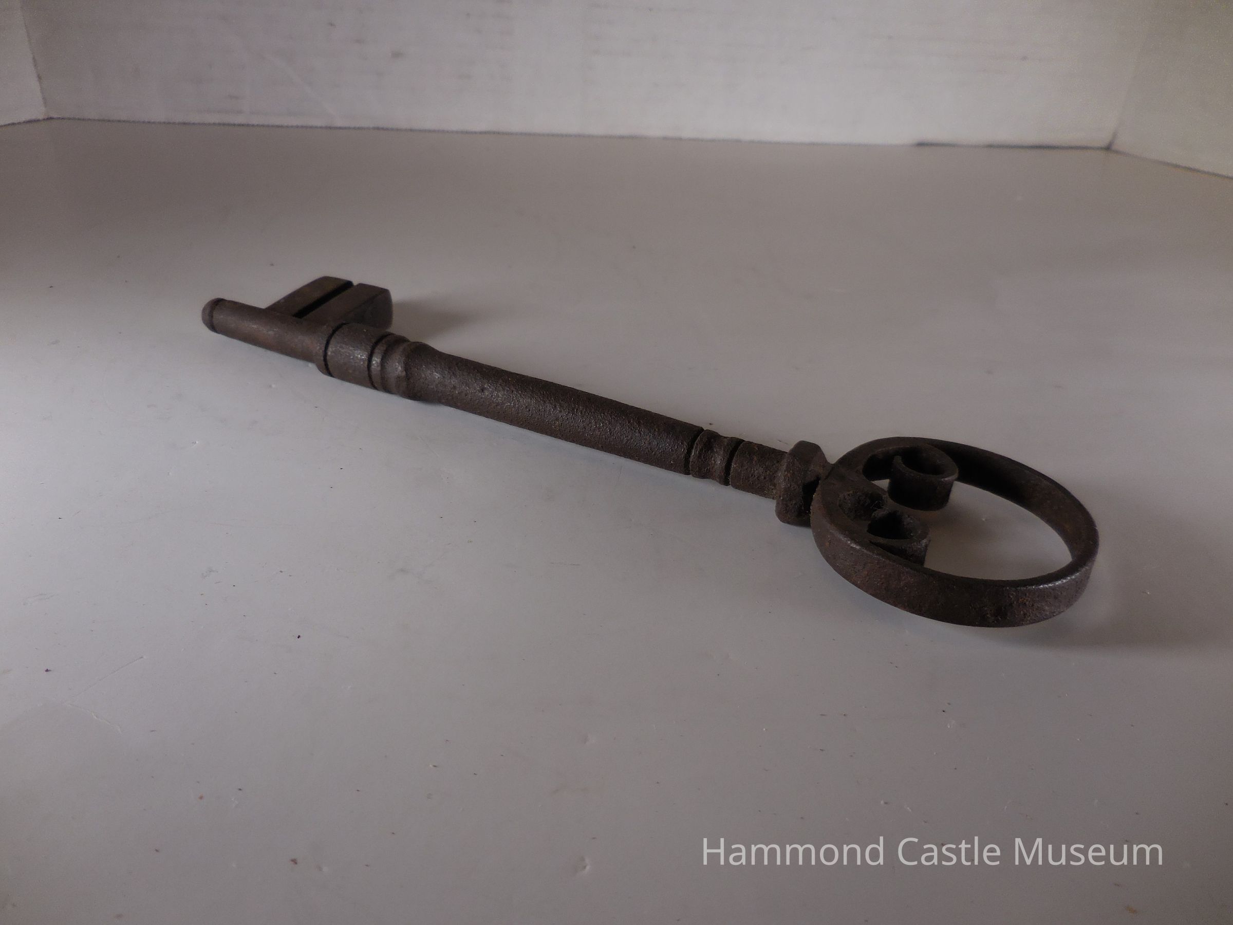 Key to Iron Plated and Studded Door with 2 Arch Detail. Large key, circular head, shaft extends slightly beyond the bit.