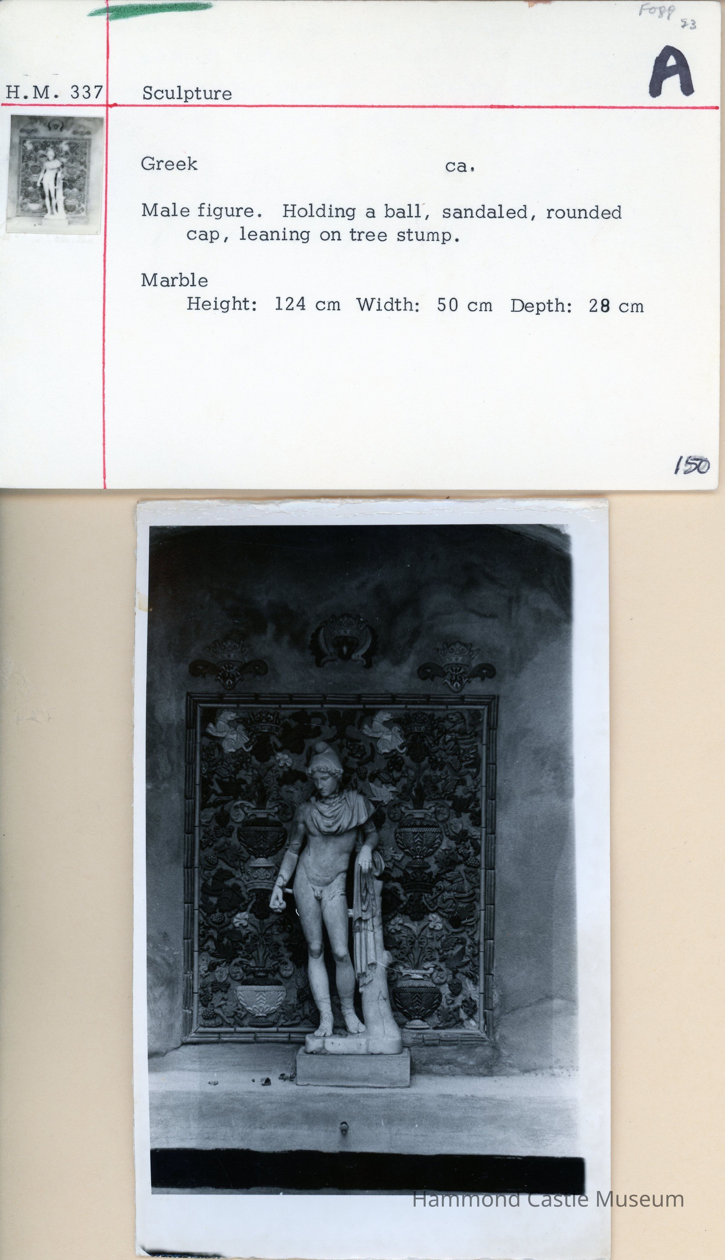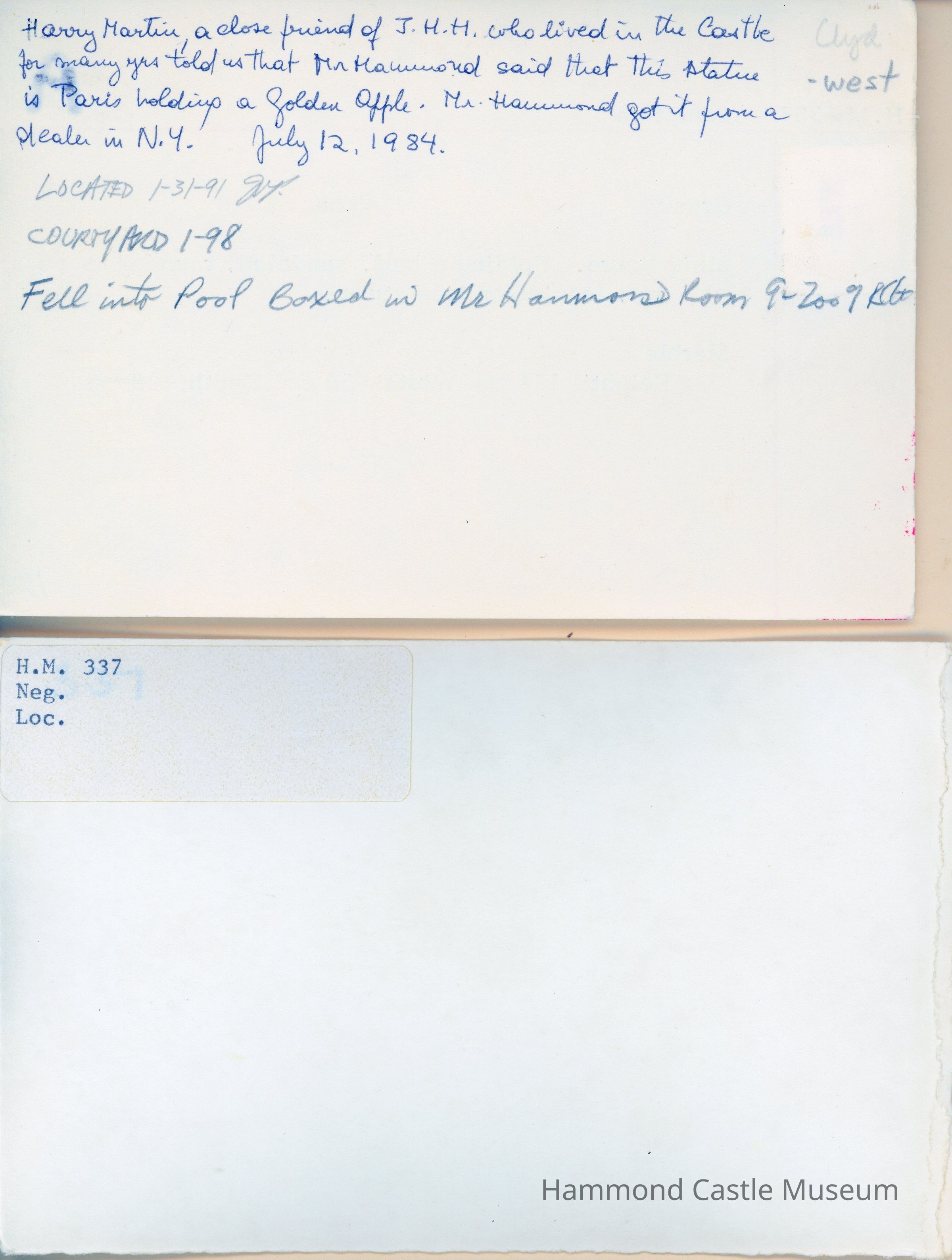 "Harry Martin, a close friend of J.H.H., who lived in the Castle for many years told us that Mr. Hammond said that this statue is Paris holding a Golden Apple. Mr. Hammond got it from a dealer in N.Y." July 12, 1984 (see catalog card)