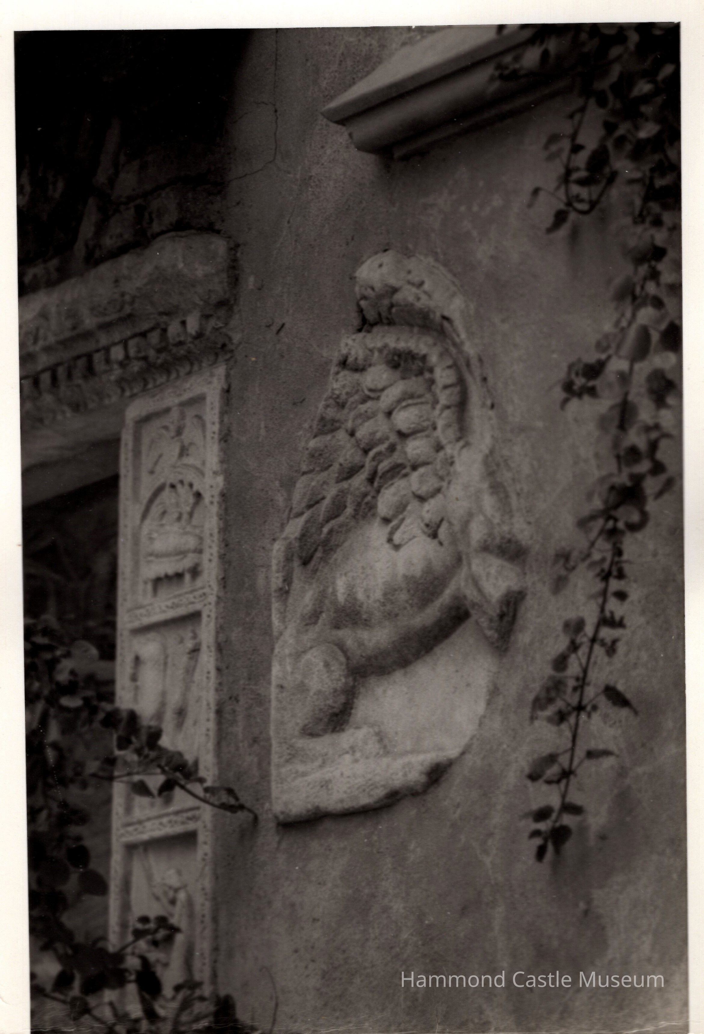 Winged creature (possibly a lion), fragment relief. Above left of pool on bridge