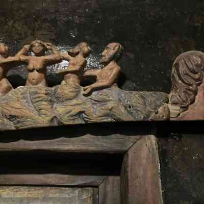 b: Scenes from daily life with four corbels in form of faces. Plus two faces under opposite bar.