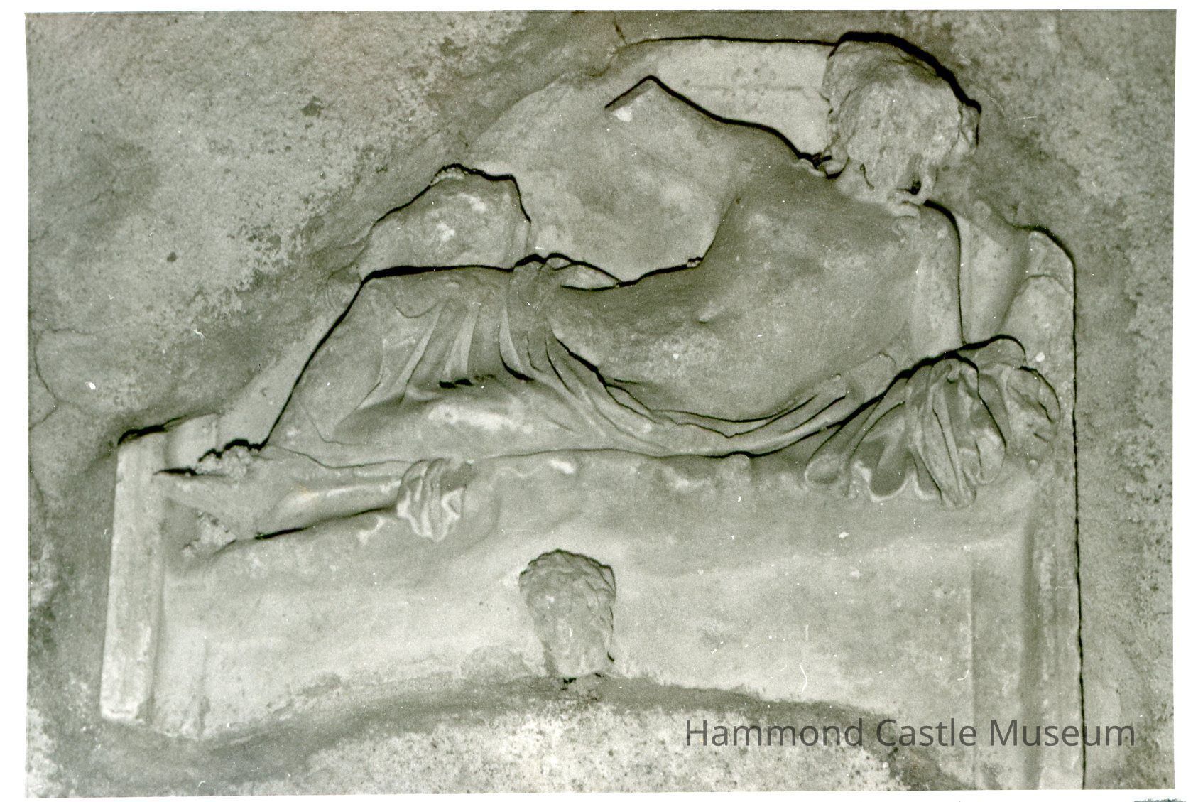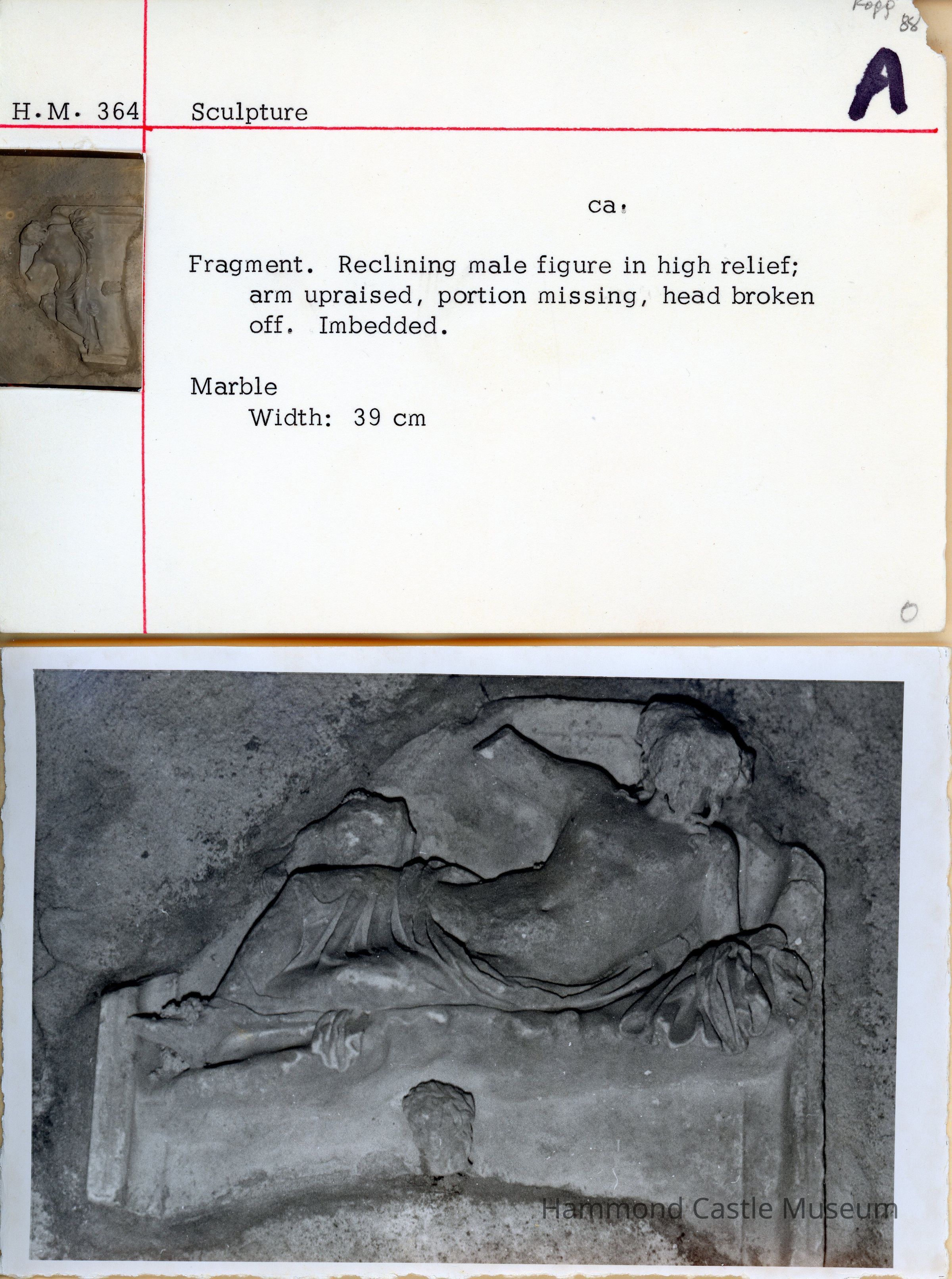 Relief fragment. Reclining male figure in high relief; arm upraised, portion missing, head broken off. Imbedded into wall.Collection