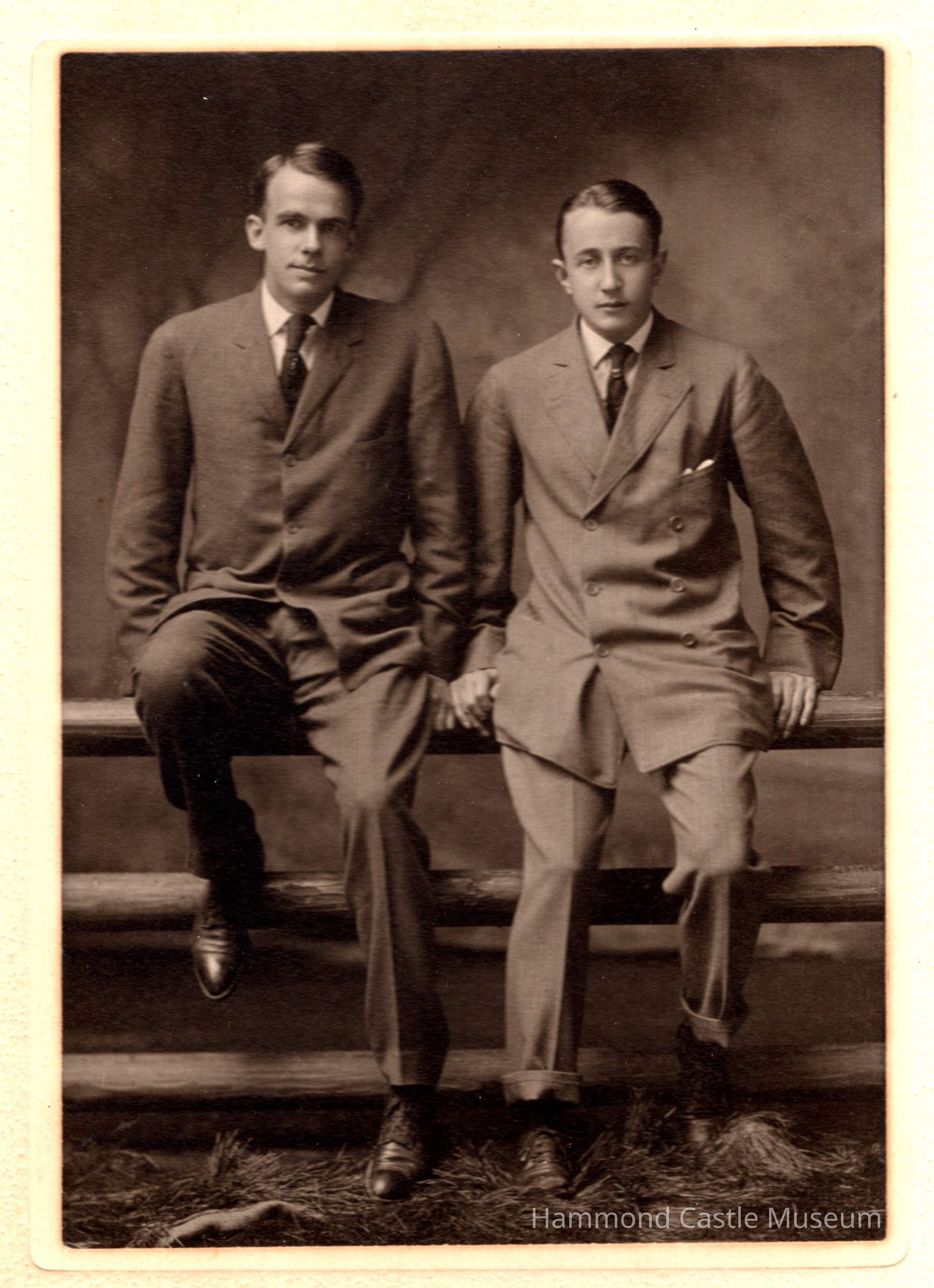 2 copies of photo of unknown man and Harris Hammond leaning on a fence