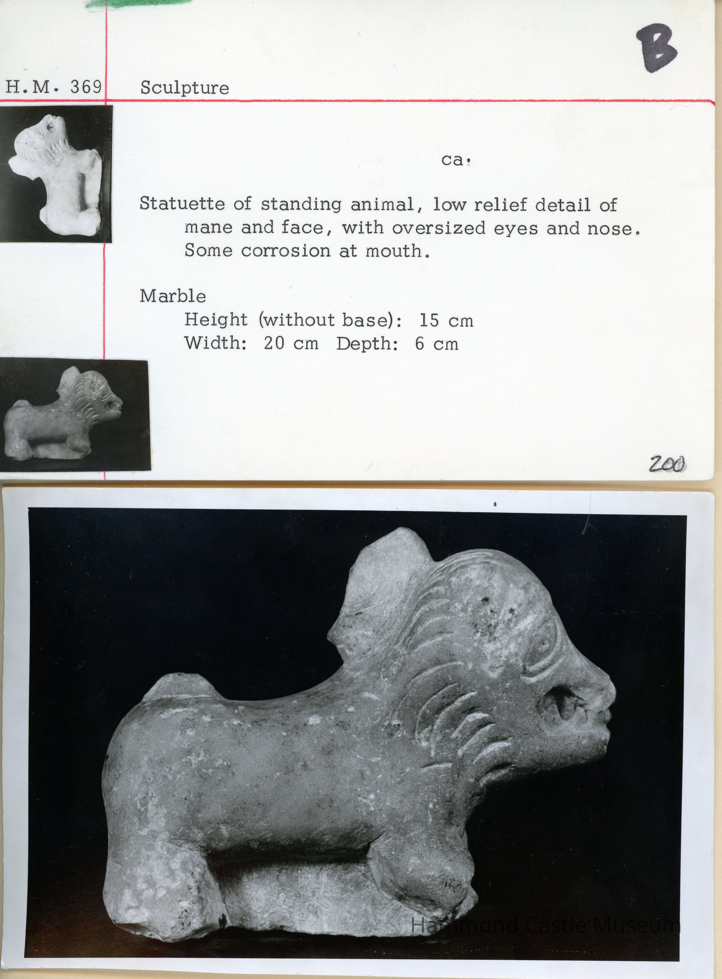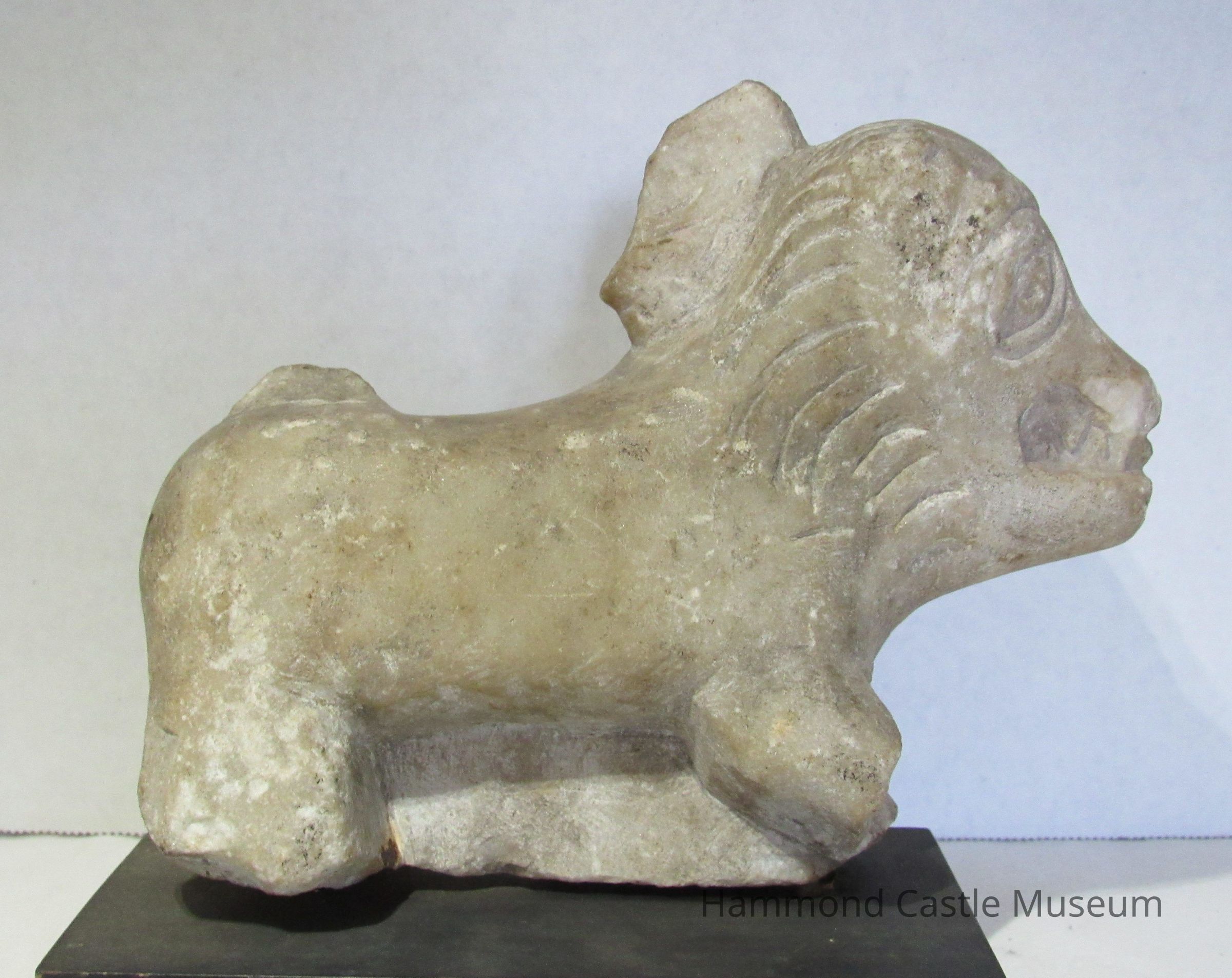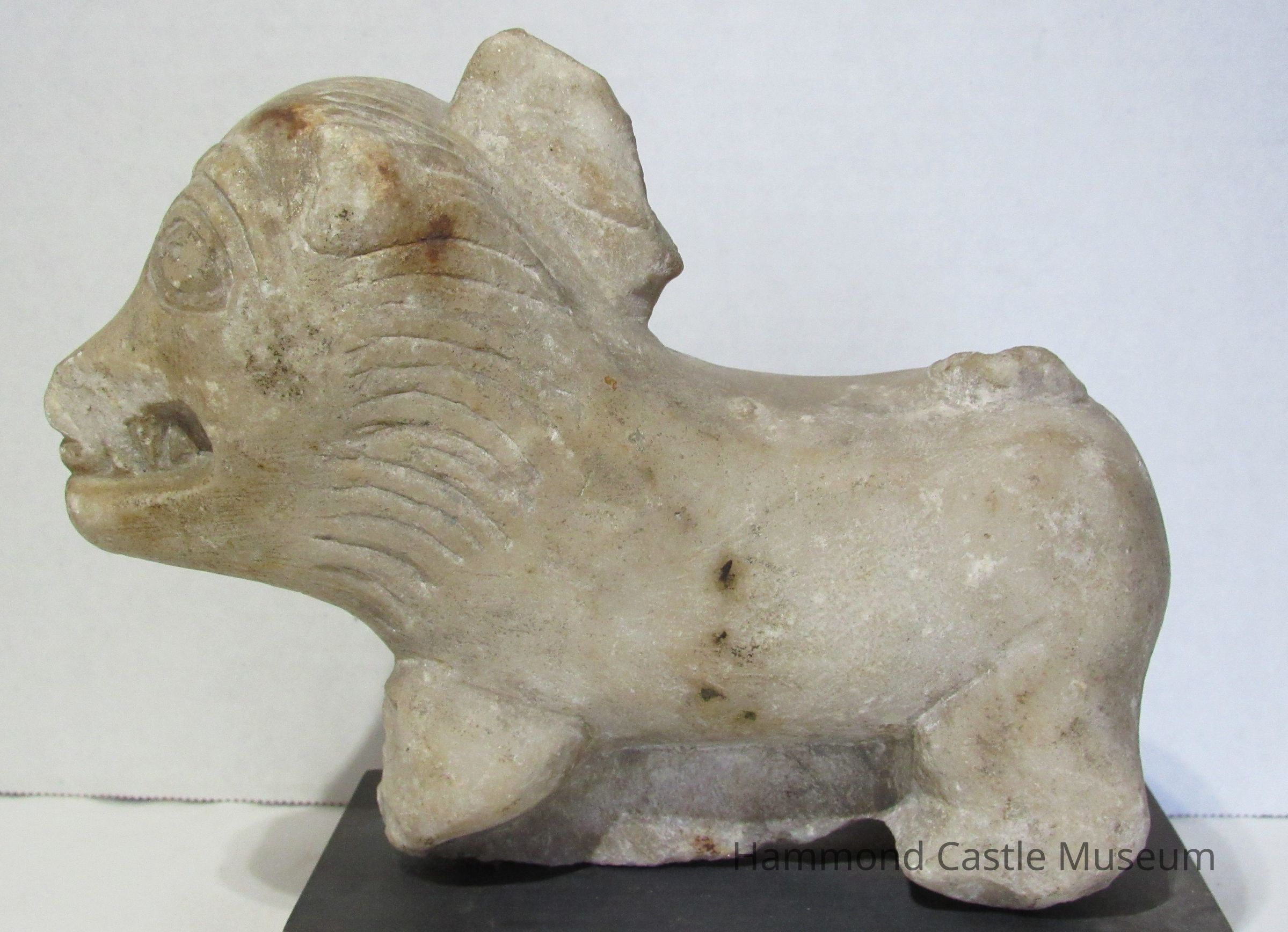 "Chaldean" Marble Lion Statuette of standing animal (lion), low relief detail of mane and face, with oversized eyes and nose. Some corrosion at mouth. Statuette attached to wooden black block Zalessky Donation, 1956