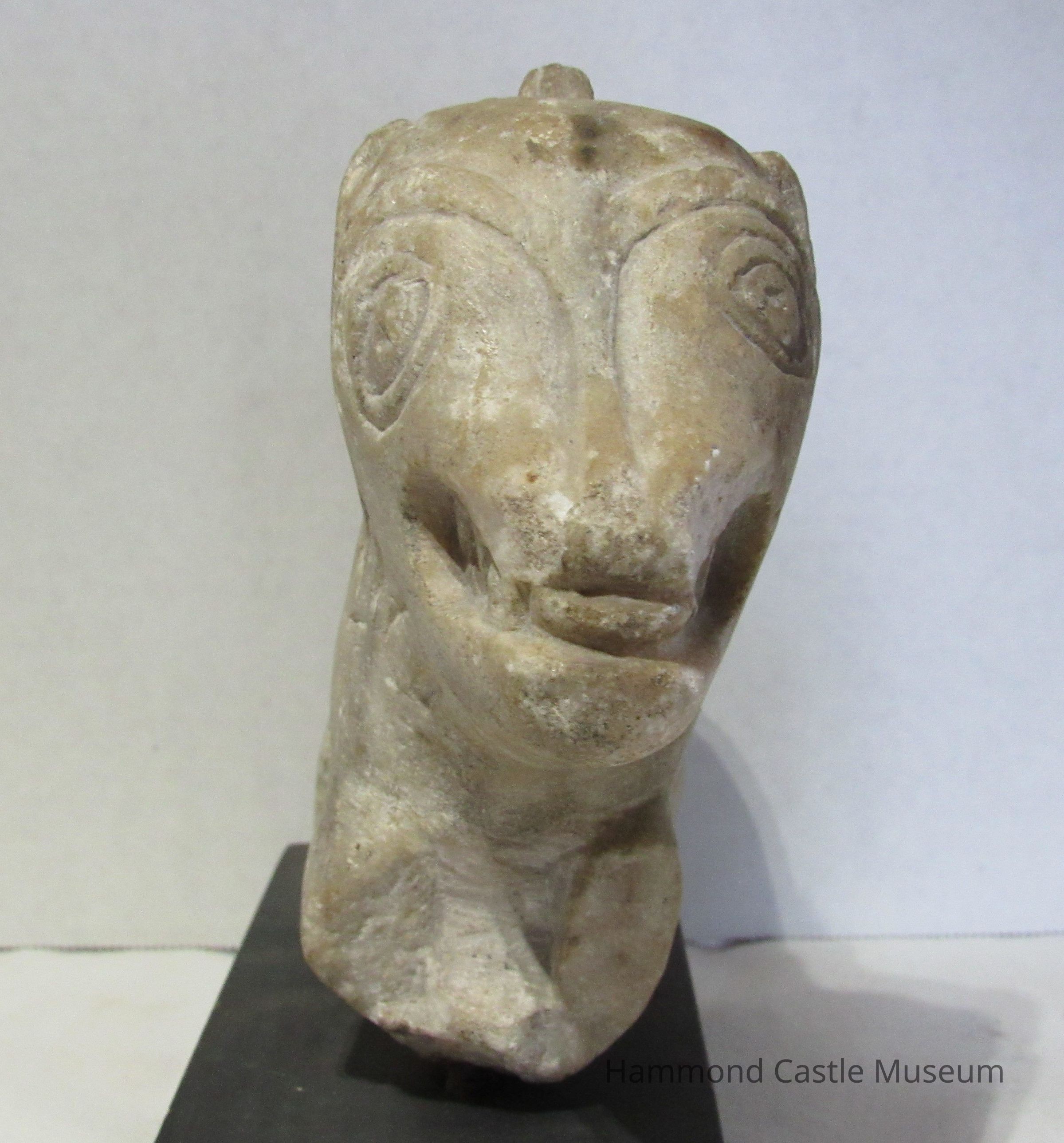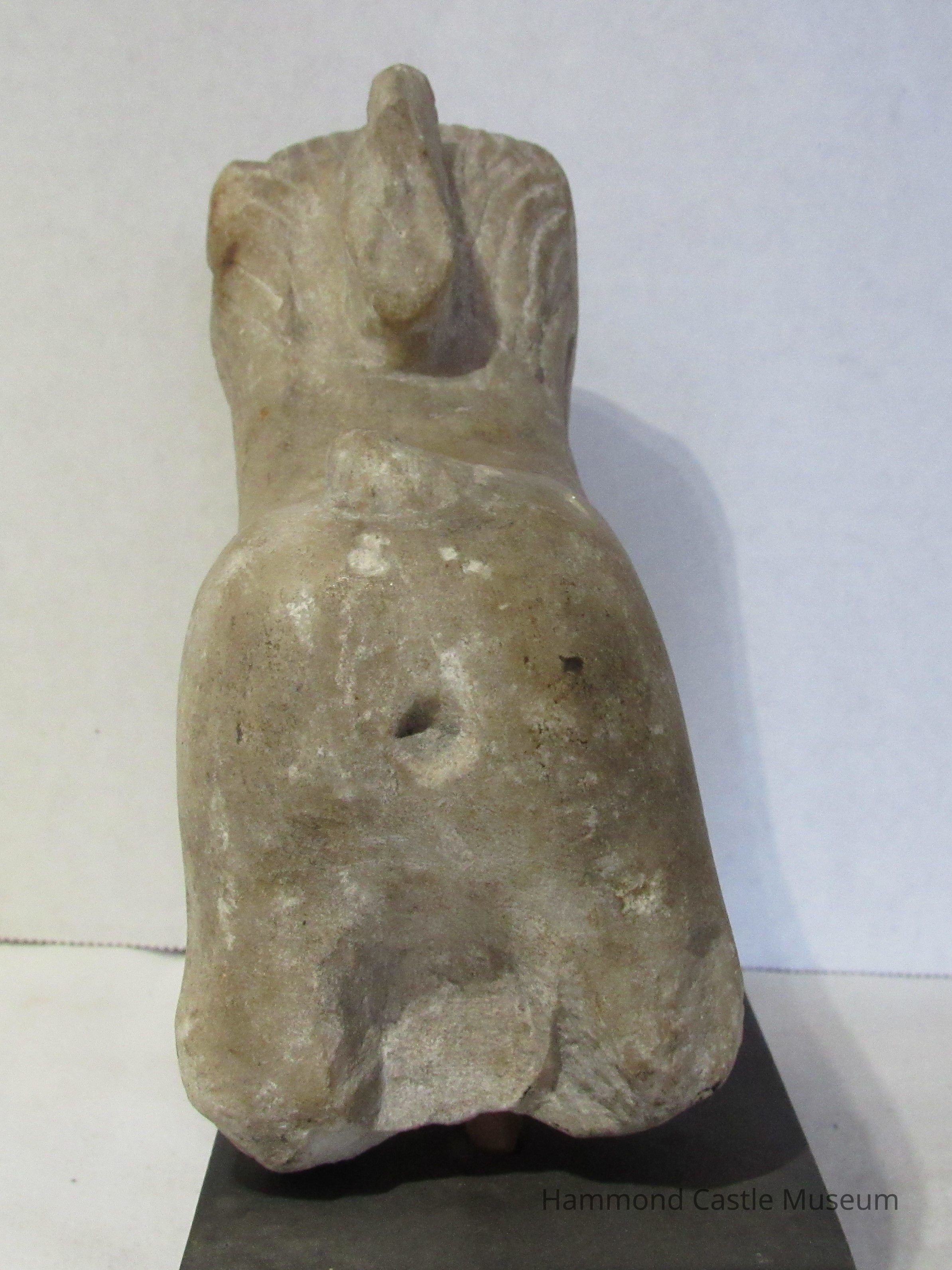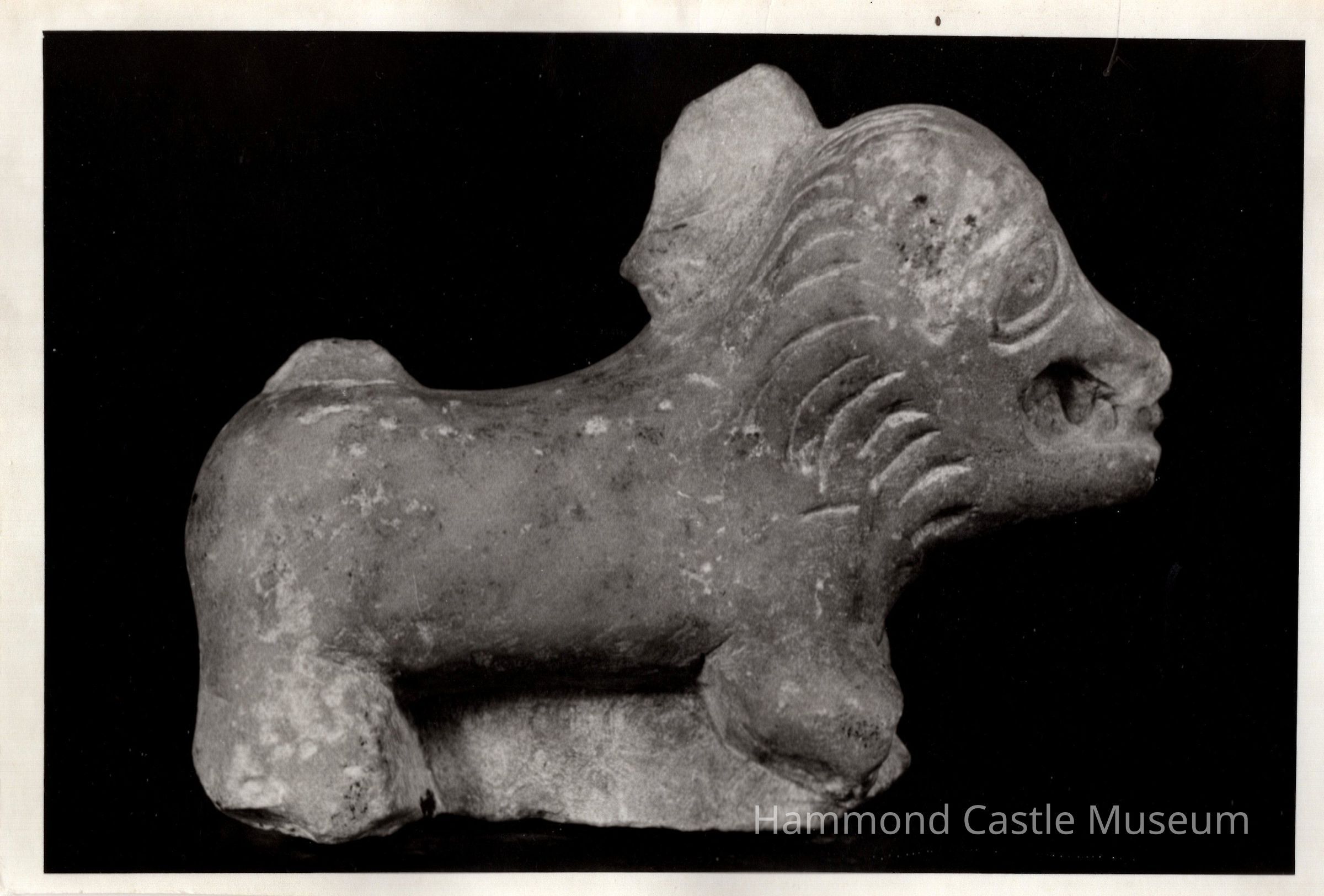 "Chaldean" Marble Lion Statuette of standing animal (lion), low relief detail of mane and face, with oversized eyes and nose. Some corrosion at mouth. Statuette attached to wooden black block Zalessky Donation, 1956