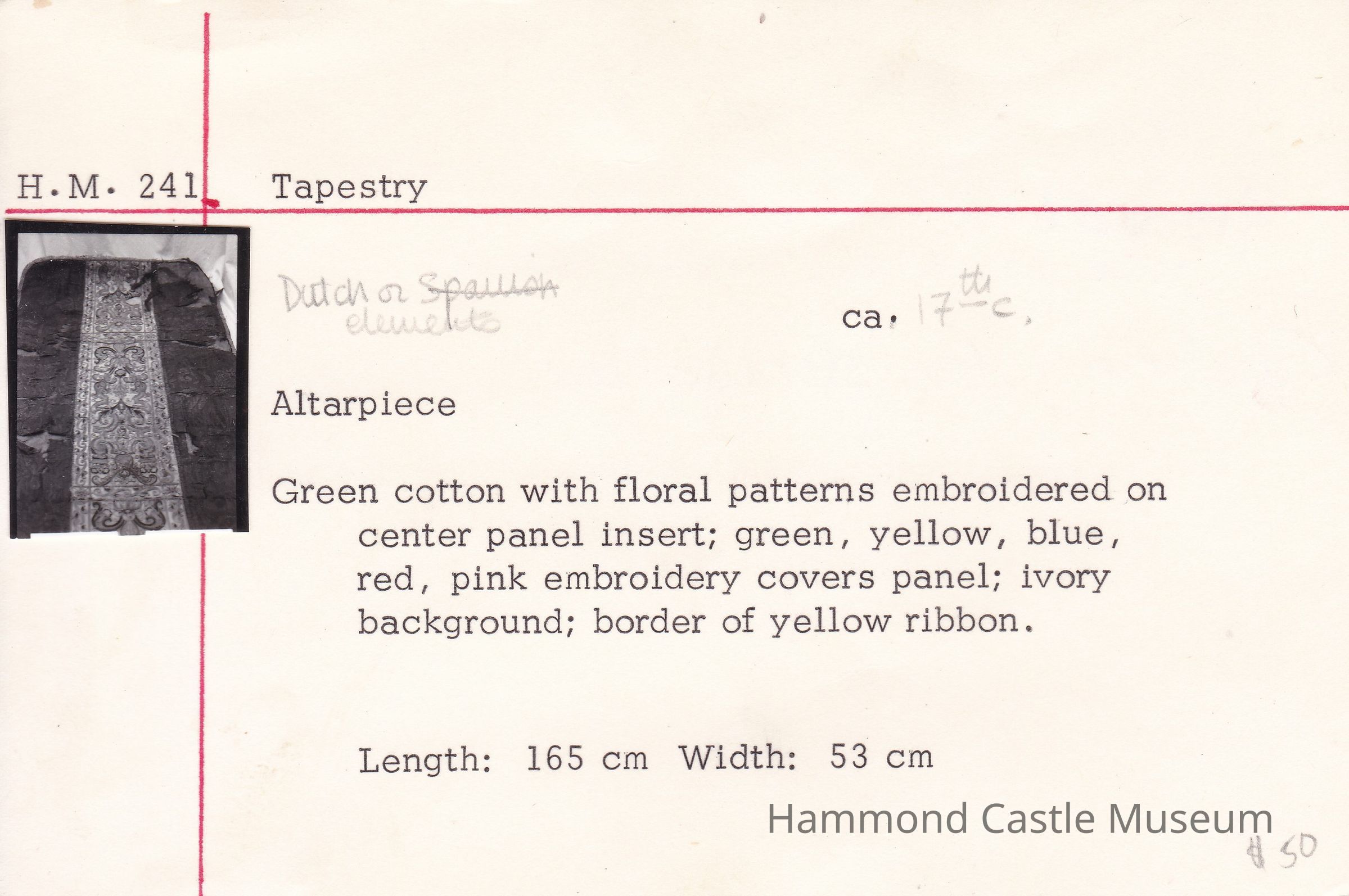 Green cotton with floral patterns embroidered on center panel insert Green, yellow, blue, red, pink embroidery covers panel; ivory background; border of yellow ribbon Dutch elements