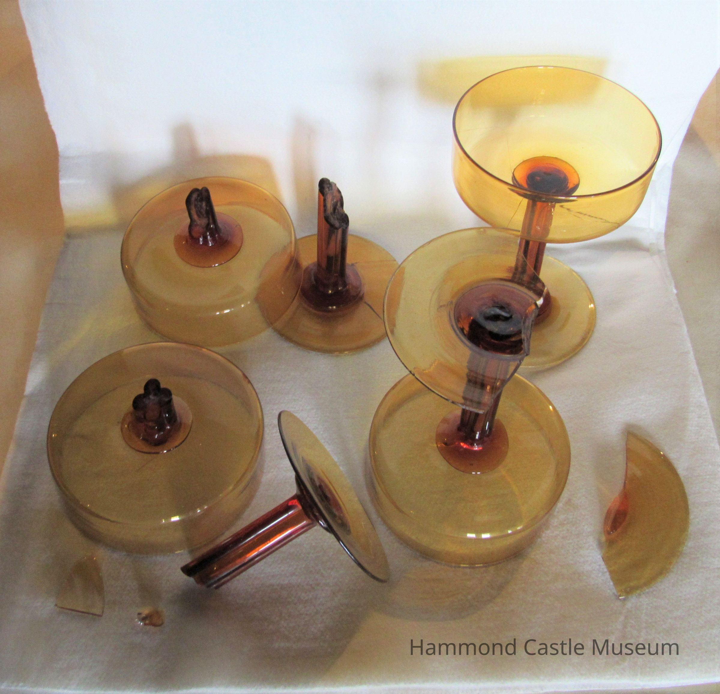 Set of 18 Amber Glass Shallow Goblets. Flat basin design. Unornamented. Some Broken