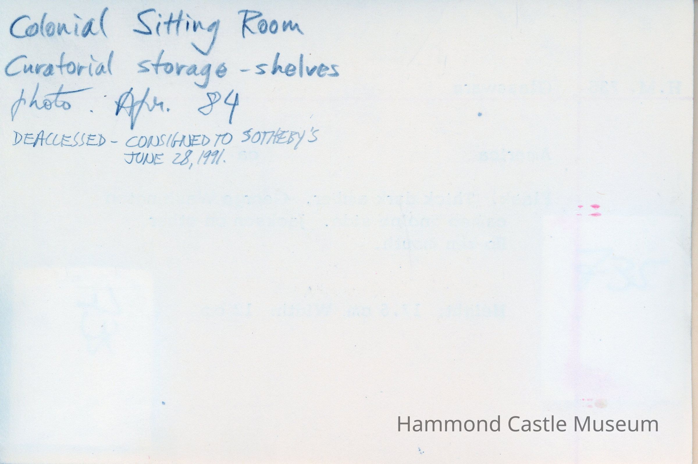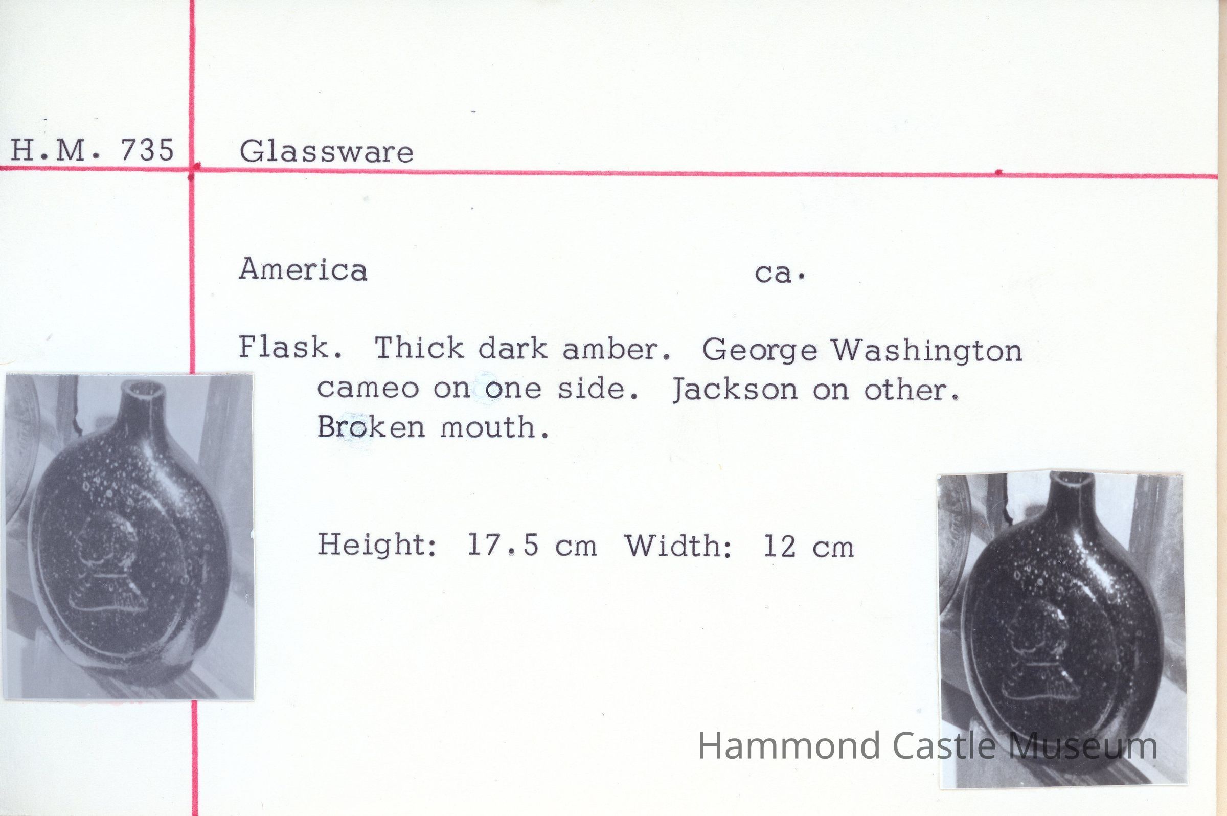 amber pressed glass flask w Washington & Jackson profiles H: 17.5cm W: 12cm Broken mouth Deaccessioned 1991 for Sotherby auction