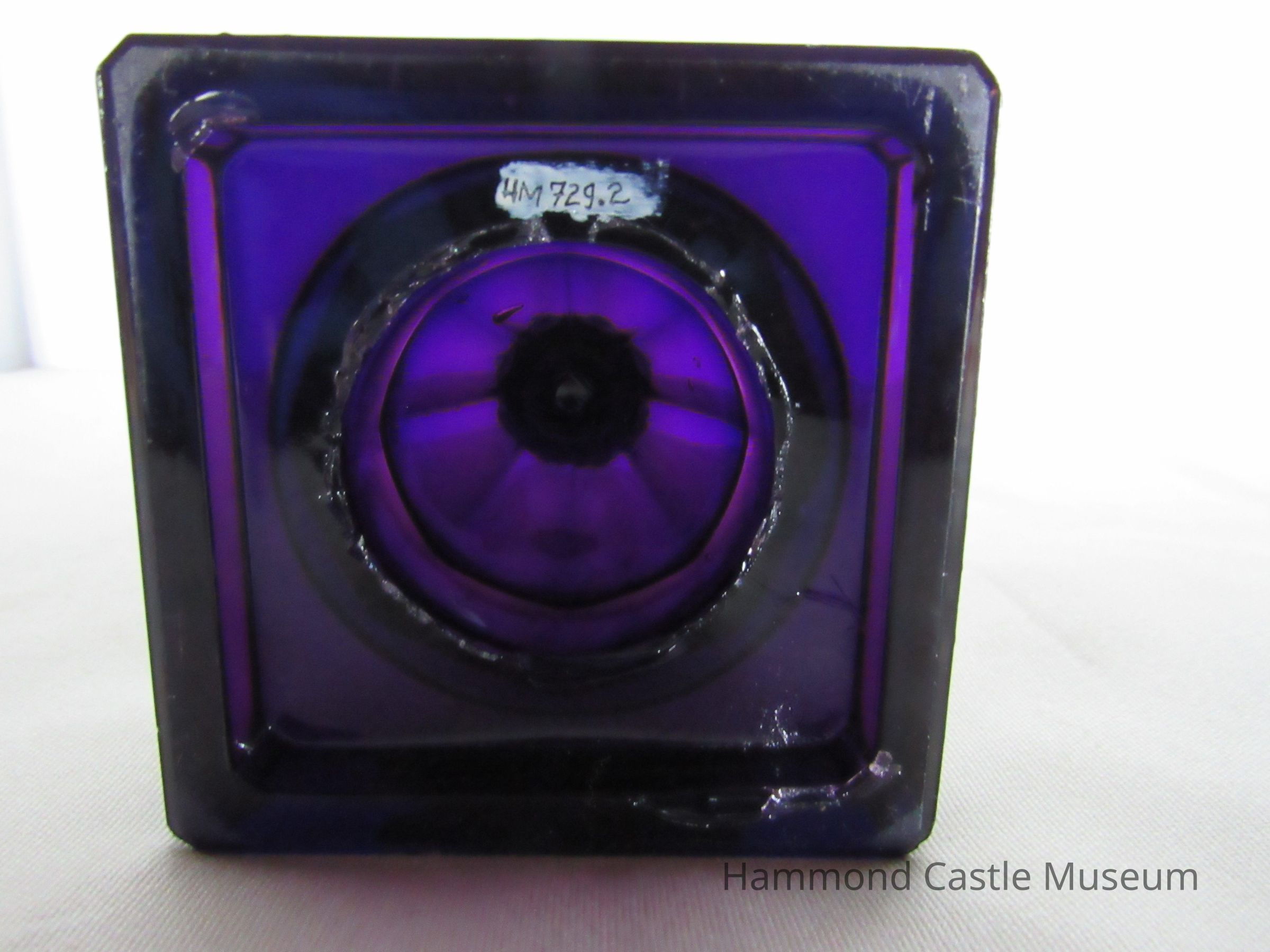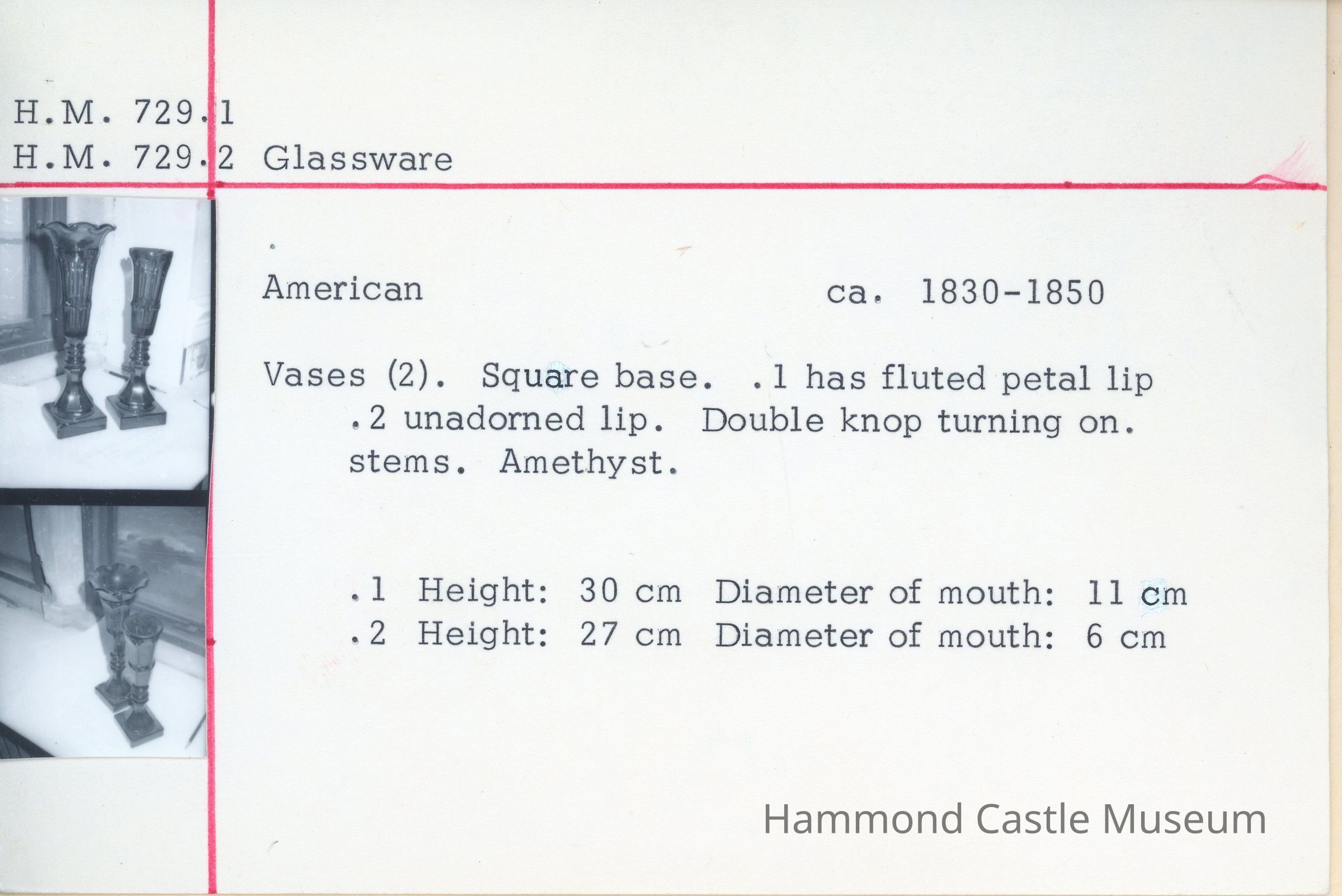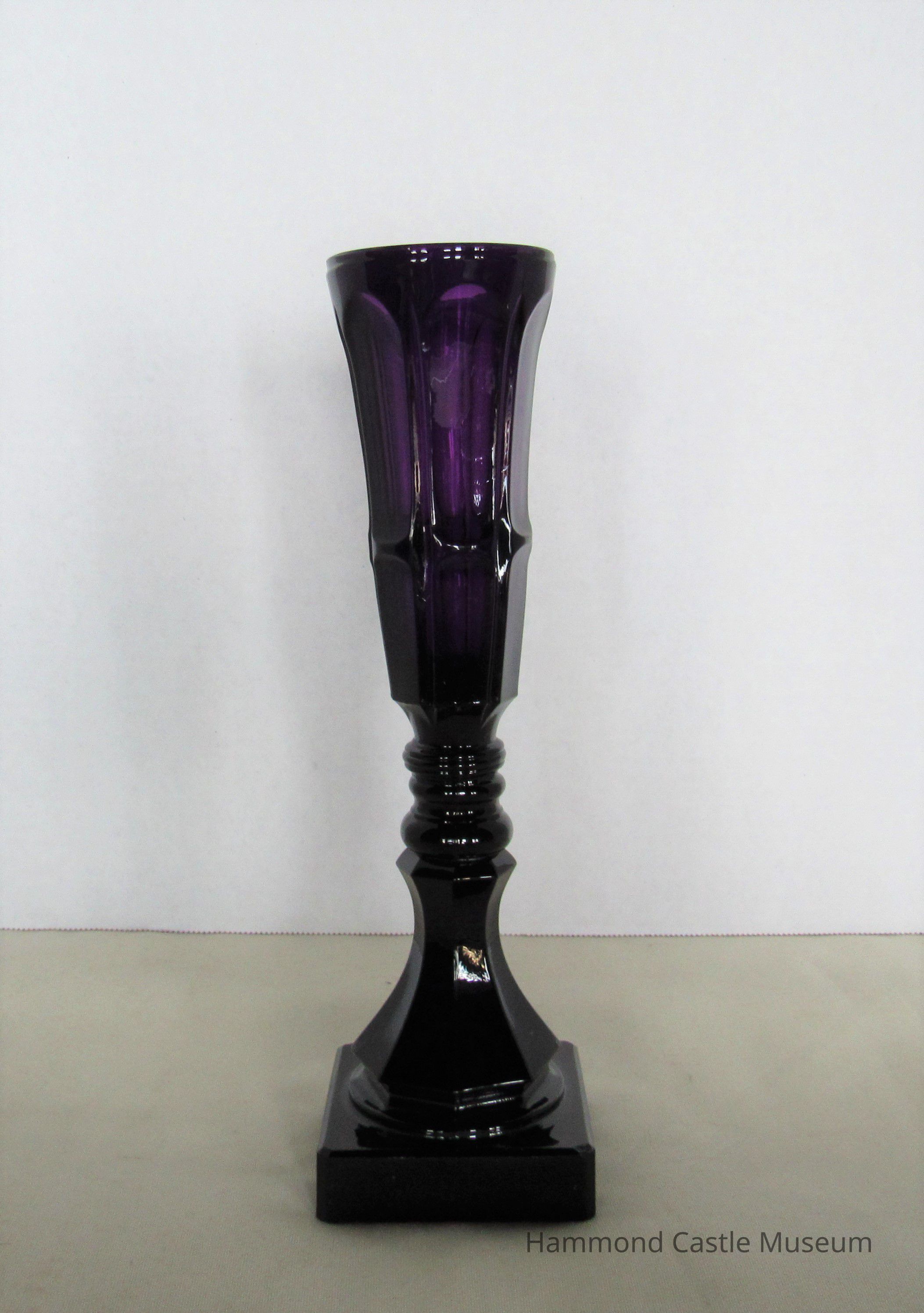 Set of 2 vases. Square base. Double knop turning on stems. Amethyst. Unadorned lip.