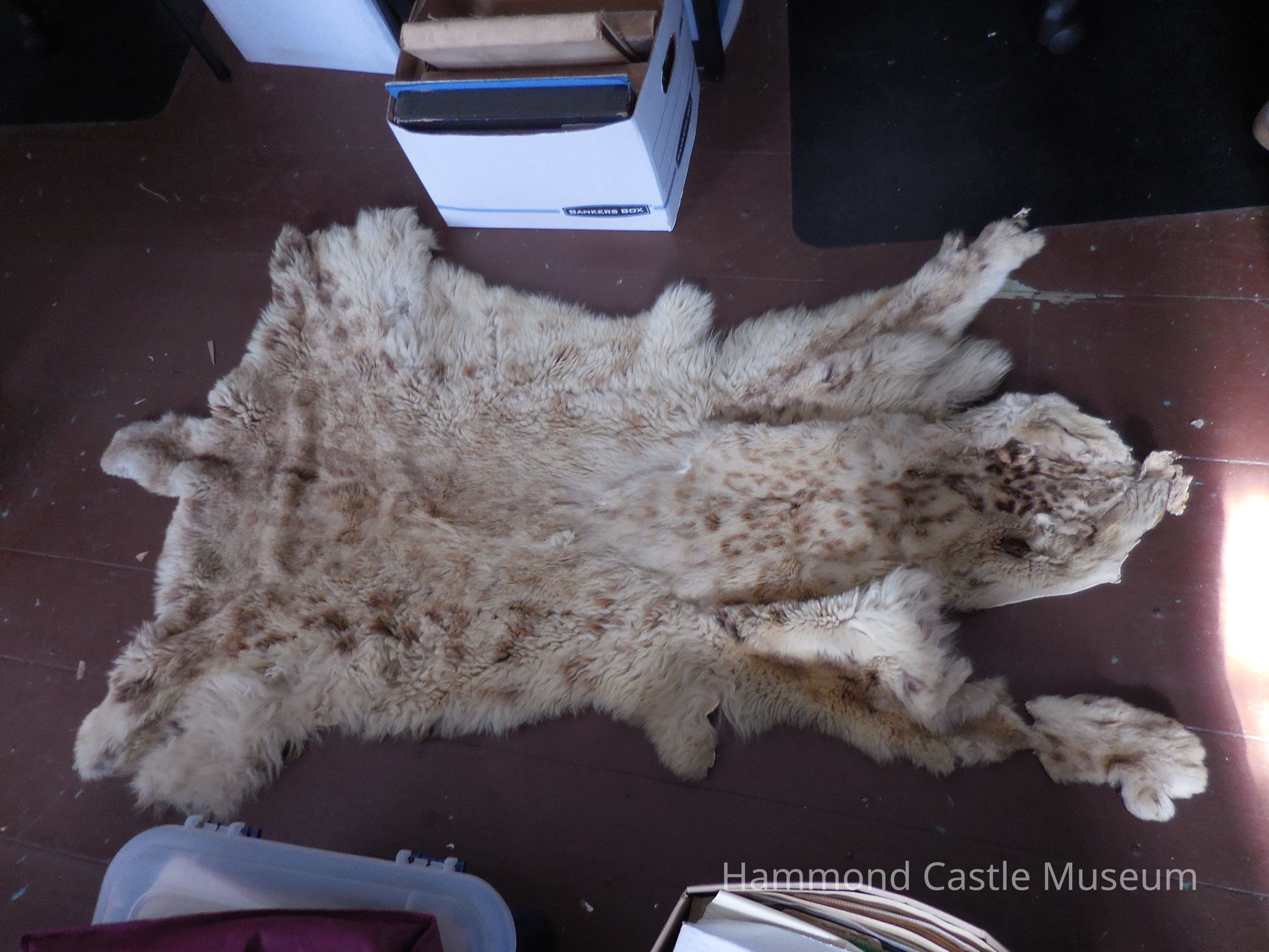 Snow Leopard skin used as throw on furniture. One of a number of animal skins used as rugs and throws throughout the castle and earlier at the bungalow. All except one snow leopard skin missing by 2023.