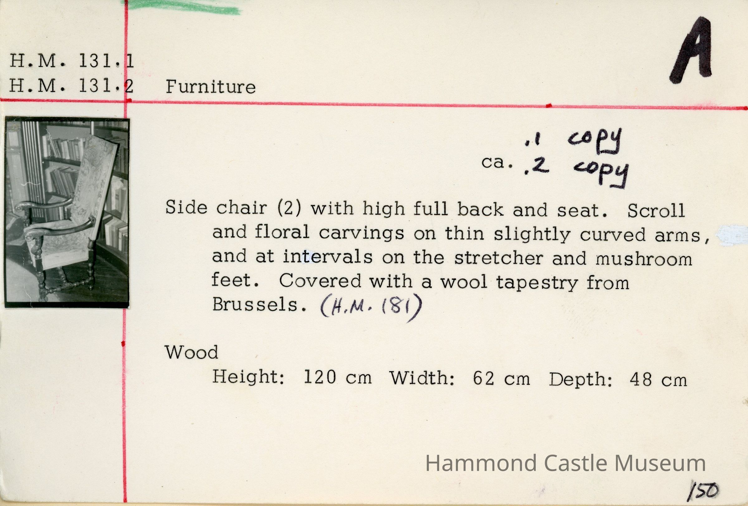 HM131. 1&2 high back wood chairs w HM 181 Brussels tapestry (1983 condition report)