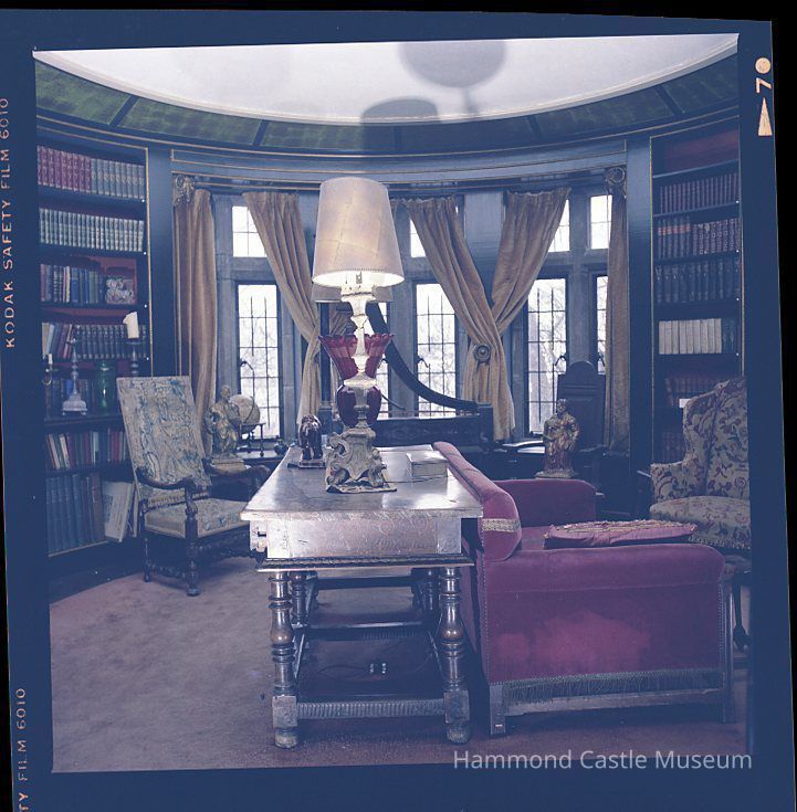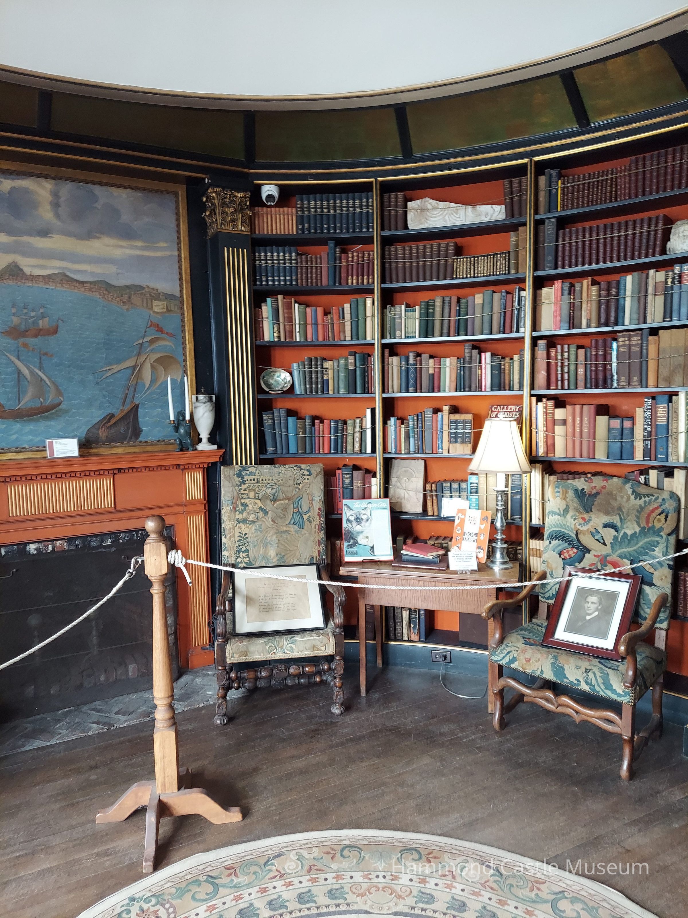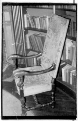 Armchairs with high full back and seat. Scroll and floral carvings on thin slightly curved arms, and at intervals on legs and stretcher, mushroom feet. Covered with a wool tapestry from Brussels. (H.M.181.1&2)