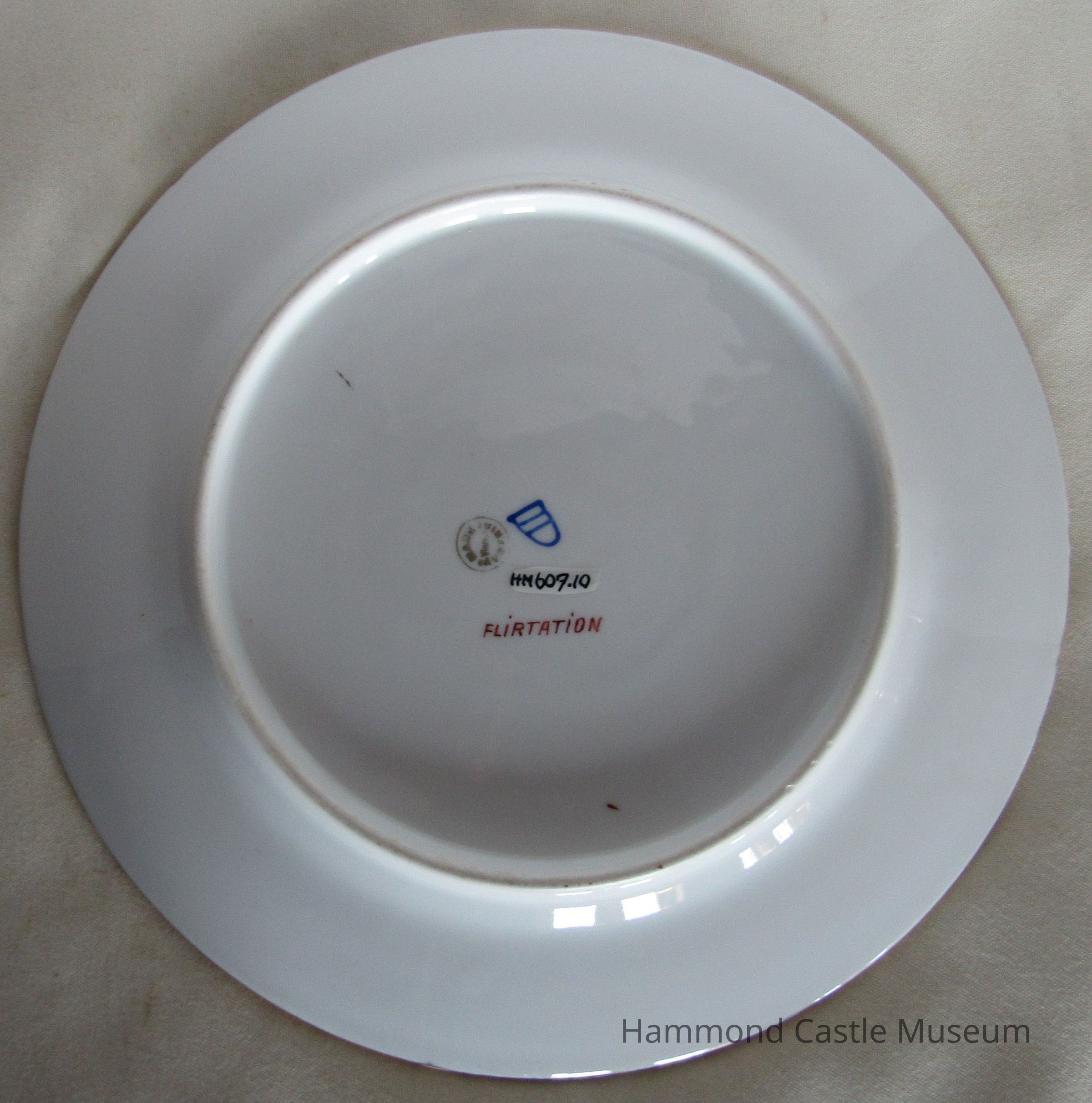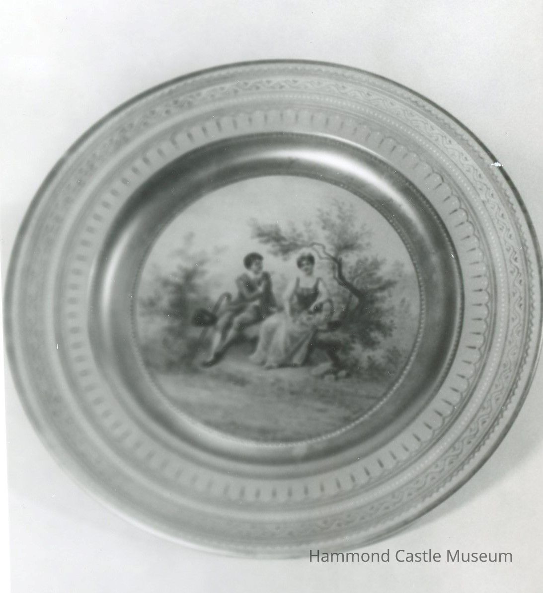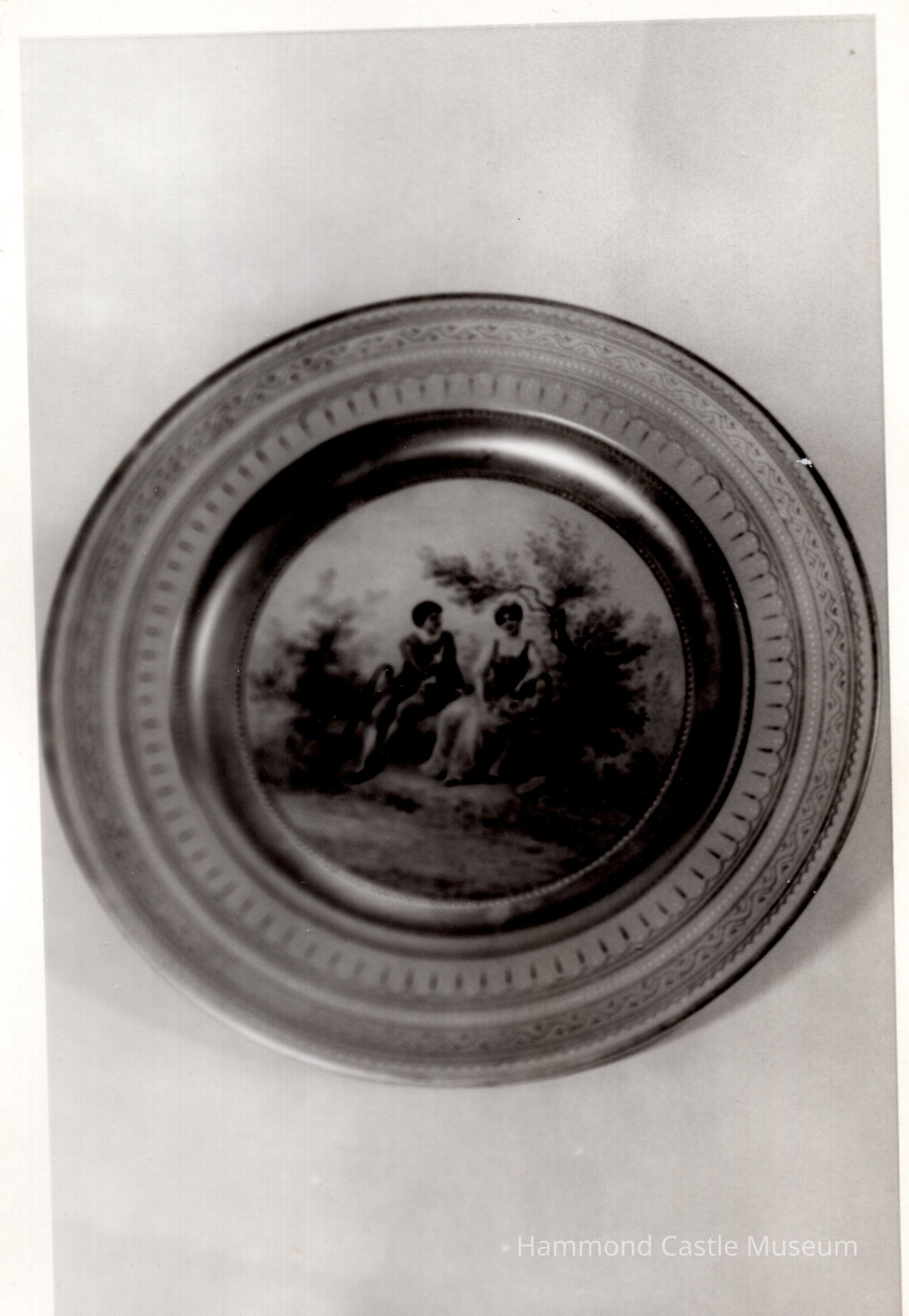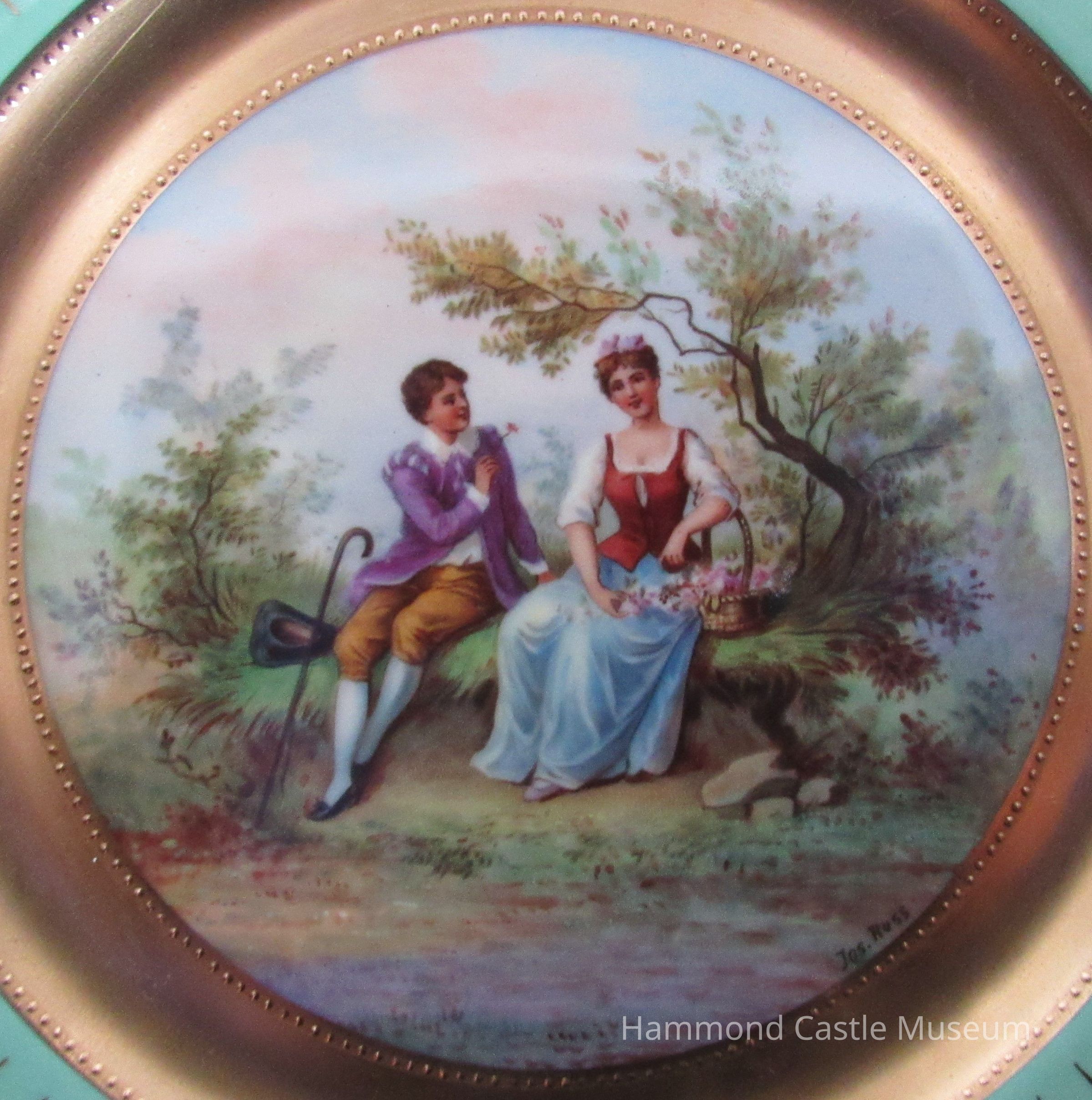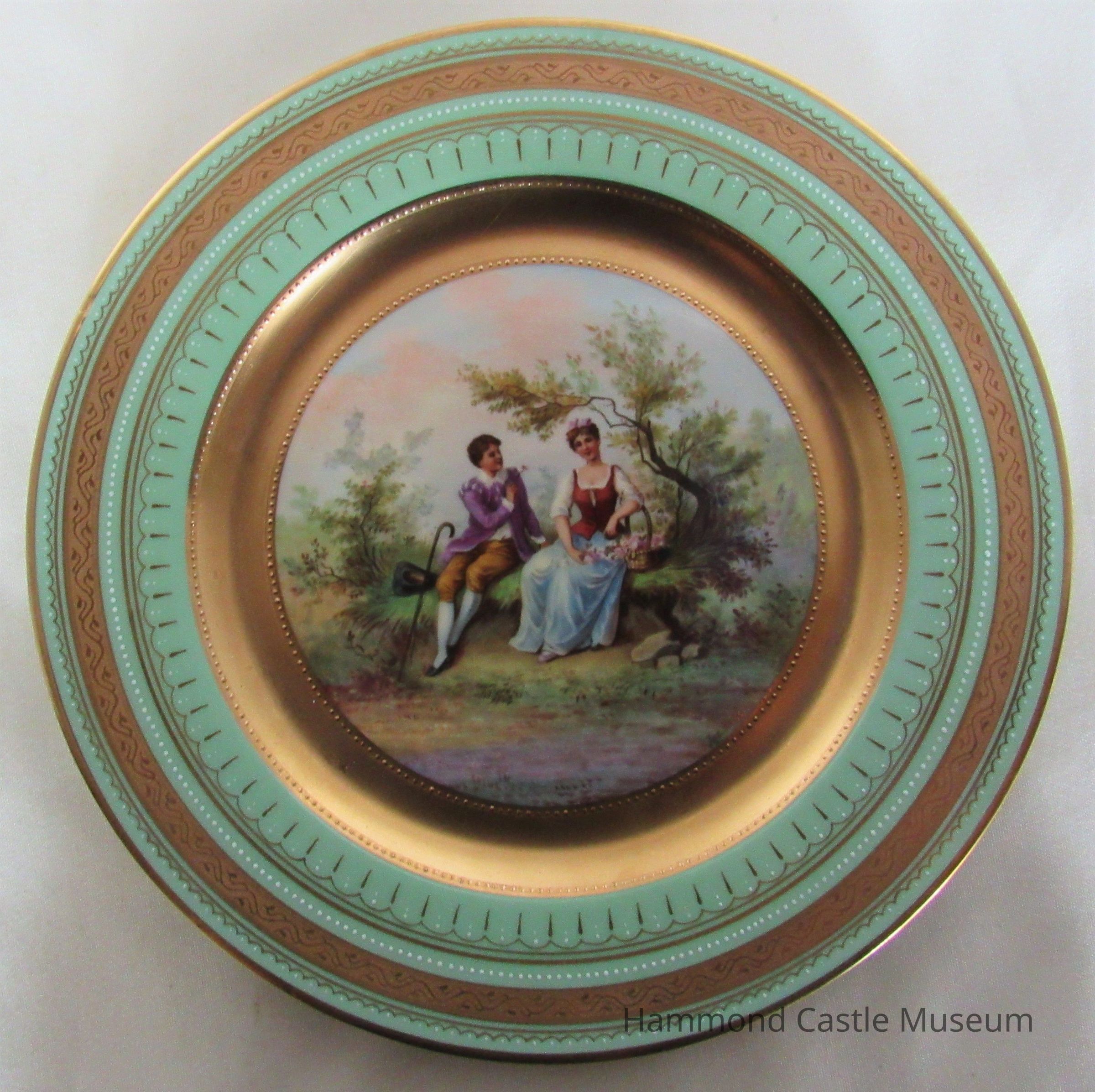 Mid-19th century Austrian hard paste ceramic plate with French rococo hand painted scene. Each plate hand signed. Border of green and gilt. Stamped "Vienna, Austria" with hand painted marking in blue.