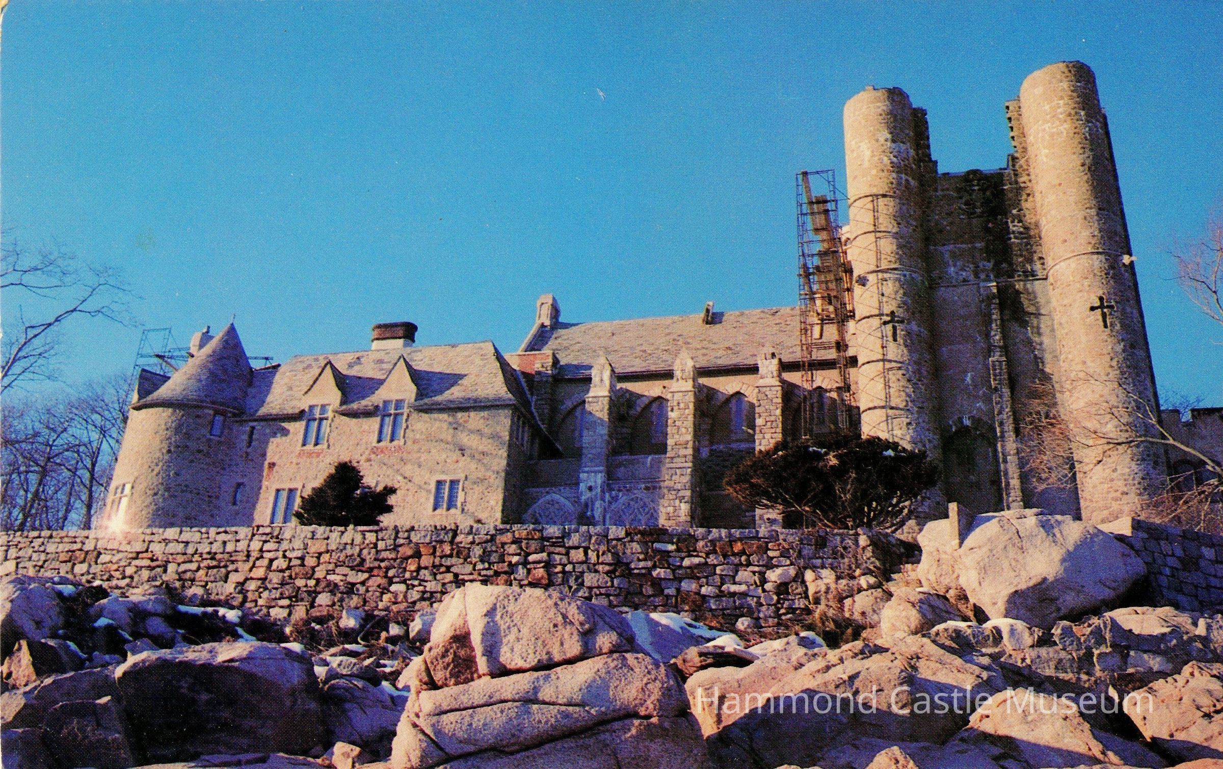 Postcard of ocean side facade from rocks, pre-cliff fencing & bushes, scaffolding up to oriel window Image by Ben Deluca 5 copies PCB-035, 036, 037, 038, 039