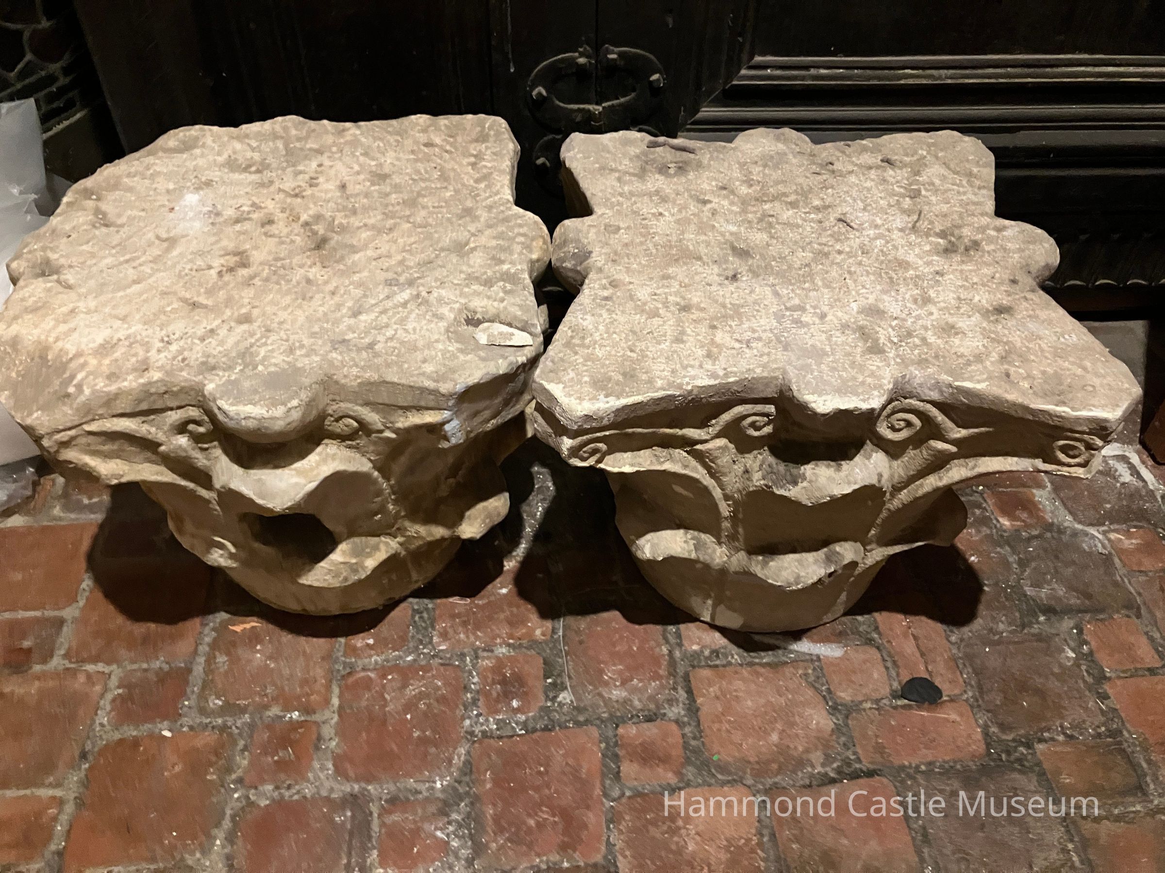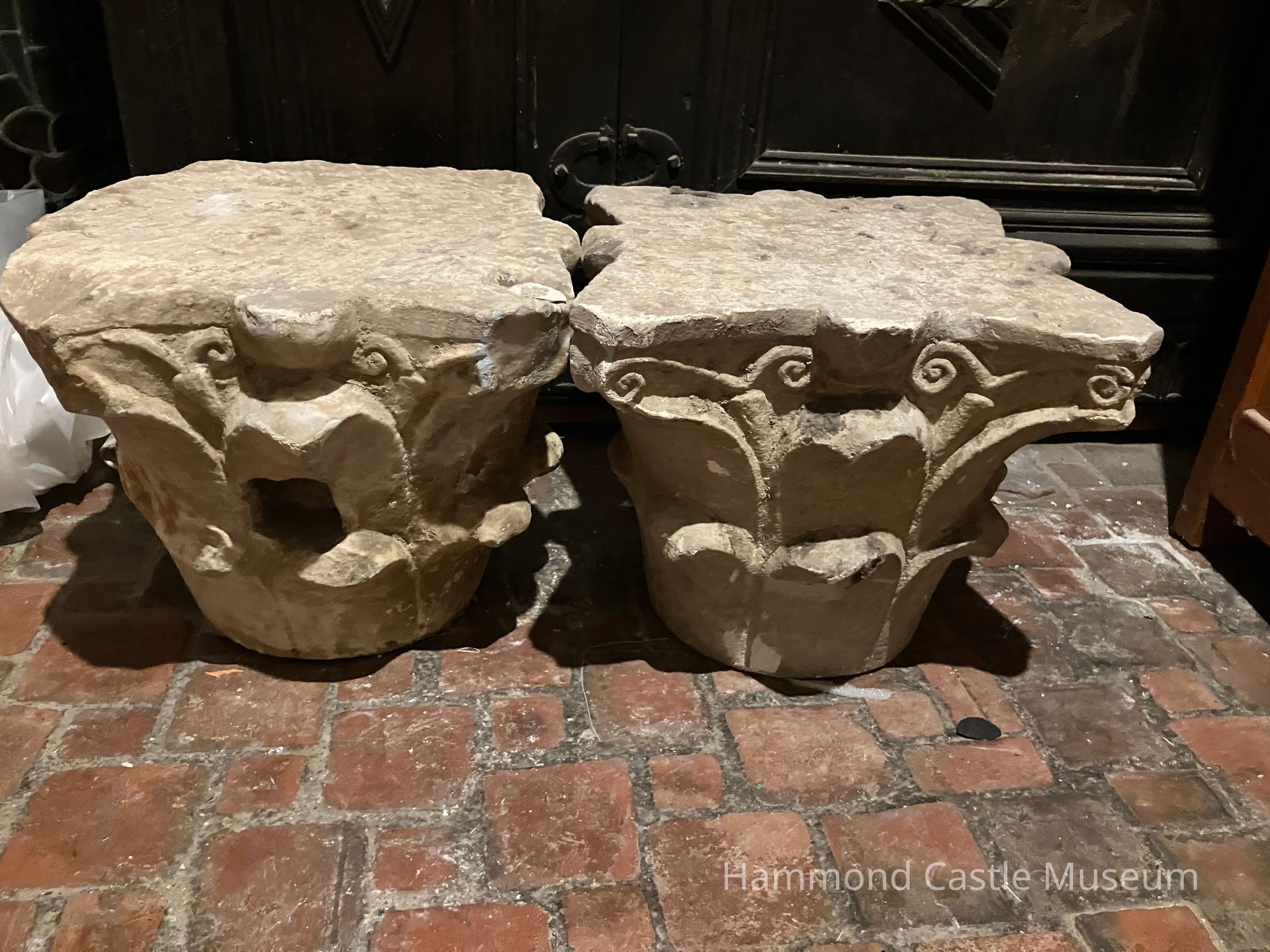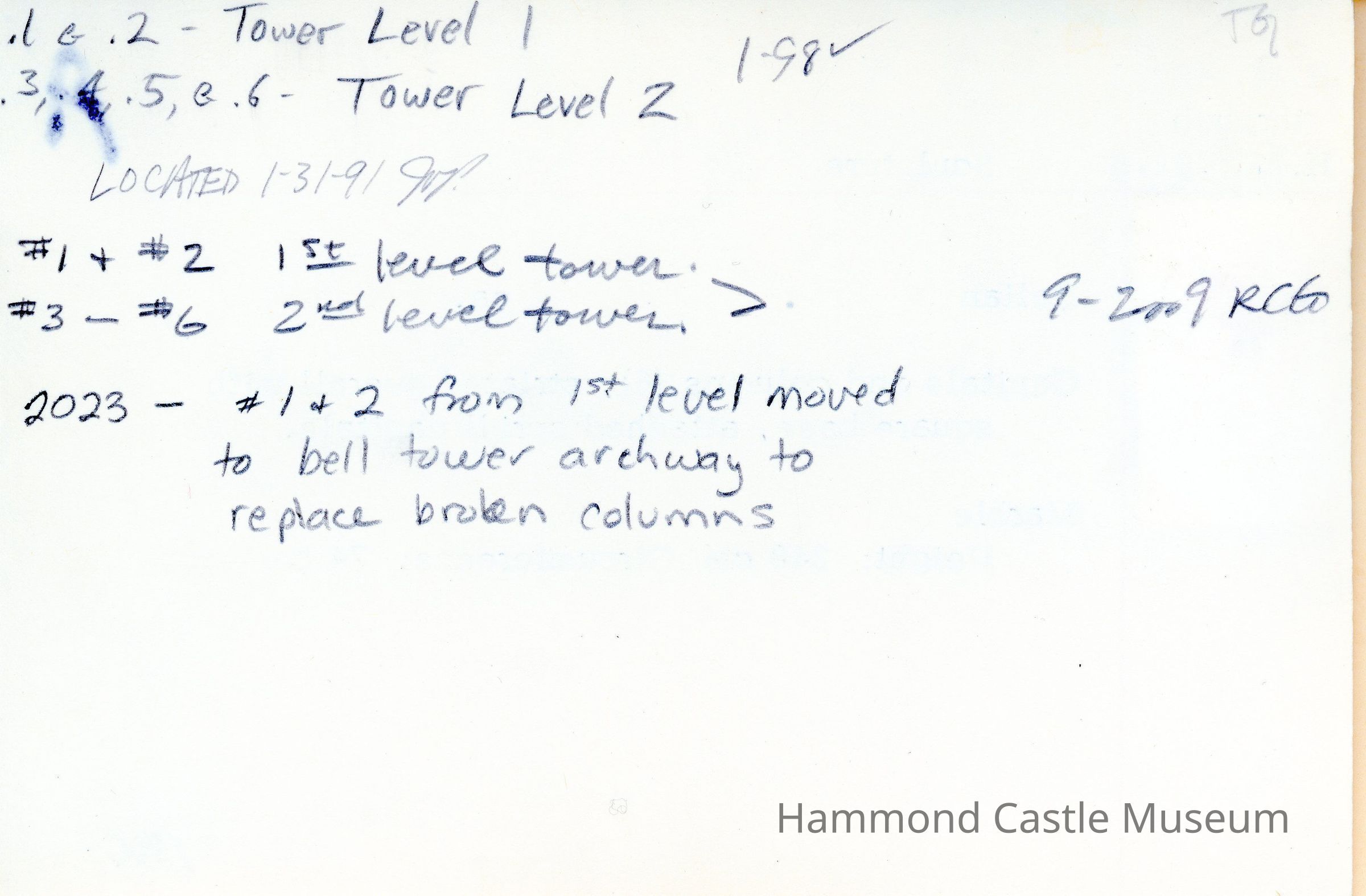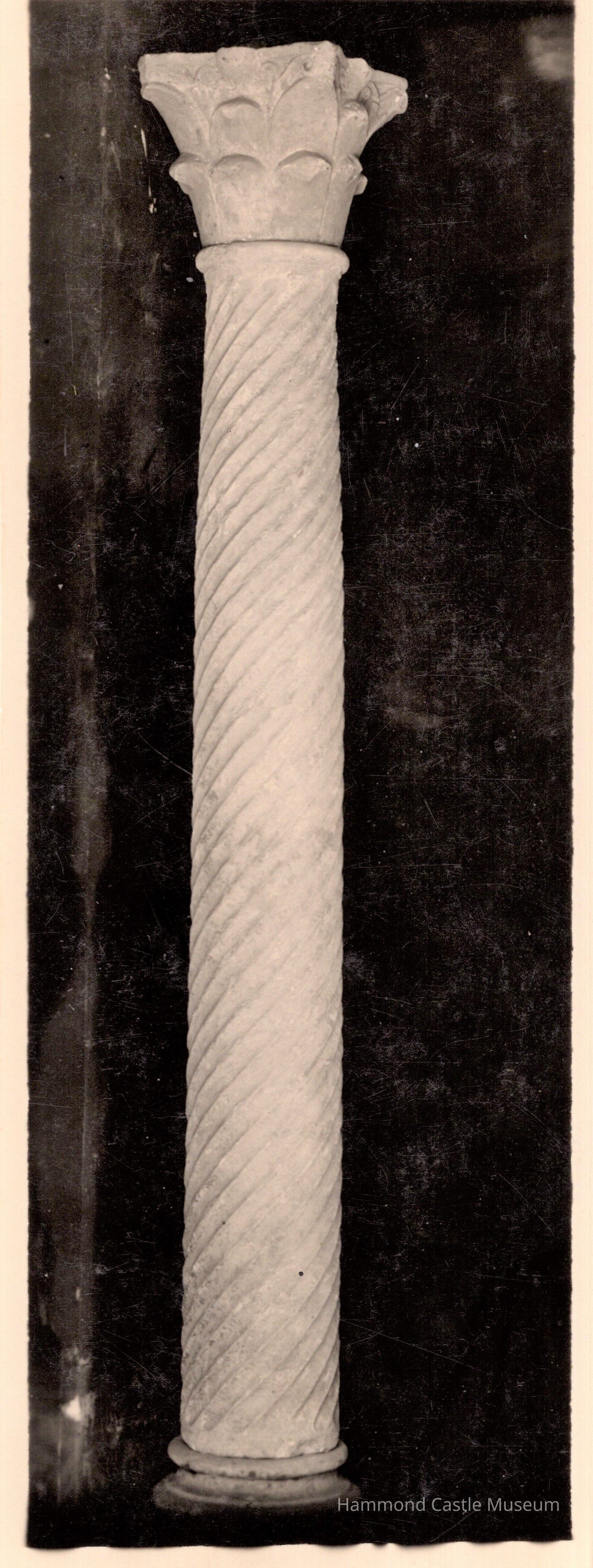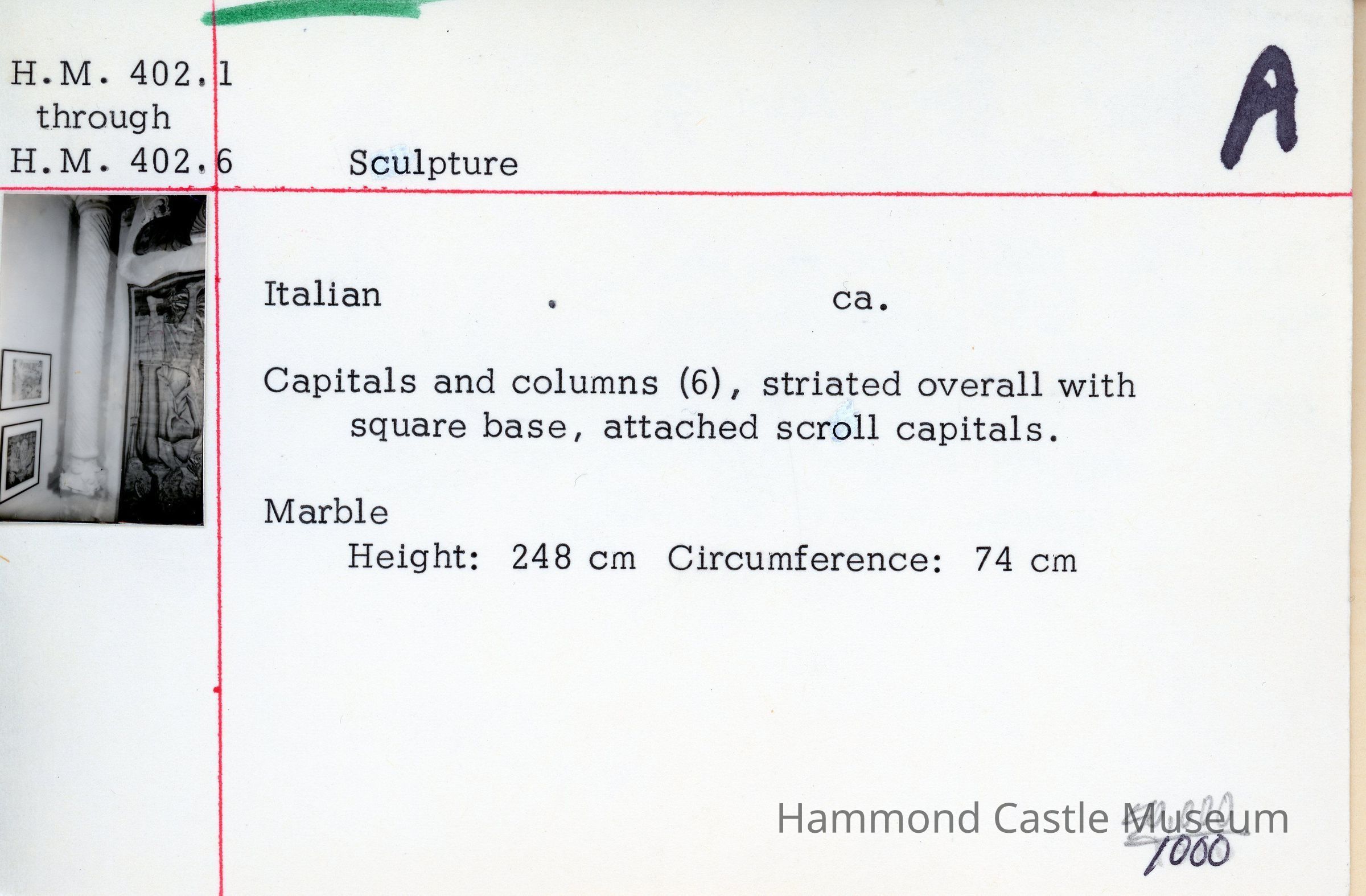 Part of Collection of six capitals and columns, striated overall with square base, attached Corinthian capitals. (#3-6 in 2nd Tower Gallery)