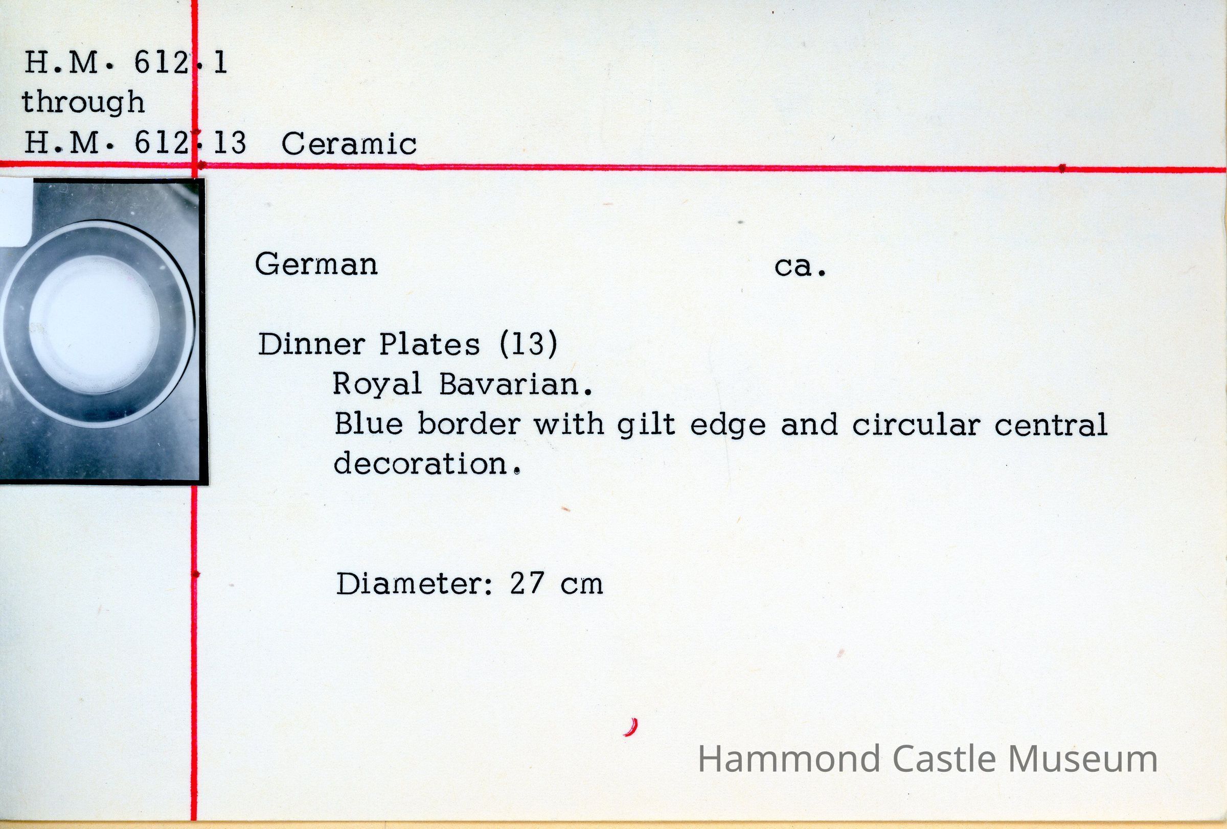 German Royal Bavarian dinner plate. Blue border with gilt edge and circular central decoration. Part of 13 dish set.