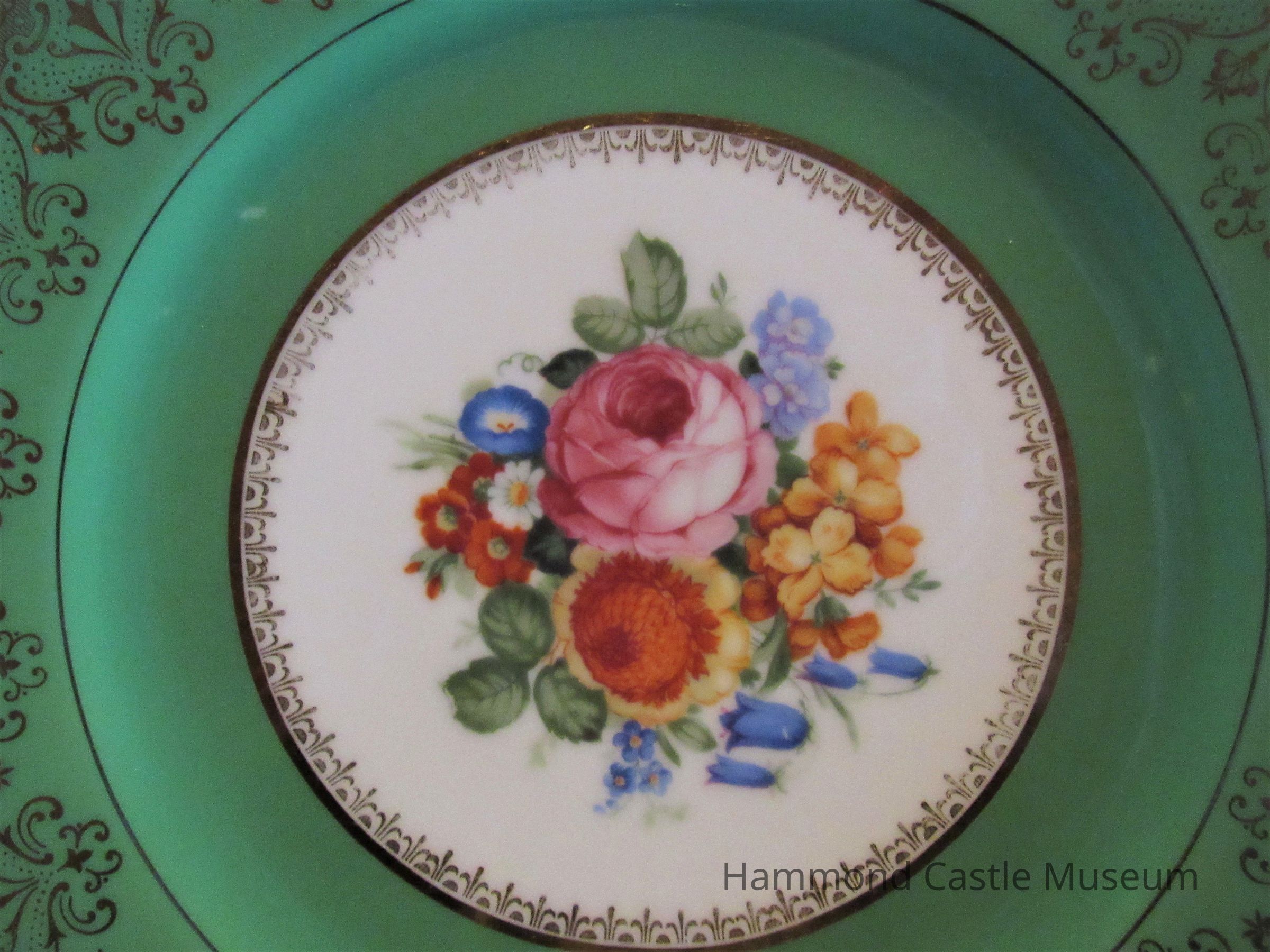 Bavarian Plate with Flower Centers & Green-Gold Rim, 1 of 12