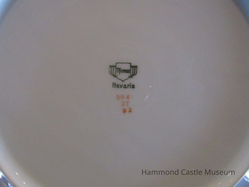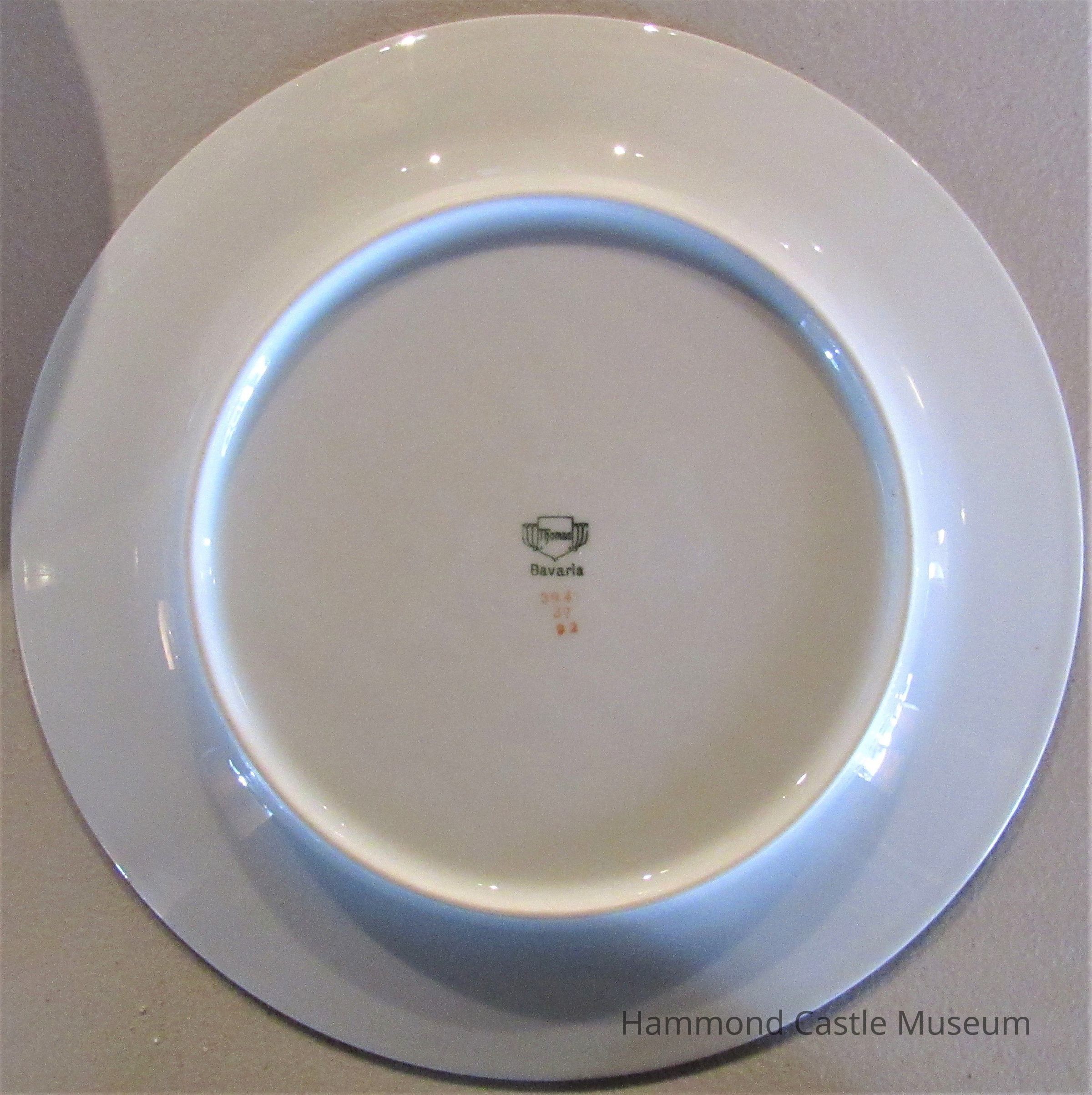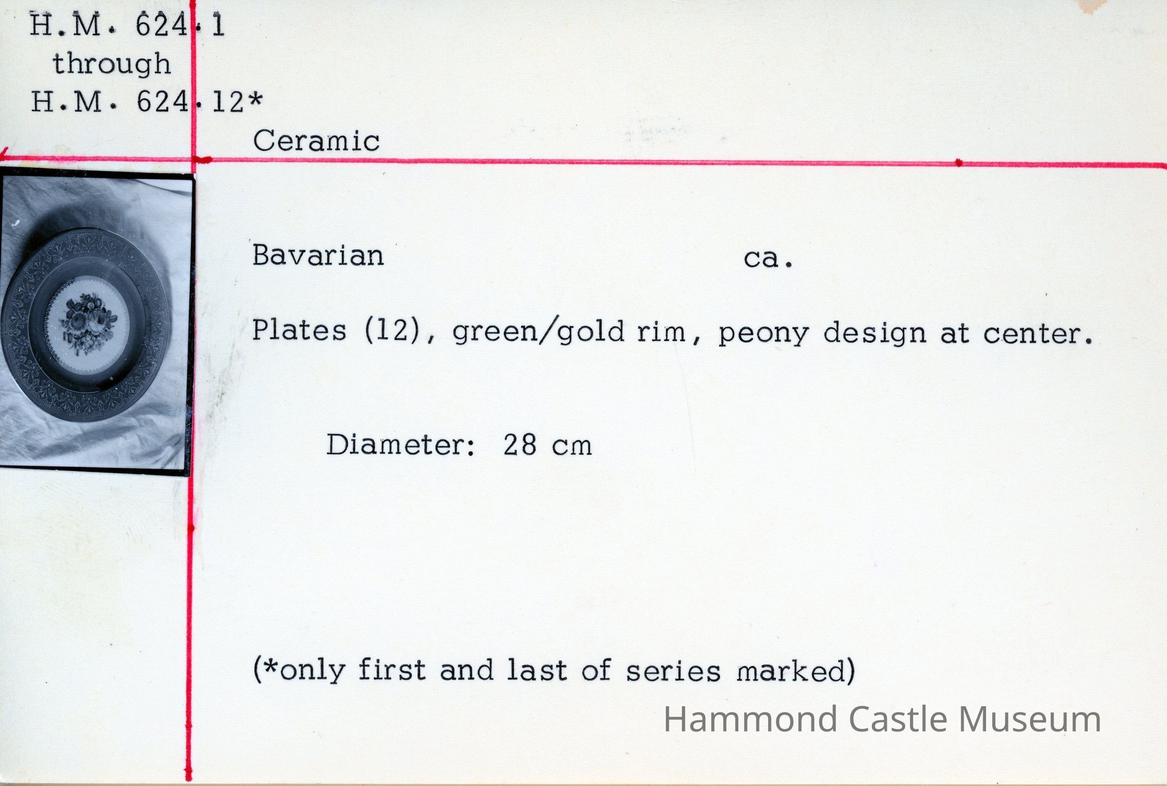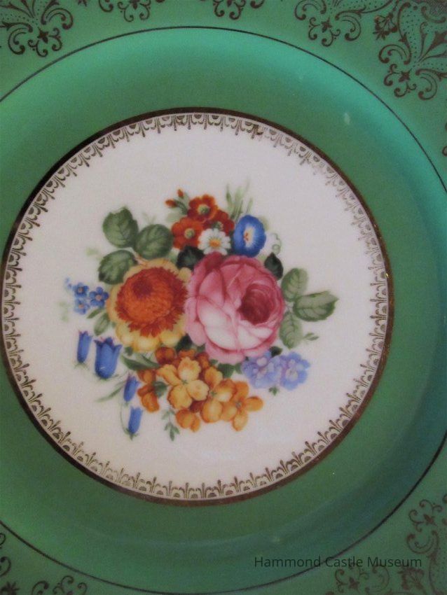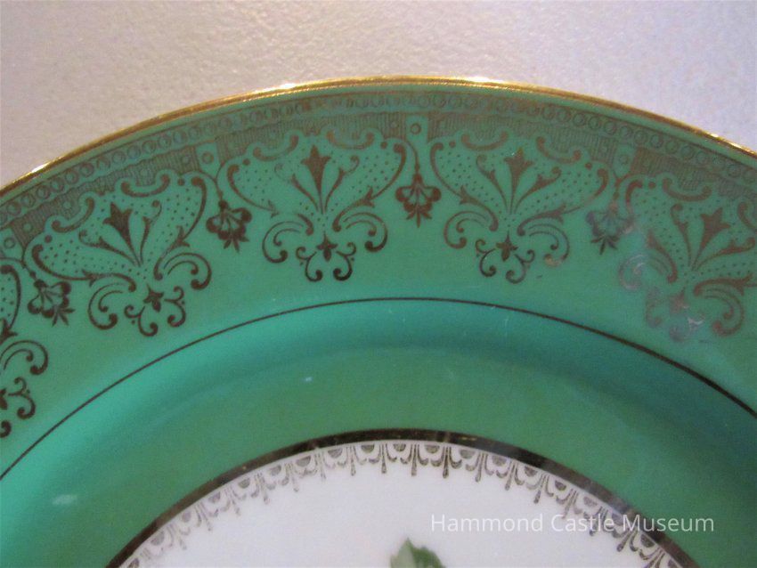 Bavarian ceramic plates. Green/gold rim, peony design at center. Only first and last of series are marked.