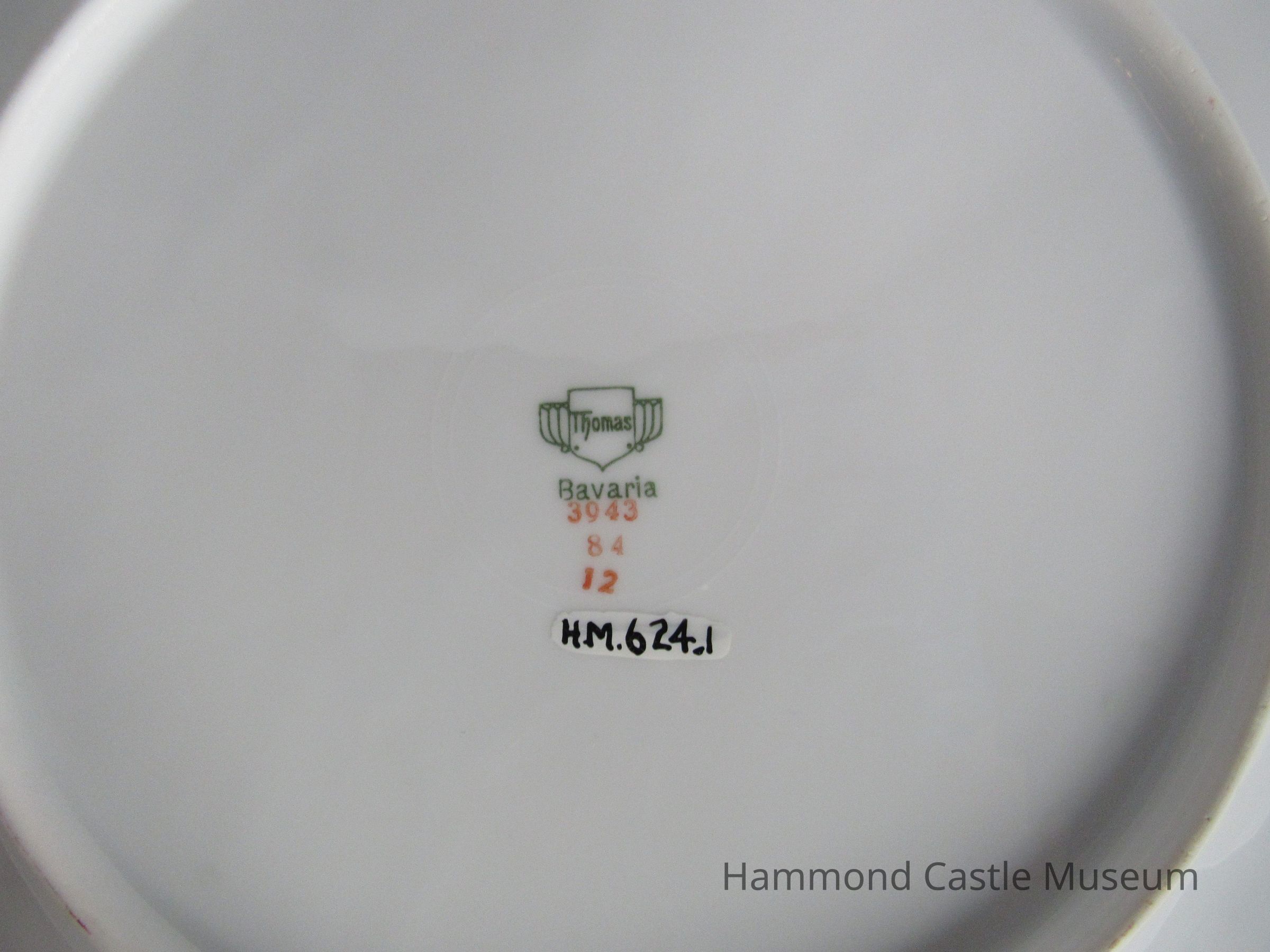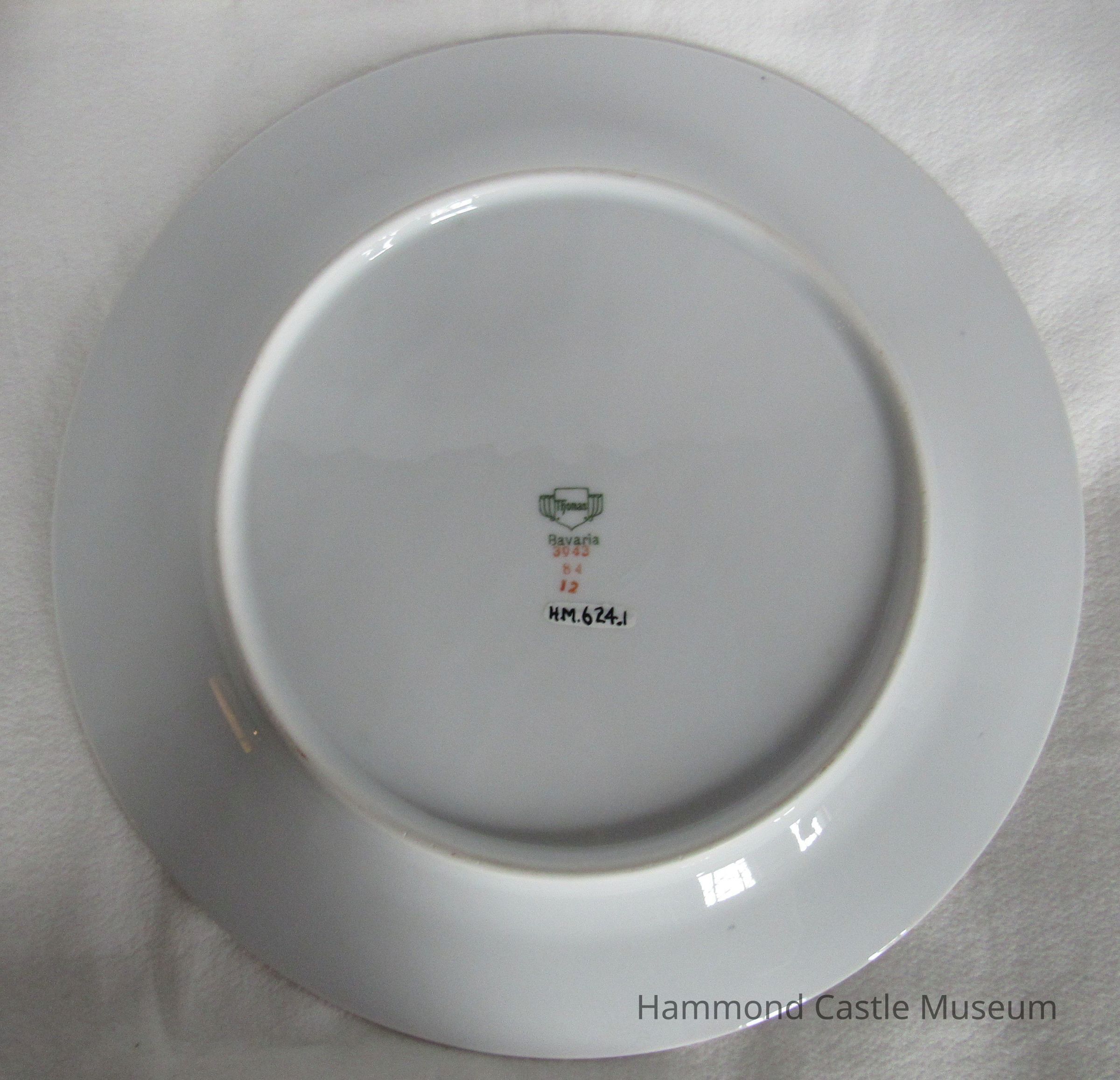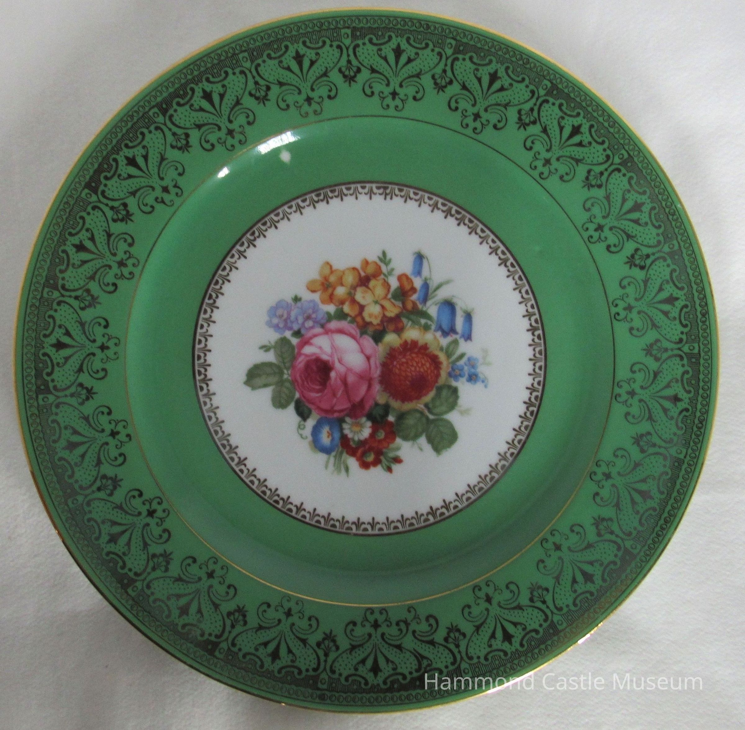 Bavarian ceramic plates. Green/gold rim, peony design at center. Only first and last of series are marked.