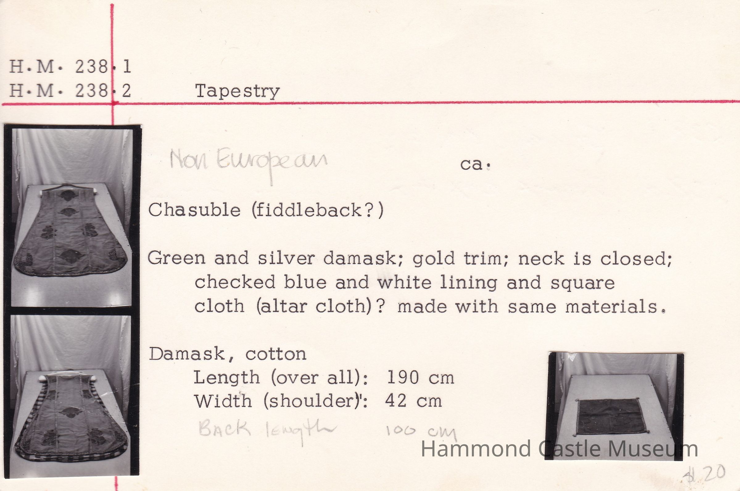 #1 Chasuble, possibly fiddleback. Green and silver damask, gold trim, neck is closed, checked blue and white lining #2 square cloth made with same materials.