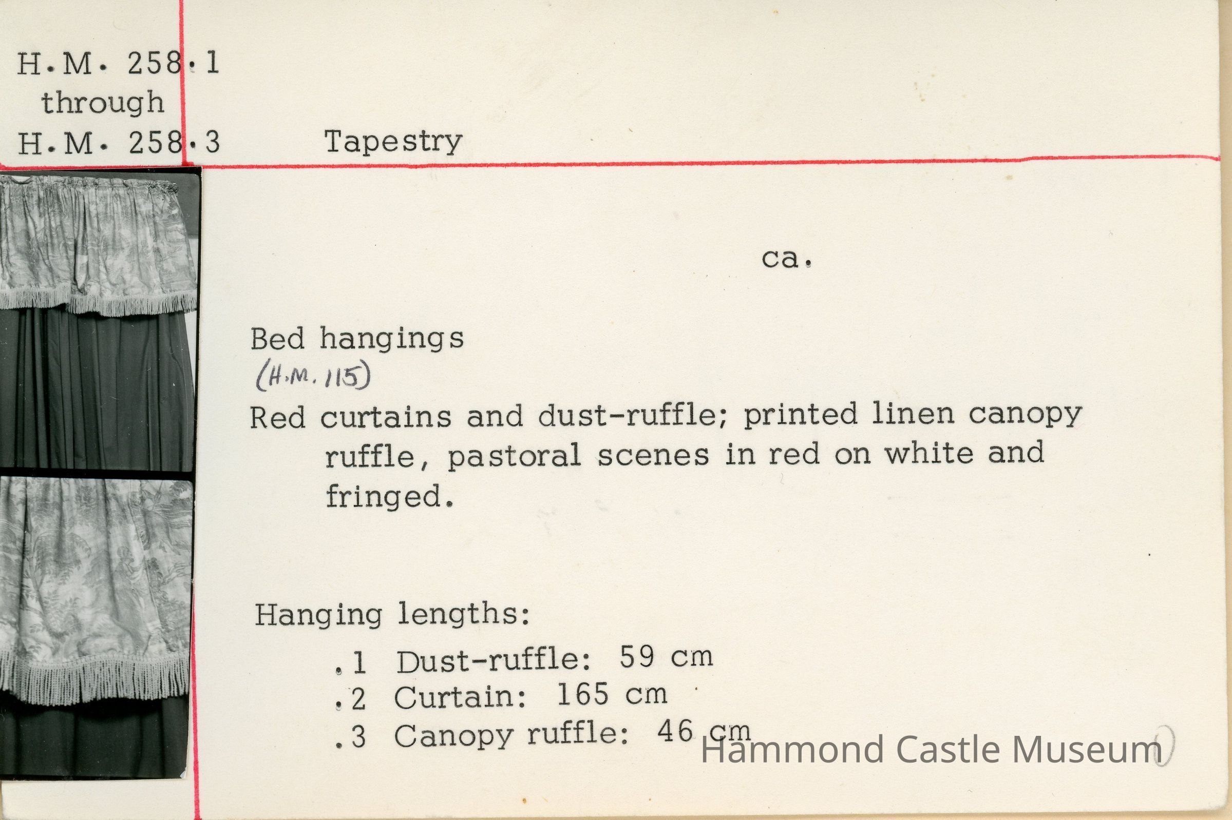 Bed hangings for HM115 bed. Red curtains and dust-ruffle; printed linen canopy ruffle, pastoral scenes in red on white and fringed.