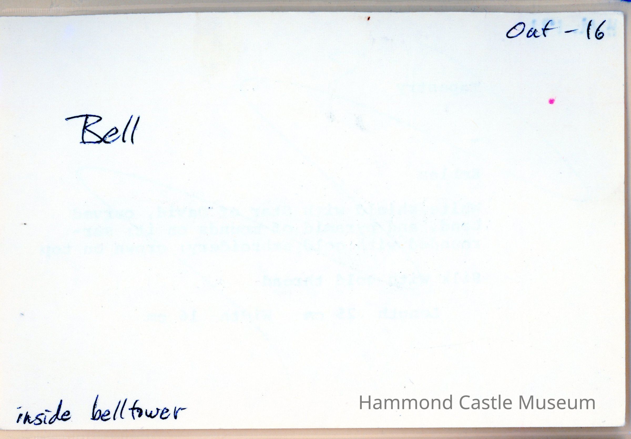 Large cast bell in bell tower Caste in 1860 Cast steel Inscribed - Naylor Vickers & Co. 1860 Sheffield (England) E. Riepe’s Patent No. 2 1409 Roughly 4,200 lbs Reportedly previously set up with mechanism to strike on the hours